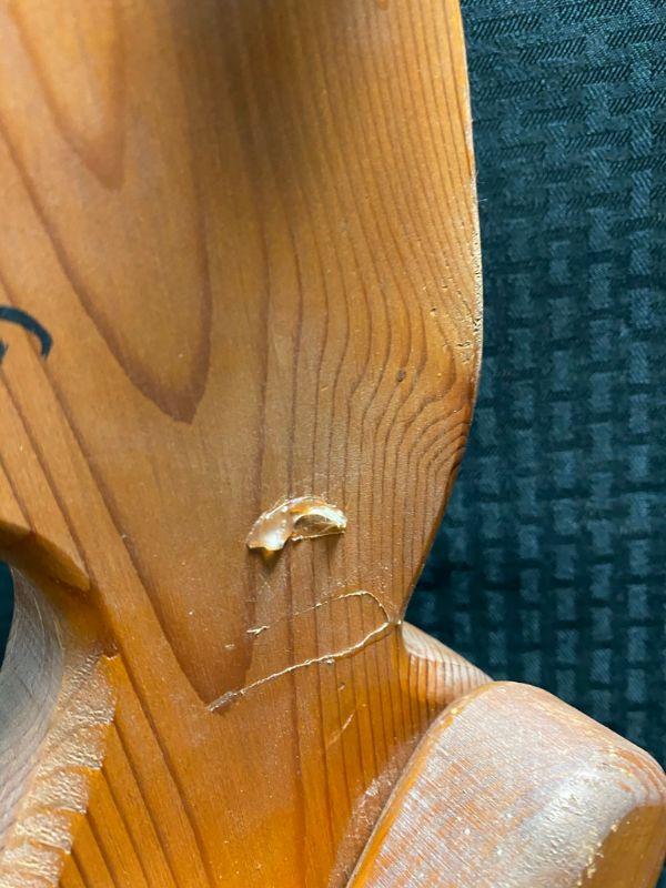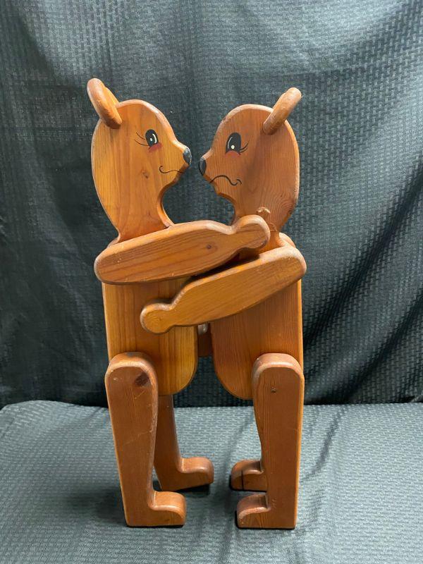 Pair of wood articulated bears. Arms and legs move, allowing them to sit, stand, and even hug each other. Painted to look like a boy and girl. Small heart painted on the left side of each. Probably about 24" tall. There looks to be old glue on the side of each ones neck, could probably be removed.