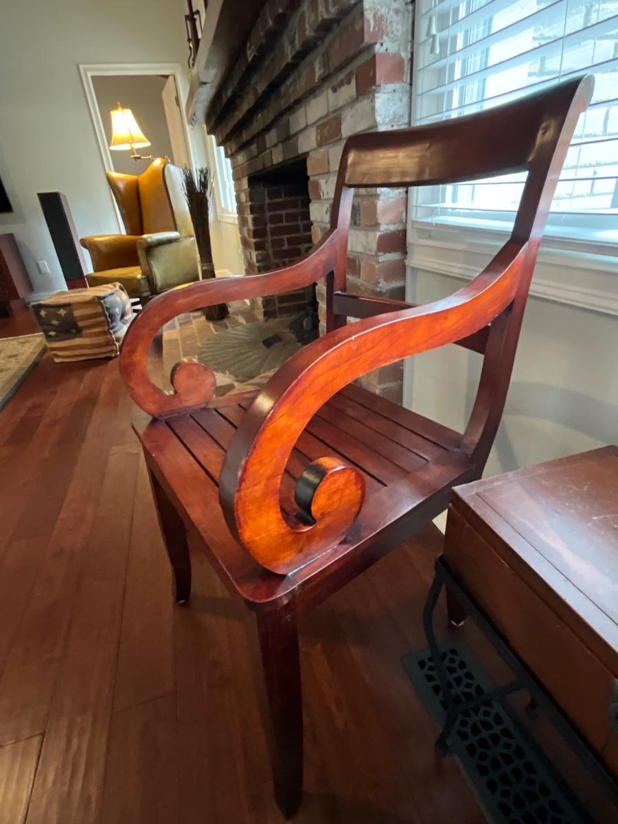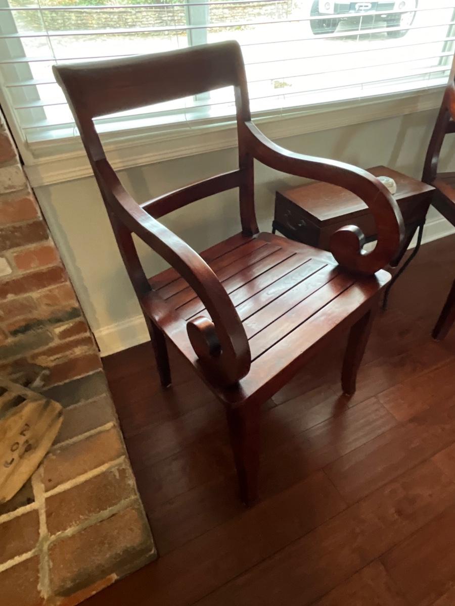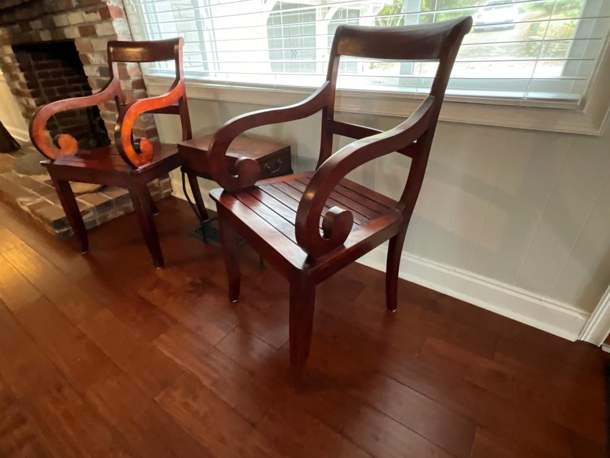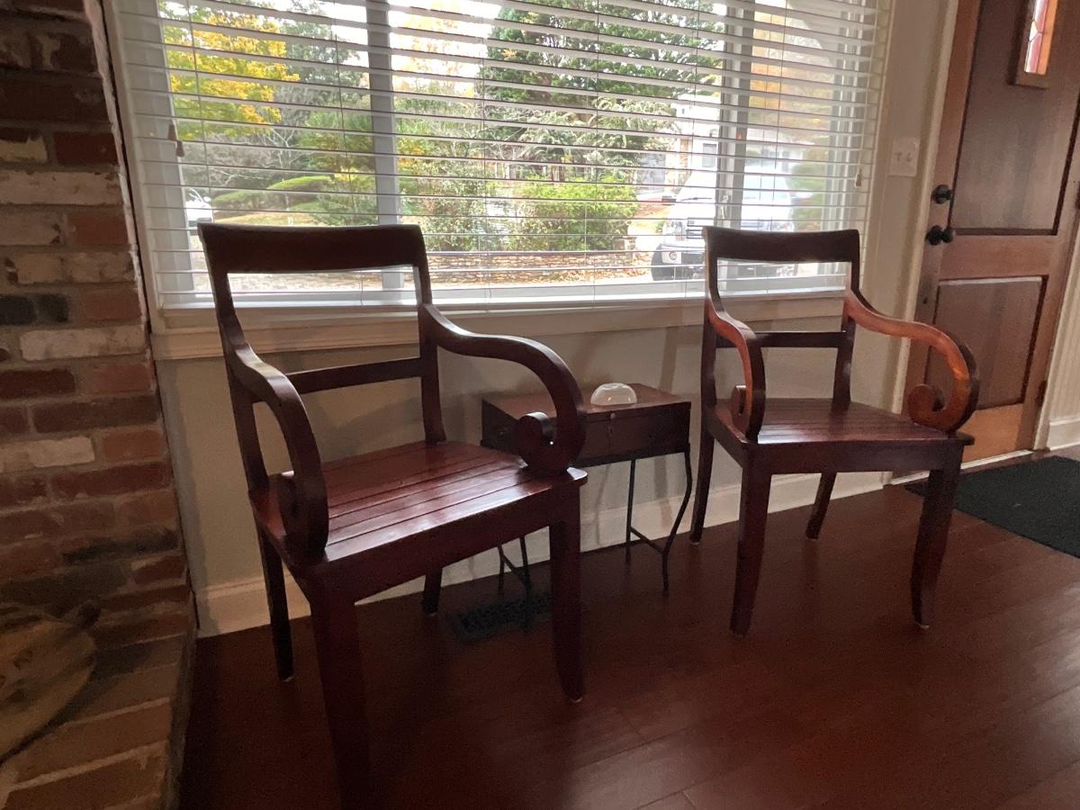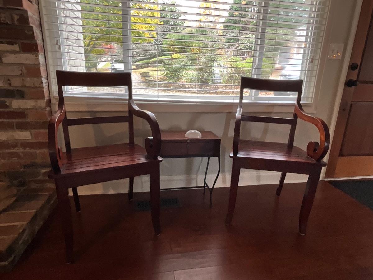 Pair of wood Accent chairs. 22 inches wide 21 inches deep, 37 inches tall. Seat depth 16 inches, seat with 17 inches 19 inches from the floor of the seat.