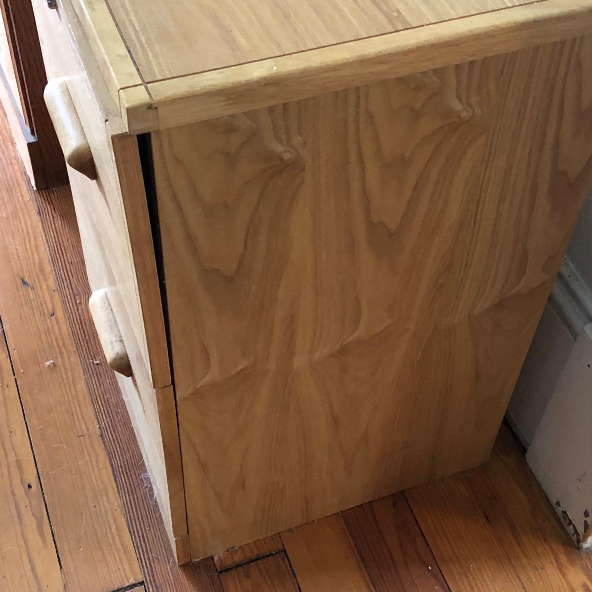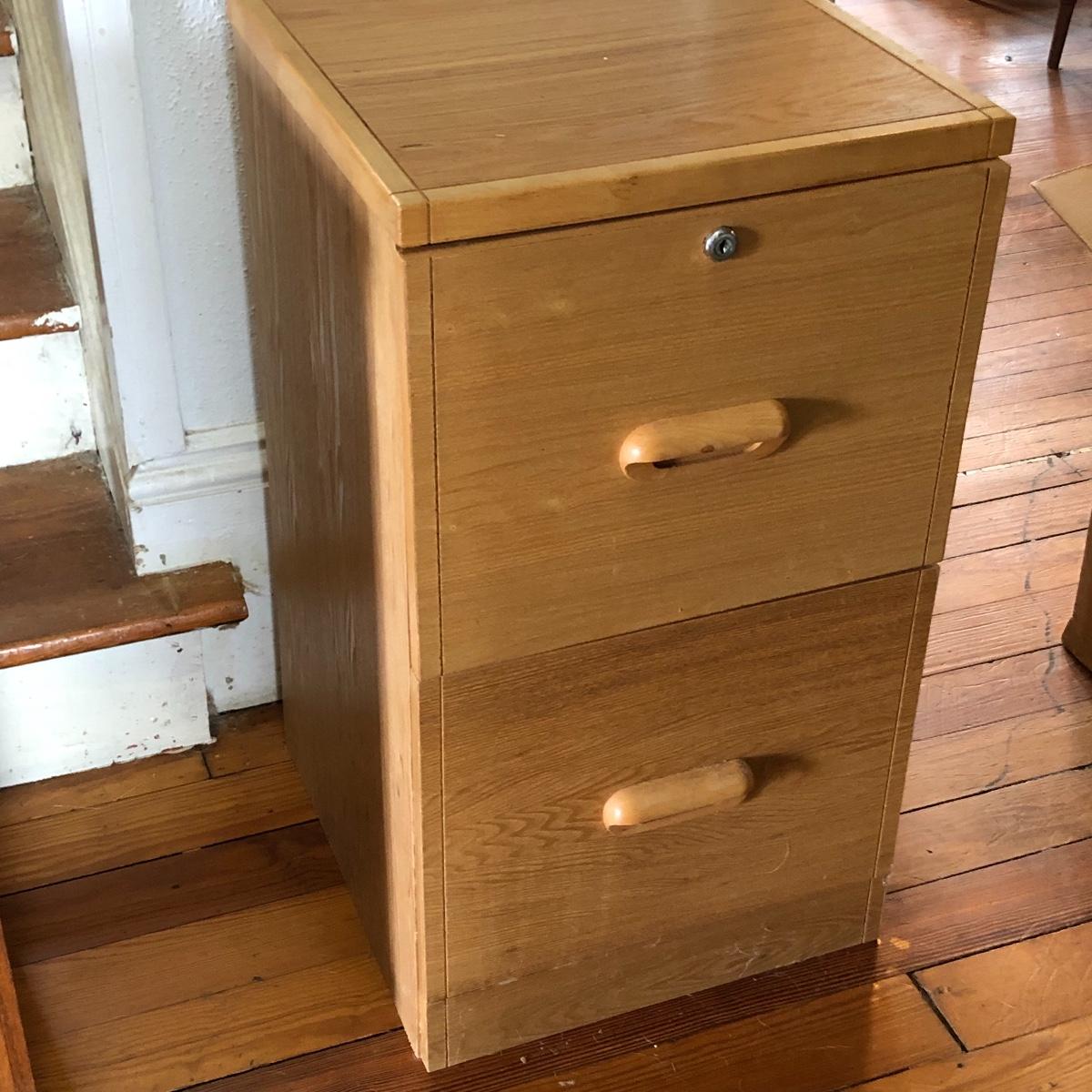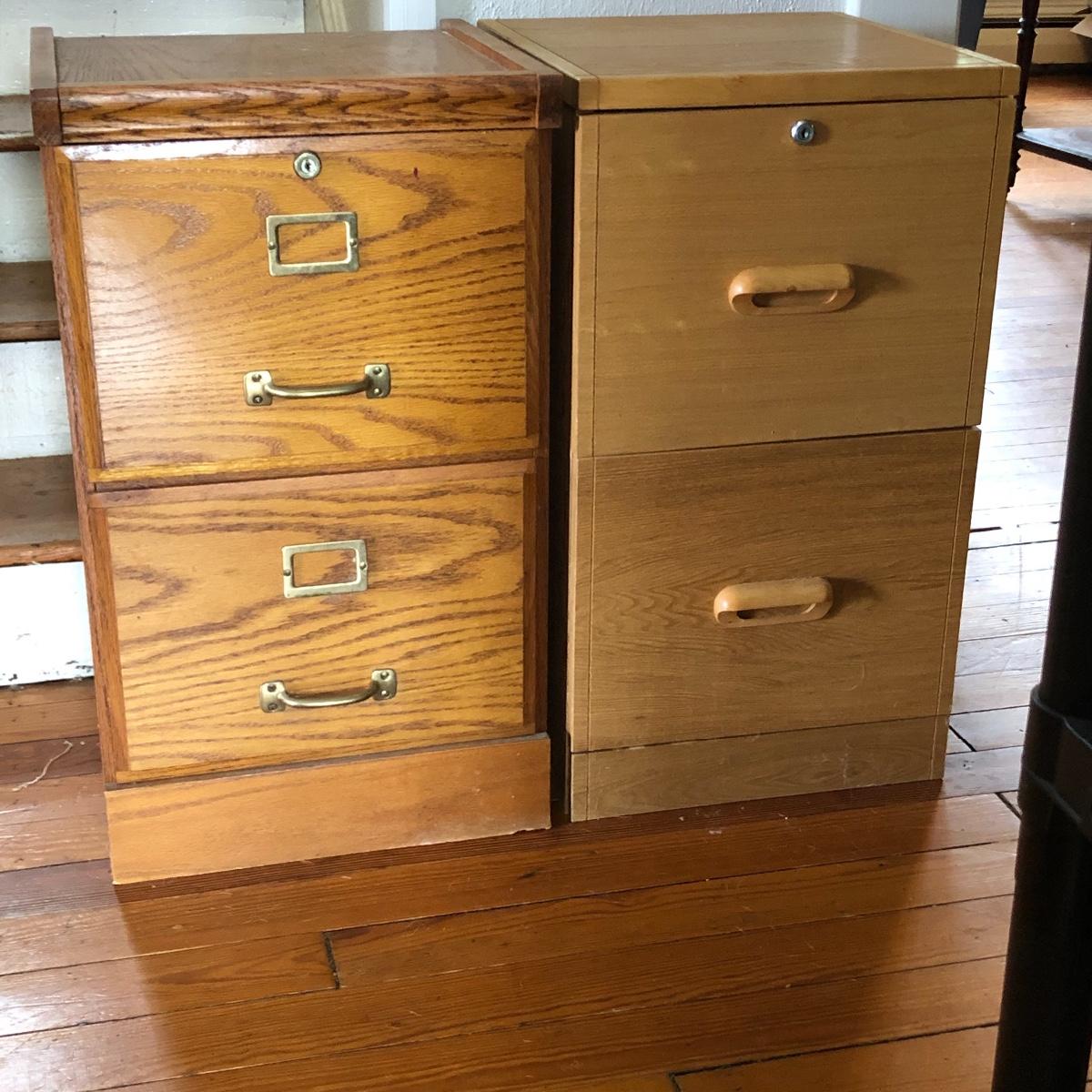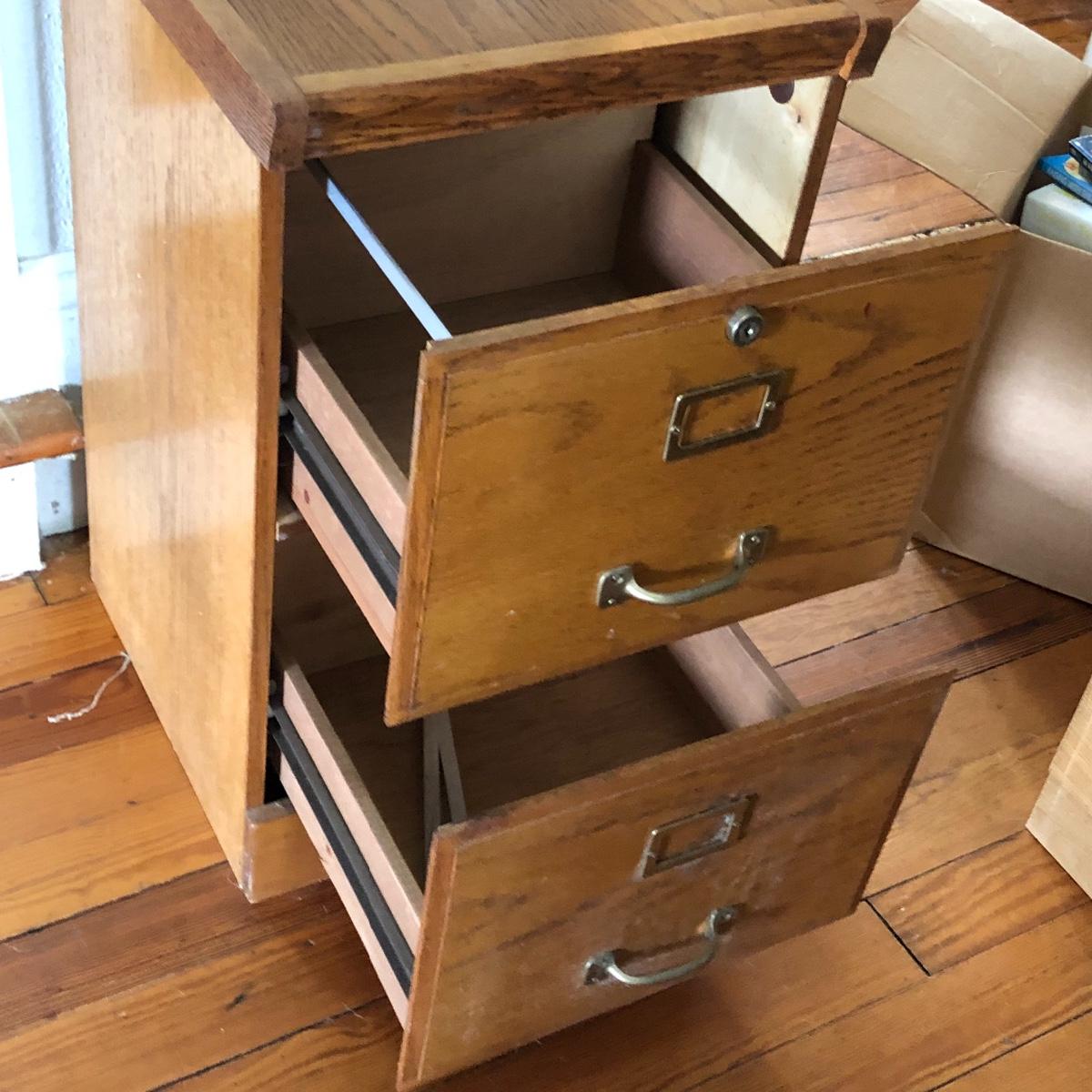 Two pressed wood filing cabinets here with a couple of rails needing to be reinstalled. Neither unit has its key.
