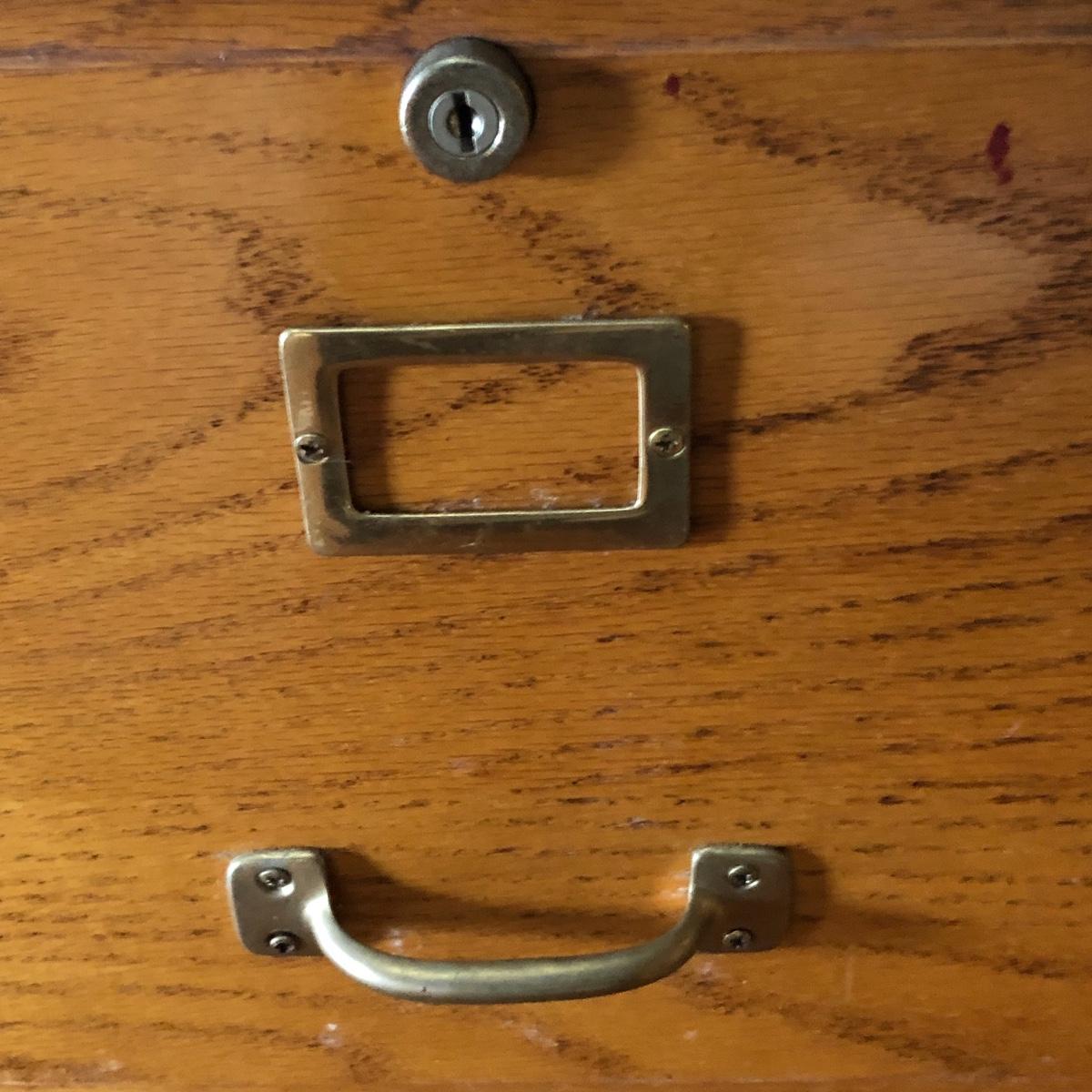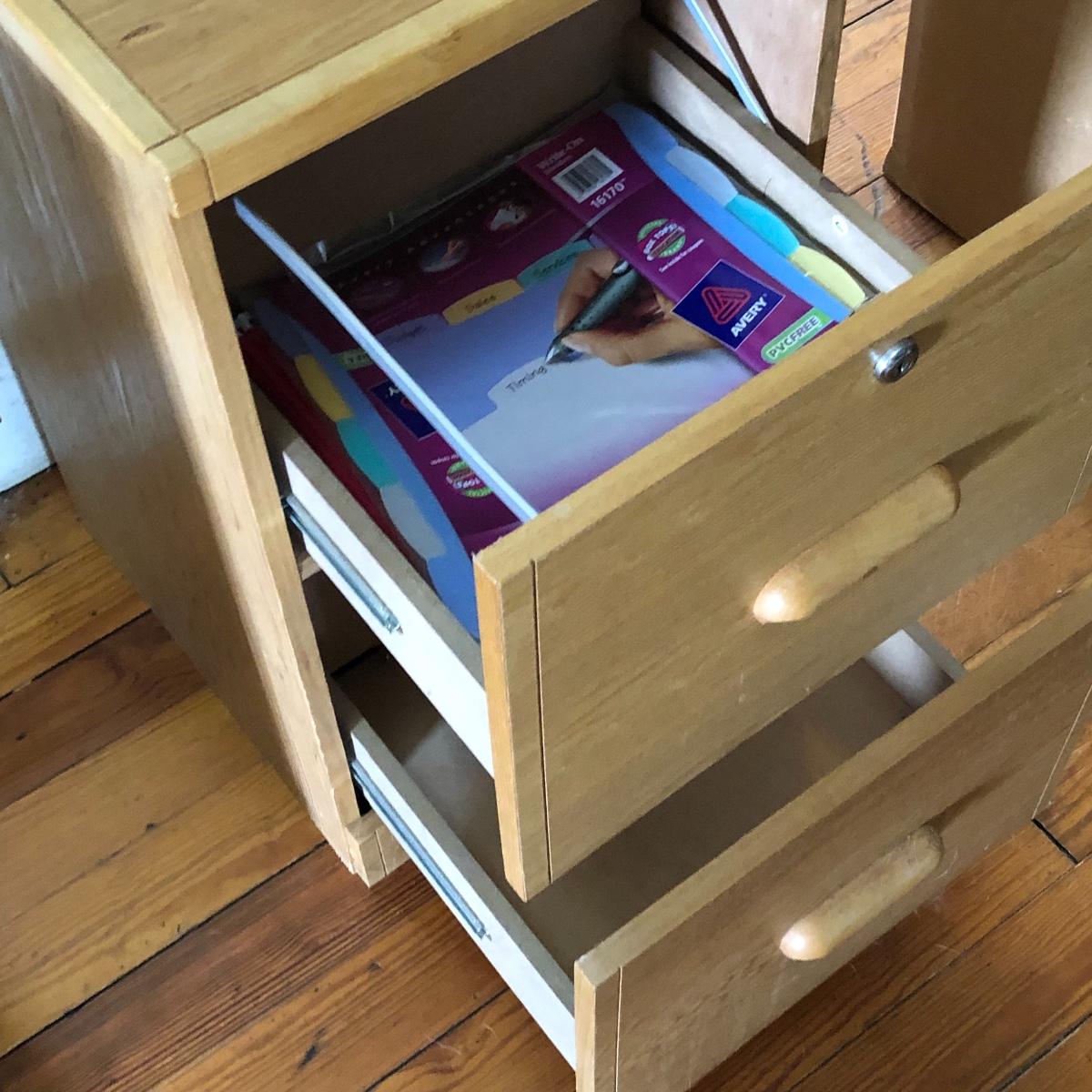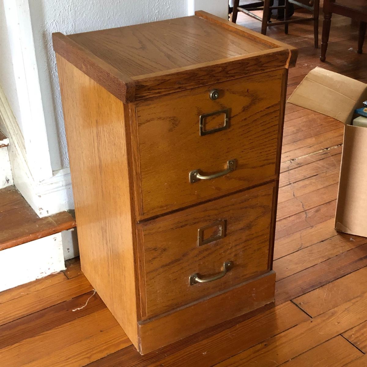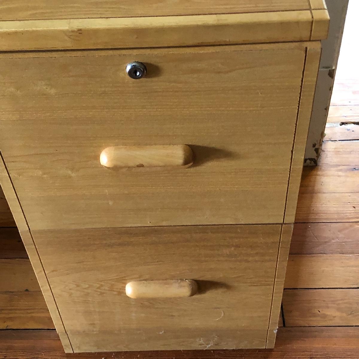 Two pressed wood filing cabinets here with a couple of rails needing to be reinstalled. Neither unit has its key.