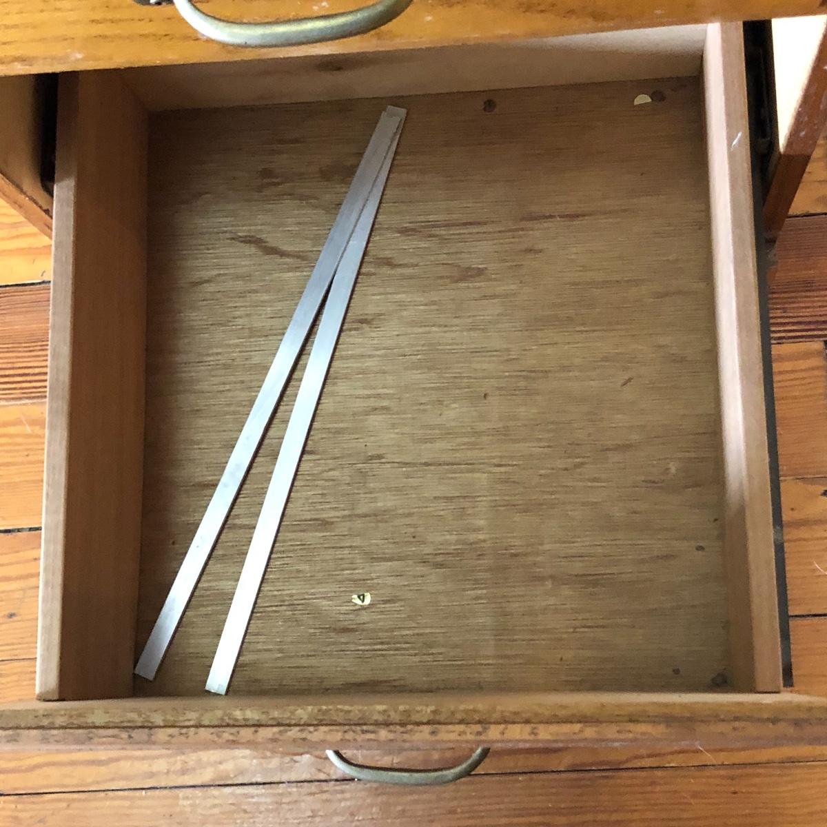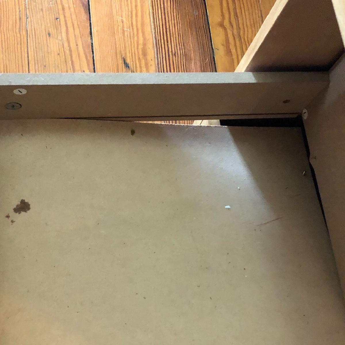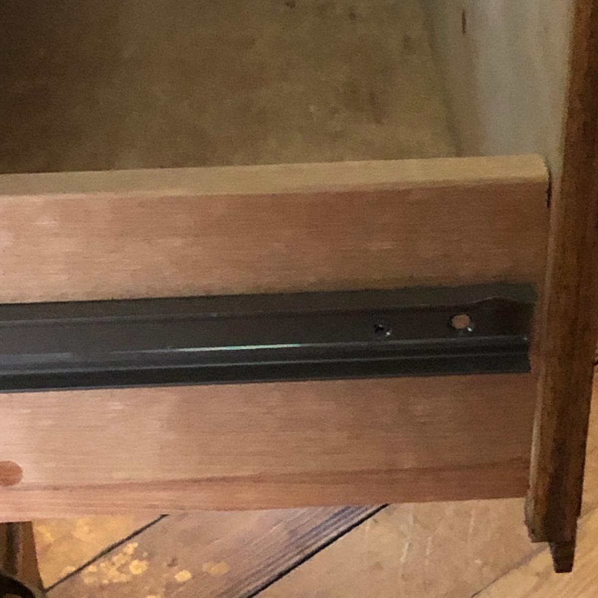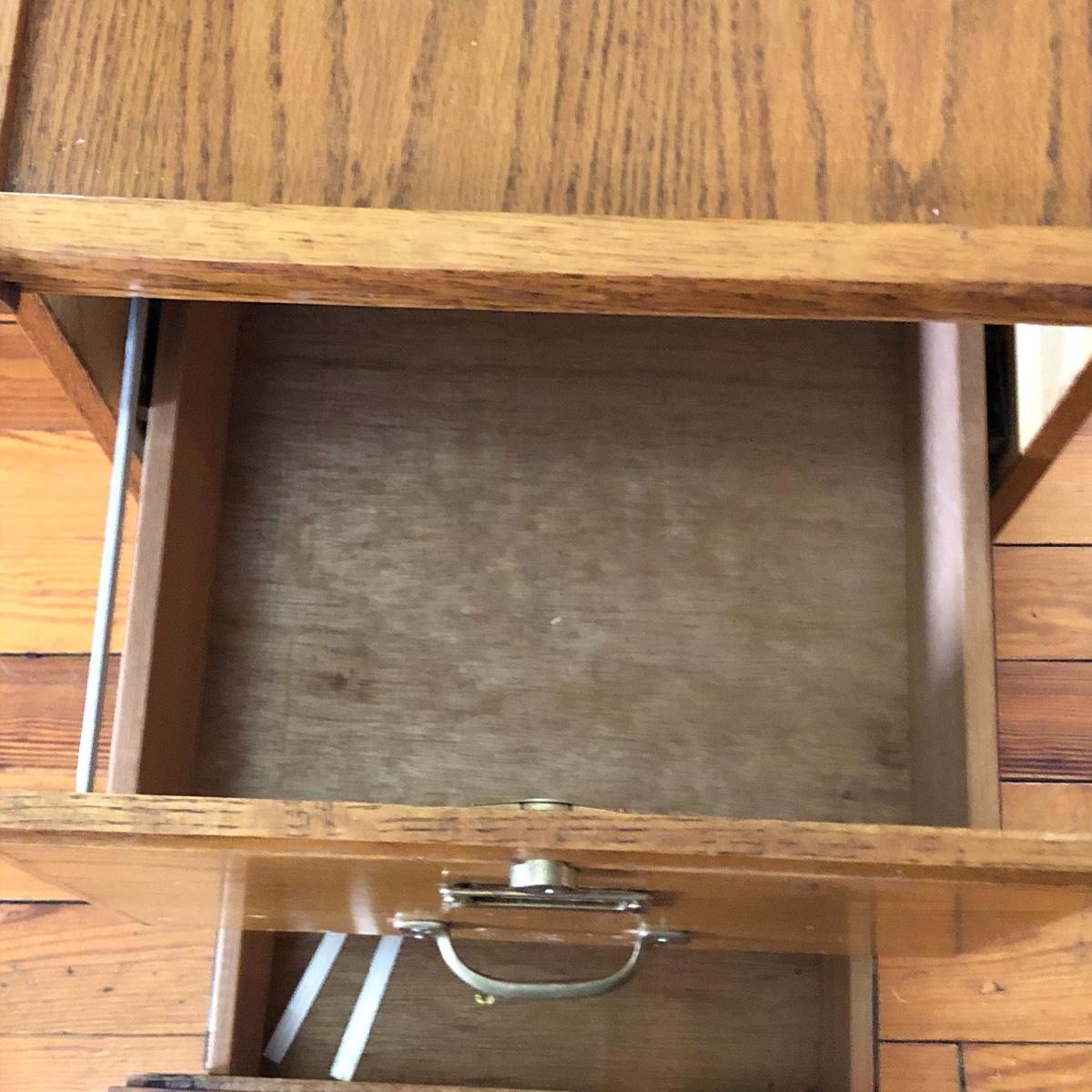 Two pressed wood filing cabinets here with a couple of rails needing to be reinstalled. Neither unit has its key.