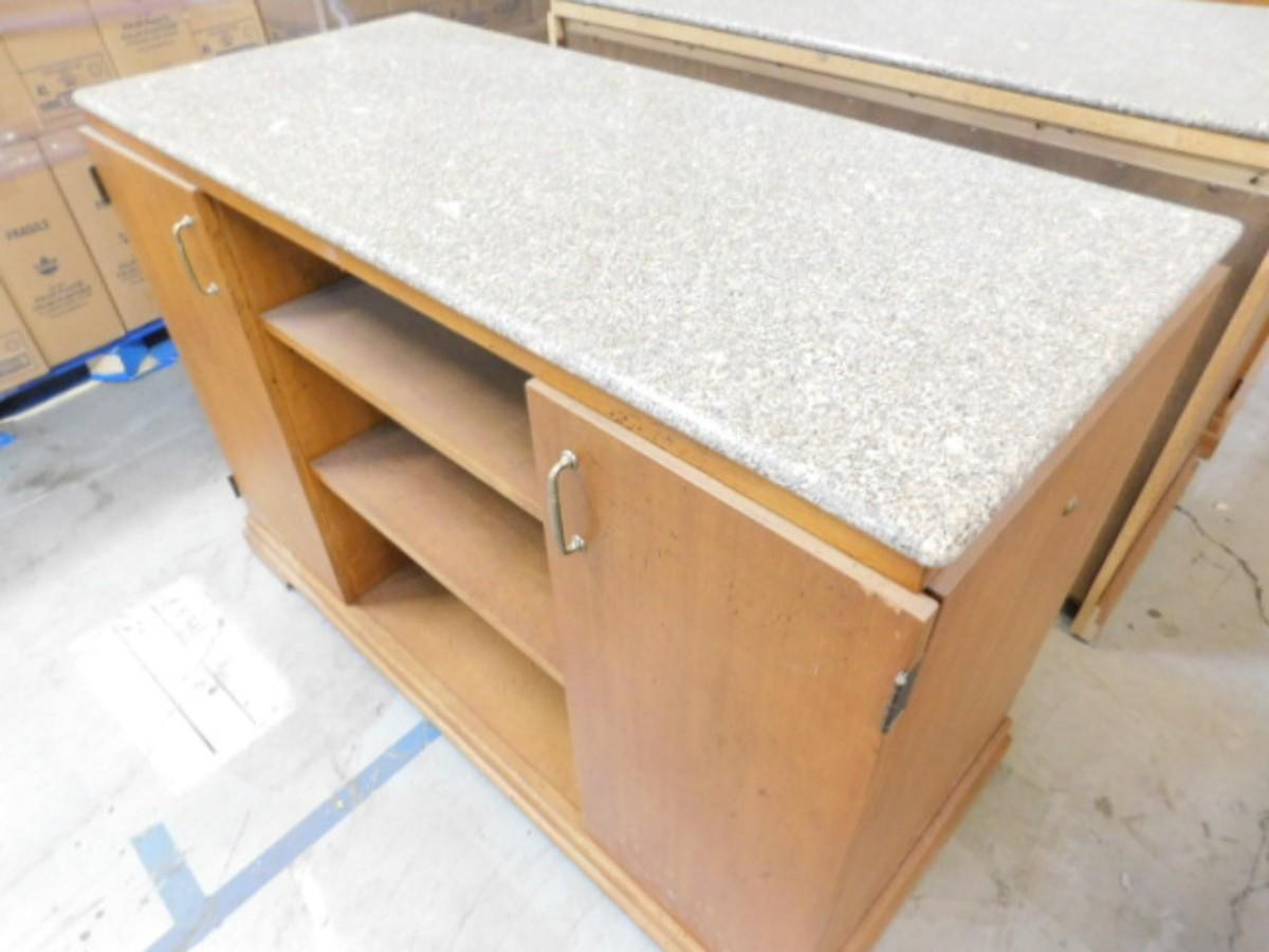 Pair of Wood Finish Double Door Media Console with Sandstone Color Marble Top for Large Flat Screen TV Choice C expect some scratches or wear to finish Shipping option via freight or local mover is Buyer's responsibility and expense. Buyer must have all shipping scheduled within the stated dates and times of pickup. Recommended local mover is Beaty Bros. Moving 828-201-2982