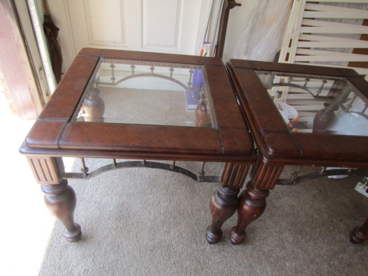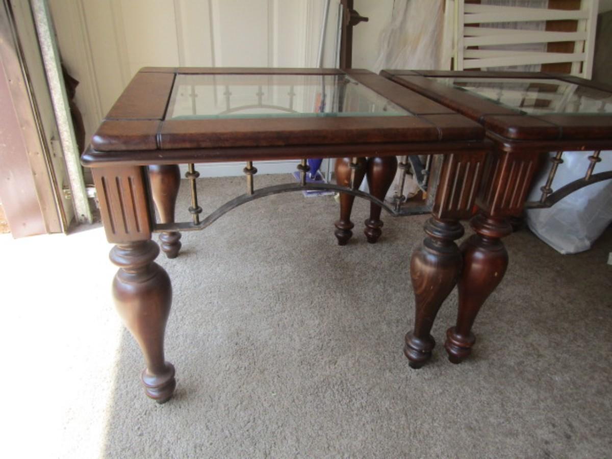 Pair of Wood Finish Glass Top Side Tables
