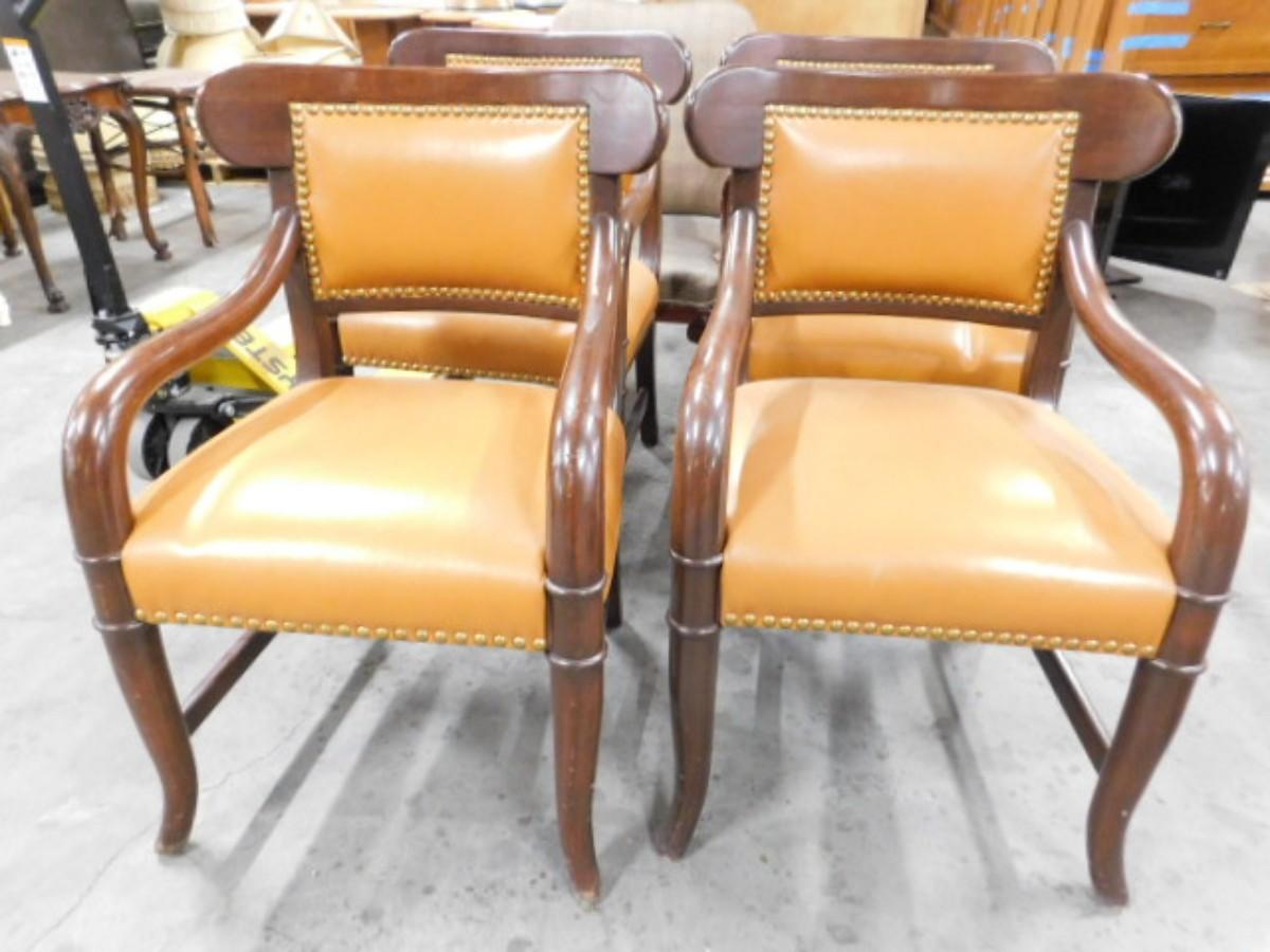 Pair of Wood Frame Chairs with Leather Cushion and Brass Tack Accents Set #3 Expect some wear or scratches to the finish. Shipping option available via freight or local mover at Buyer's expense. Buyer must have all shipping scheduled within the stated dates and times of pickup. Recommended local mover is Beaty Bros. Moving 828-201-2982