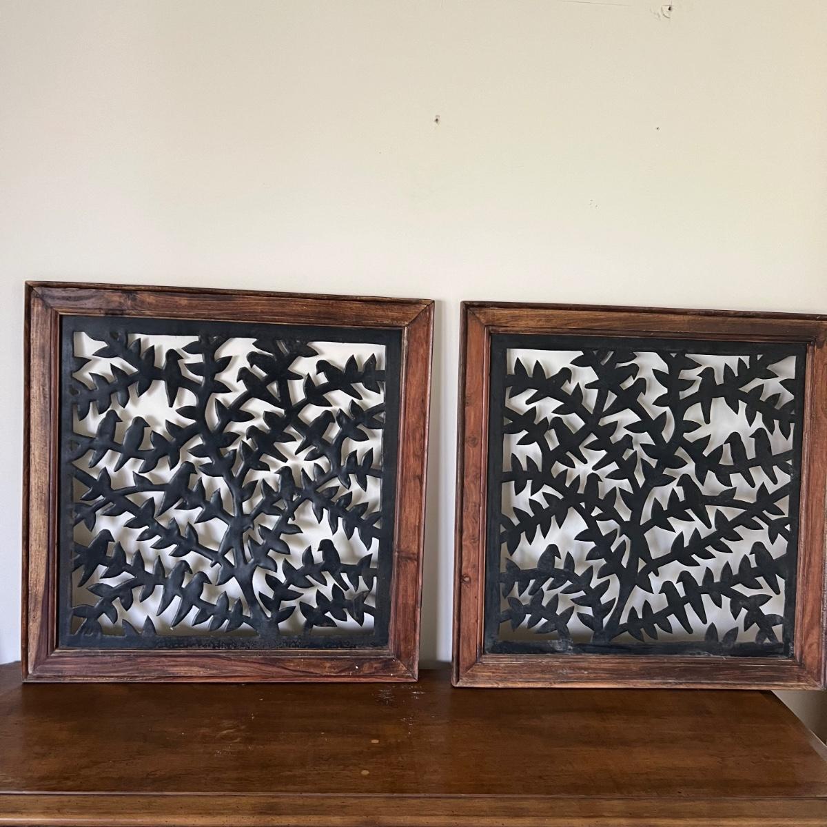 This pair of matching black metal wall art features birds sitting on tree branches. Their frames are made of solid rustic wood.
