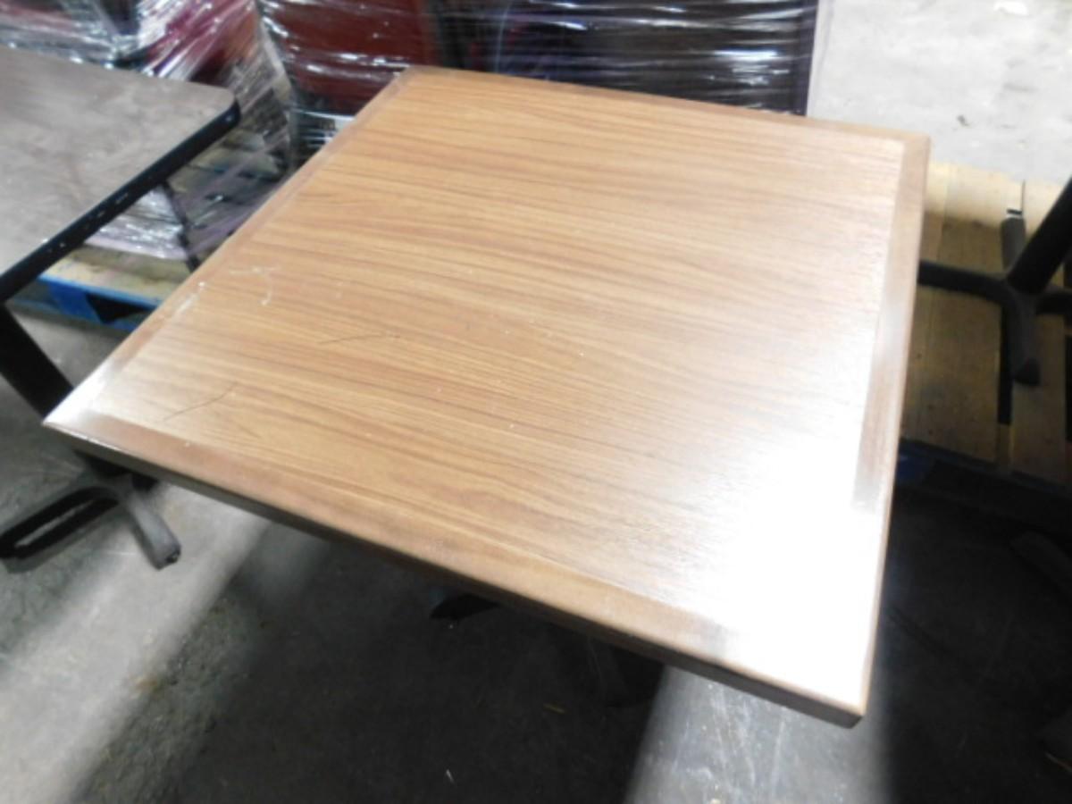 Pair of Wood Goods Industries 4-Top Wood Finish Commercial Grade Square Corner Tables Metal Base