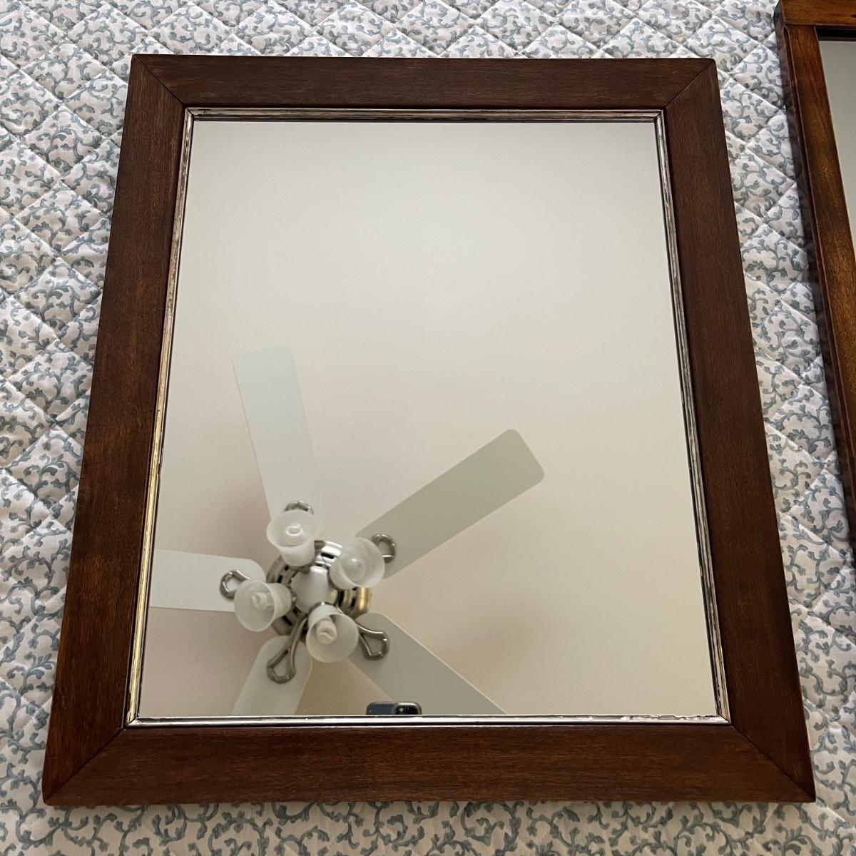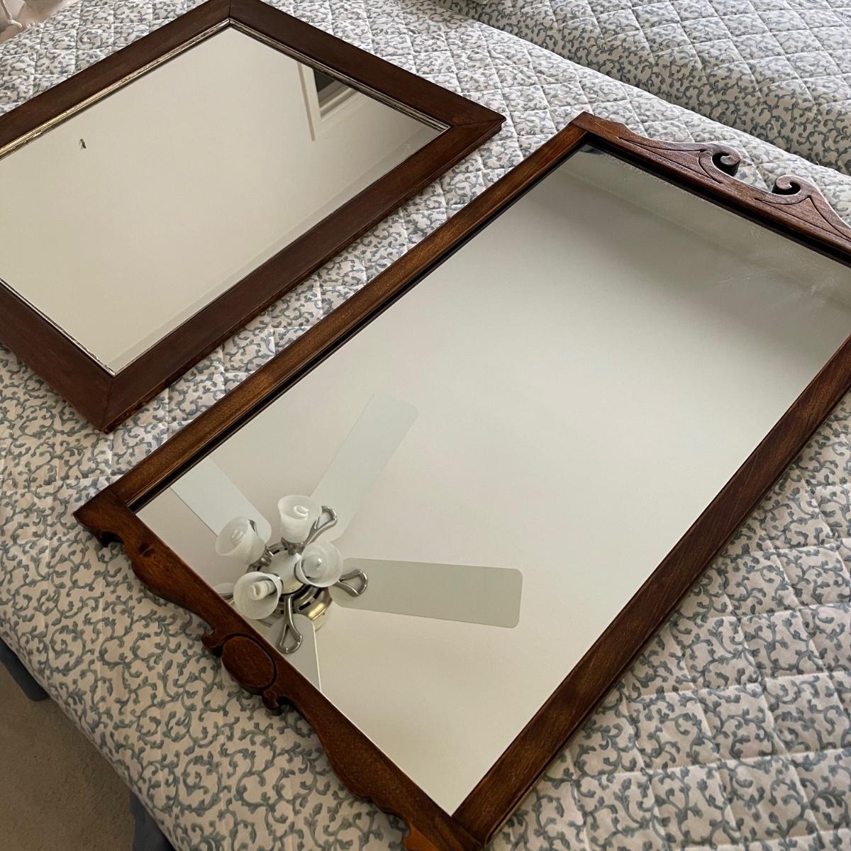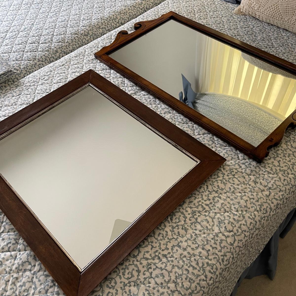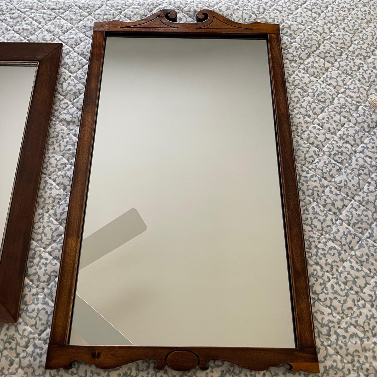 Two mirrors with wooden frames. The smaller one is 20.5” x 24” and has a simple rectangular dark wood frame. The other mirror is 17.5” x 32” and its frame has some decorative wood designs on the top and bottom.