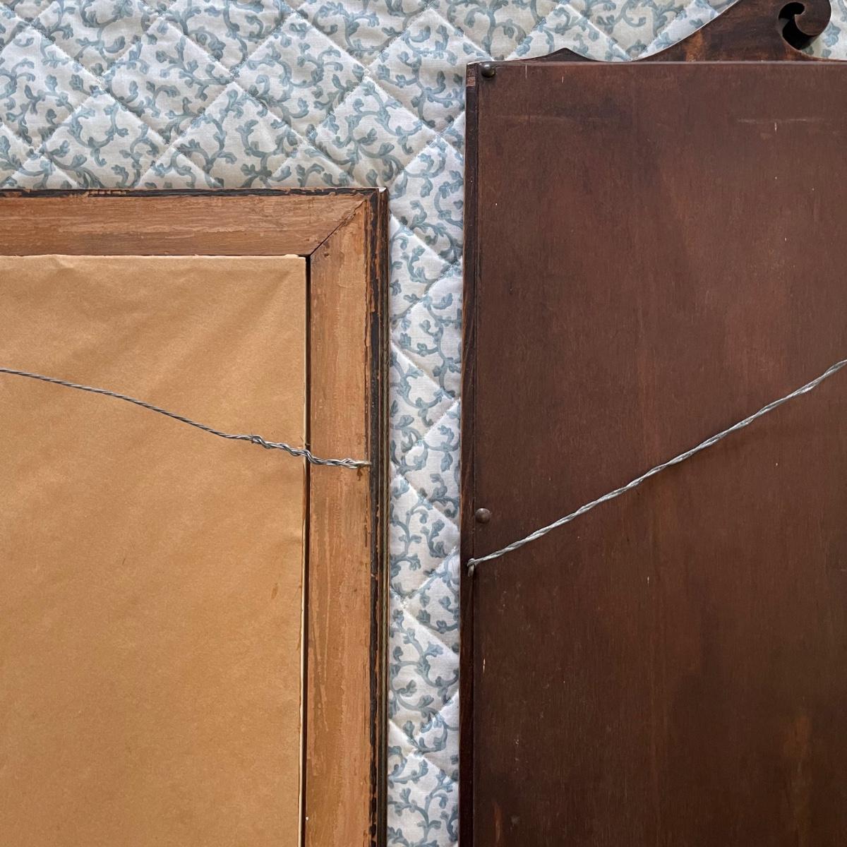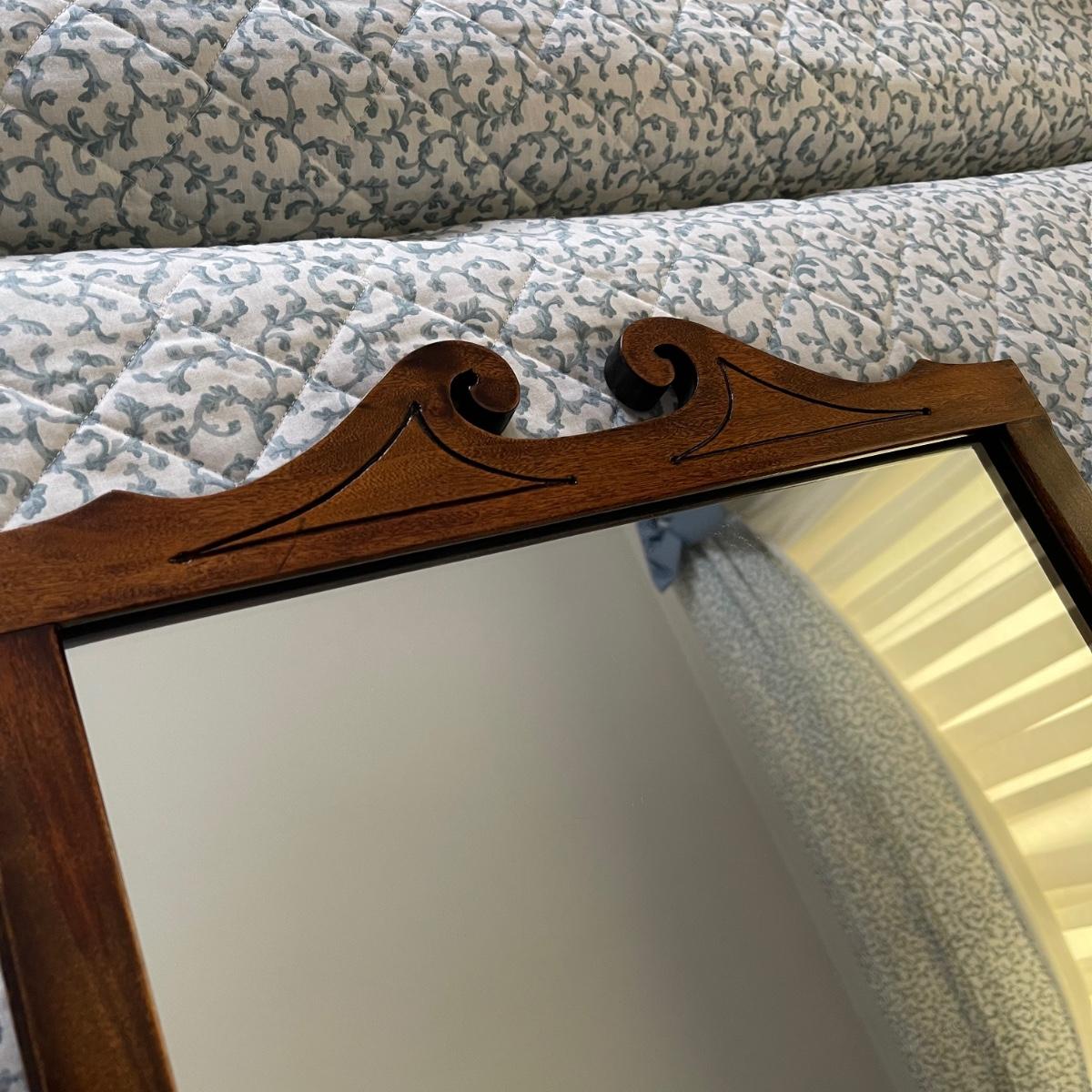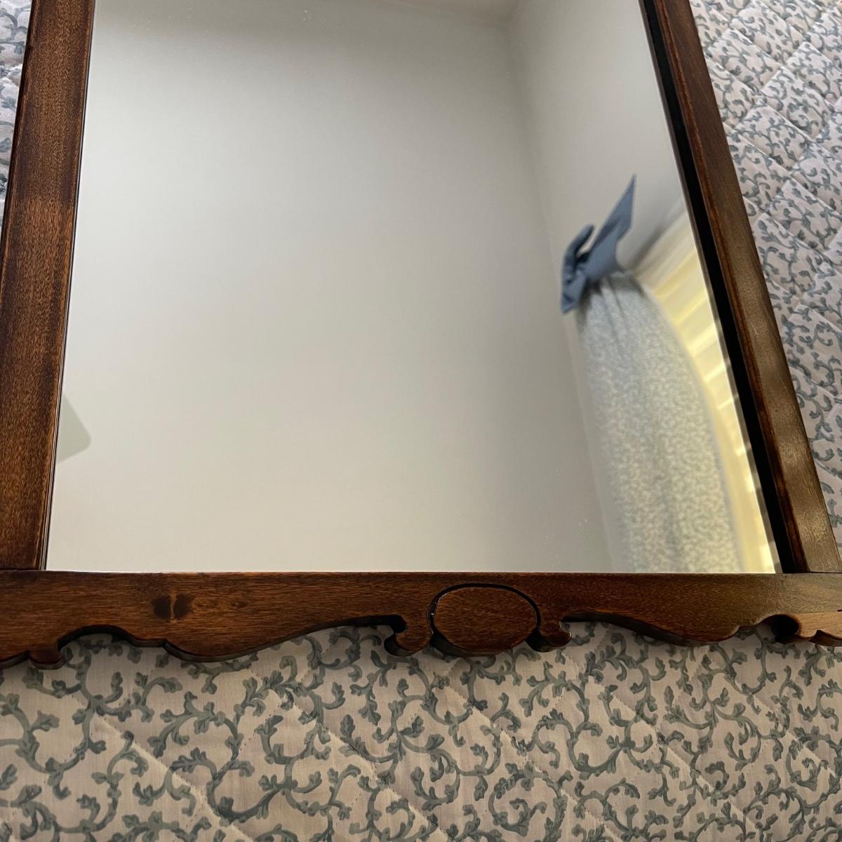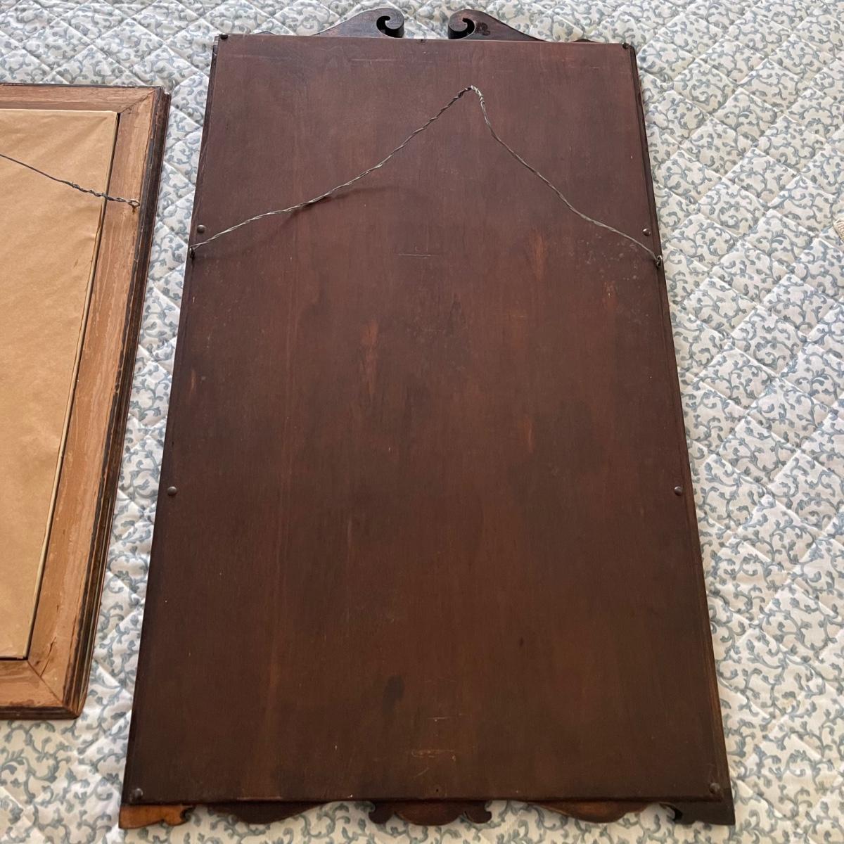 Two mirrors with wooden frames. The smaller one is 20.5” x 24” and has a simple rectangular dark wood frame. The other mirror is 17.5” x 32” and its frame has some decorative wood designs on the top and bottom.