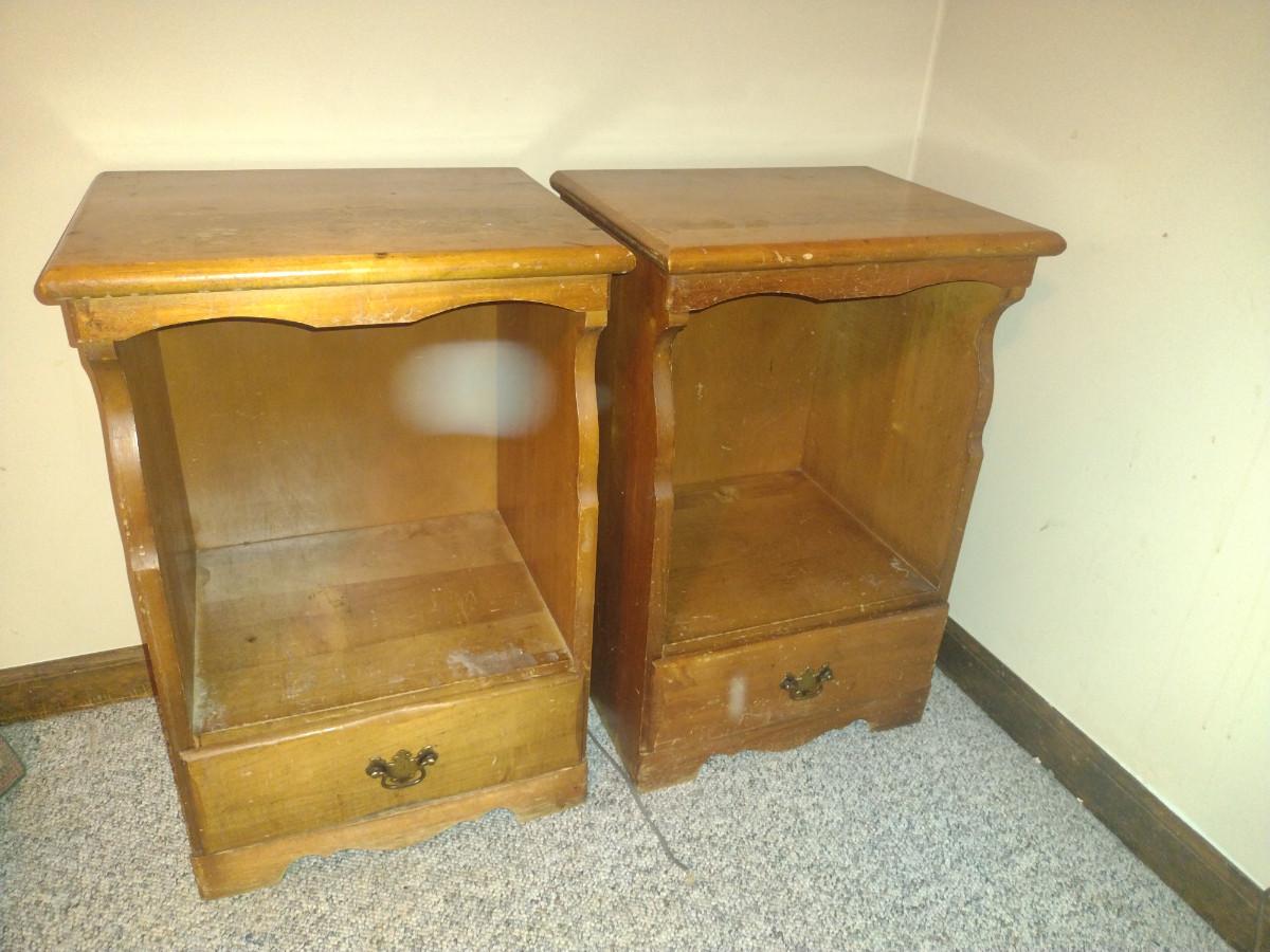 Pair of Wood Side Tables with Drawer- Approx 15 1/2" x 12 1/2" x 23 1/4" Tall. Items have damage to finish- please see all pictures.
