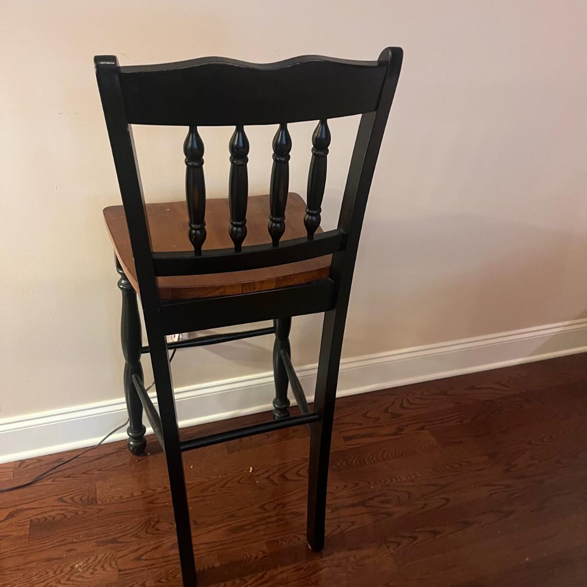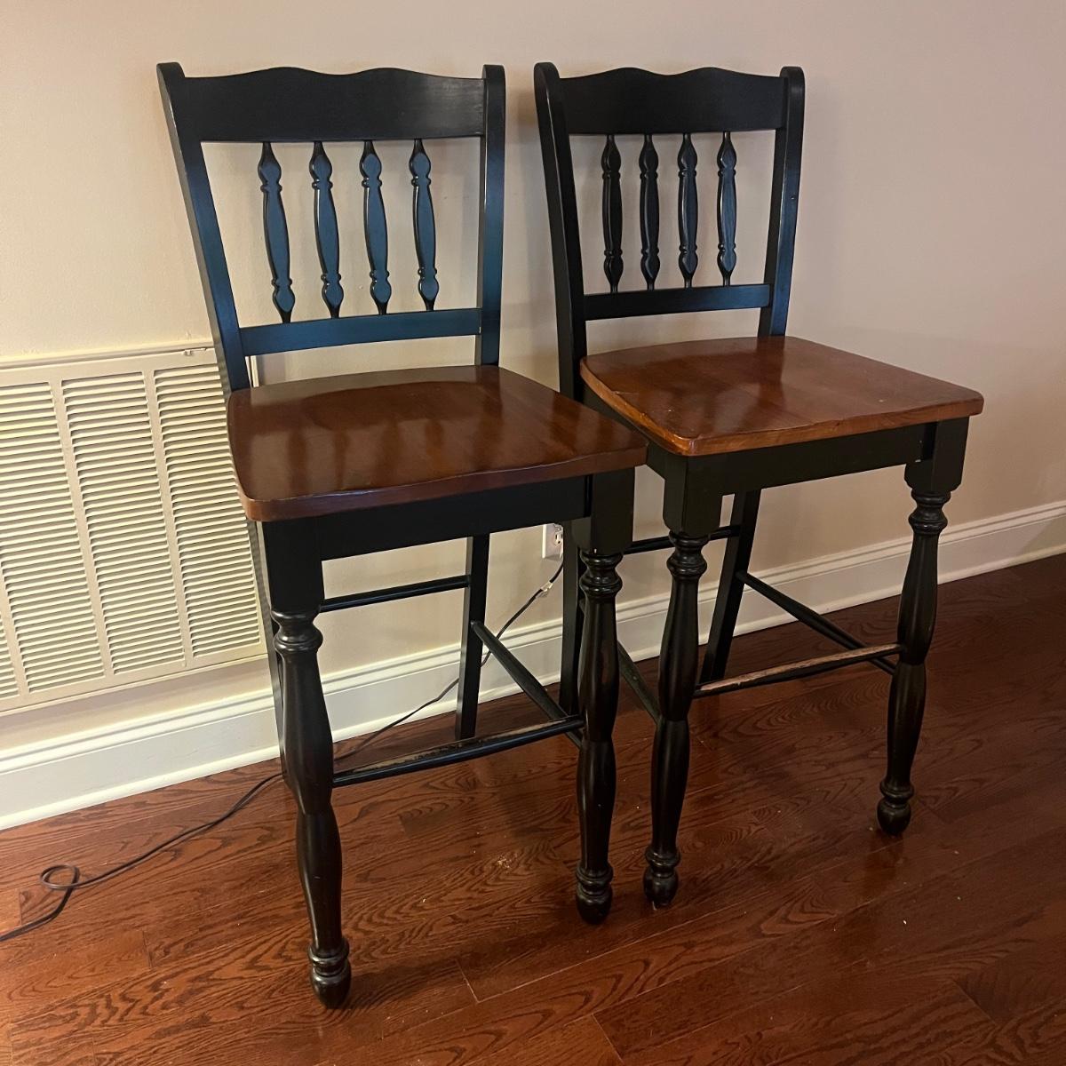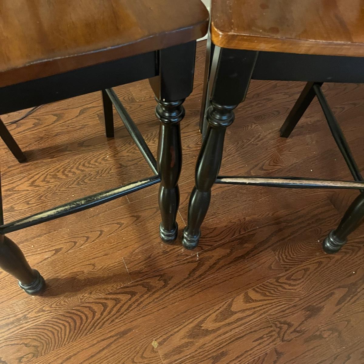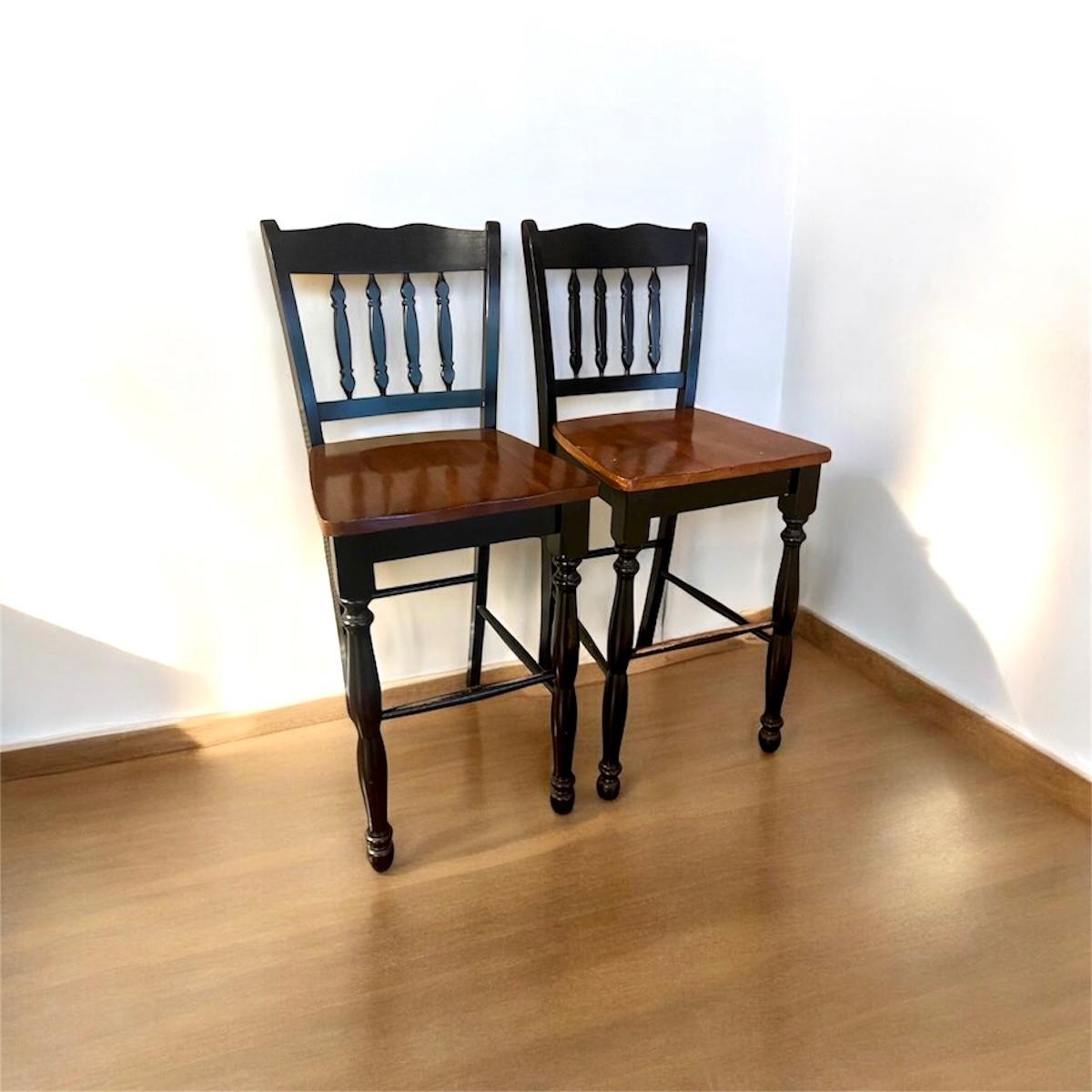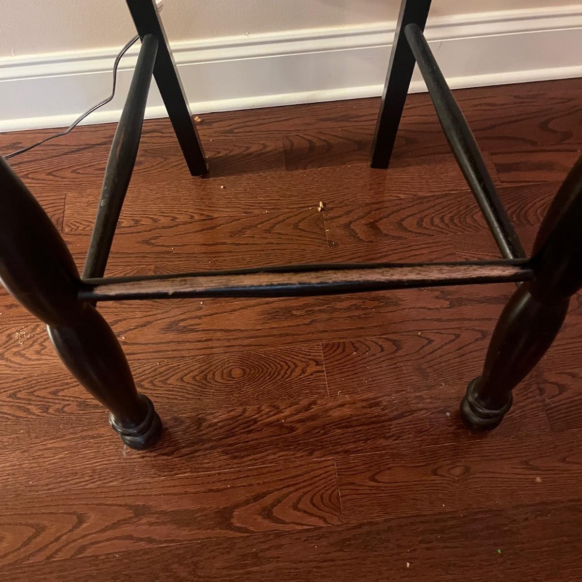 Lot includes two wooden ebony barstools with natural color seats. Barstools measure 19” x 22” x 46”H with a 30” seat height. Barstools have scratches, nick and wear on support, see pictures.