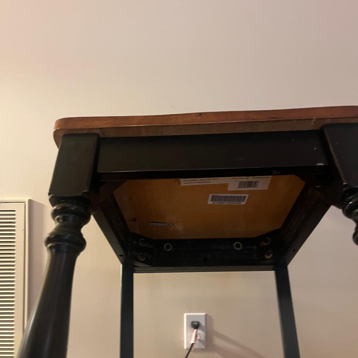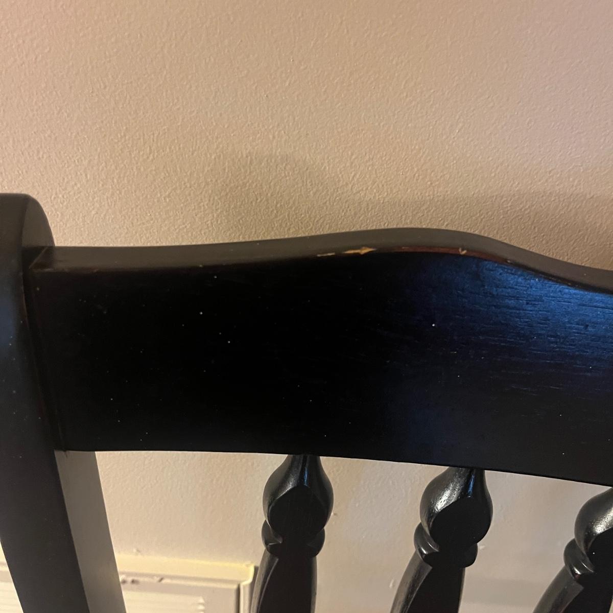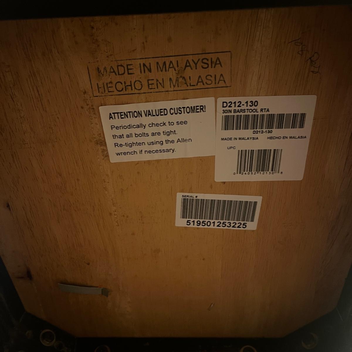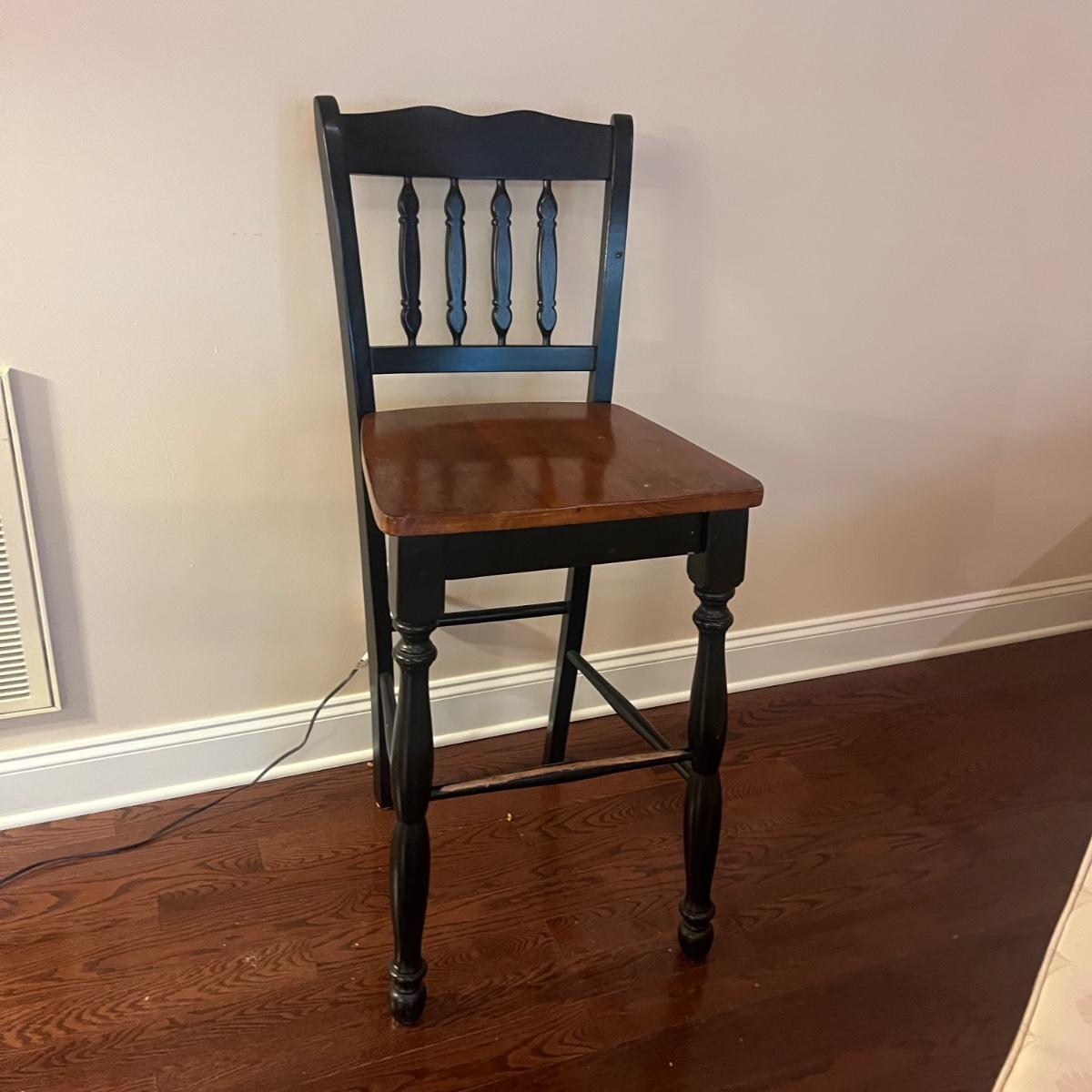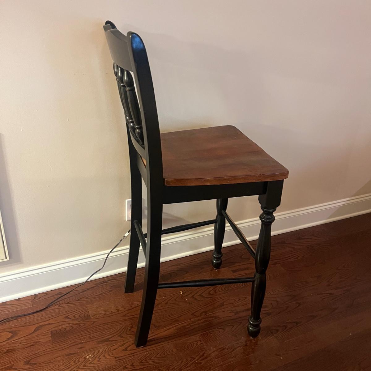 Lot includes two wooden ebony barstools with natural color seats. Barstools measure 19” x 22” x 46”H with a 30” seat height. Barstools have scratches, nick and wear on support, see pictures.