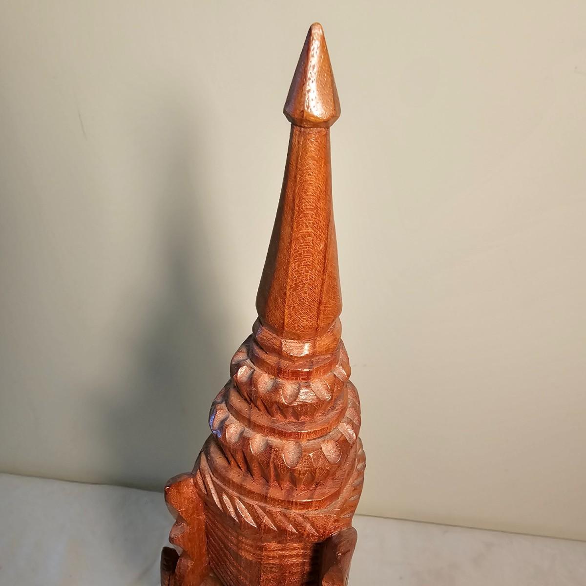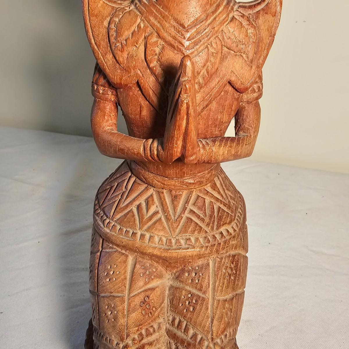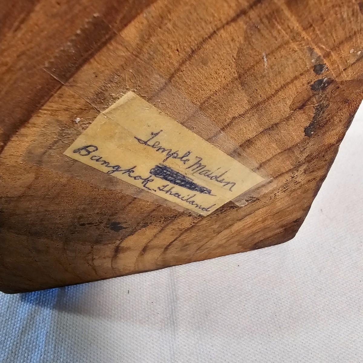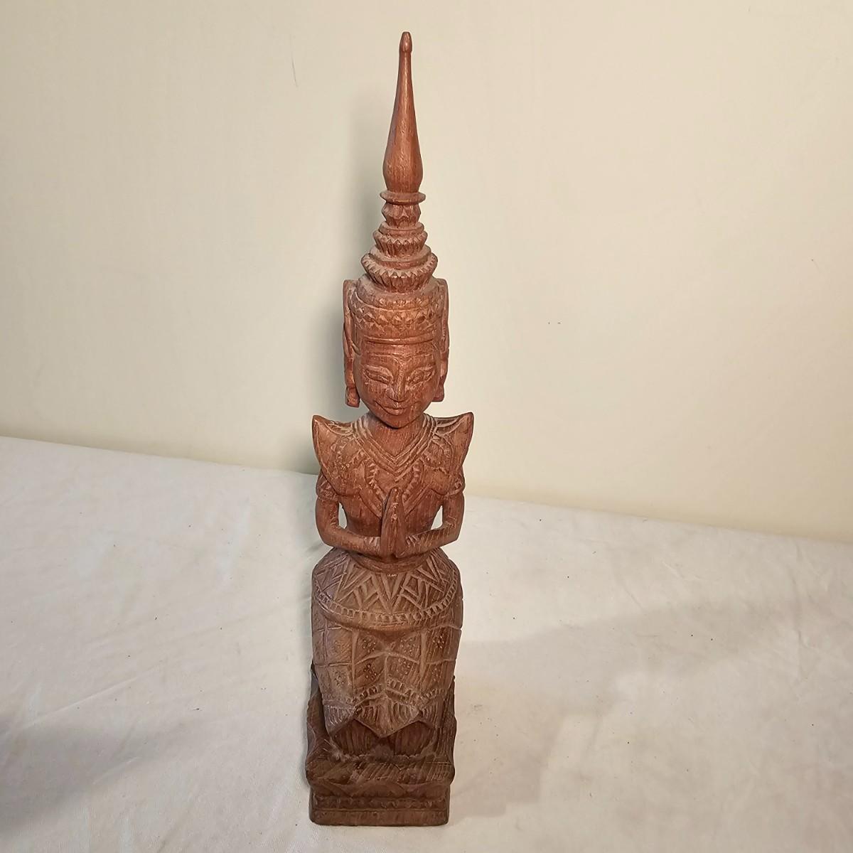 Beautifully detailed carved statuettes of temple maidens. One has a label that suggests they are from Thailand. Ornate headdress and costumes on each piece. Larger item is 3.25" x 4" x 17.5"H, shorter is 3.5" x 4.5" x 16"H. See photos for details. Shipping available.