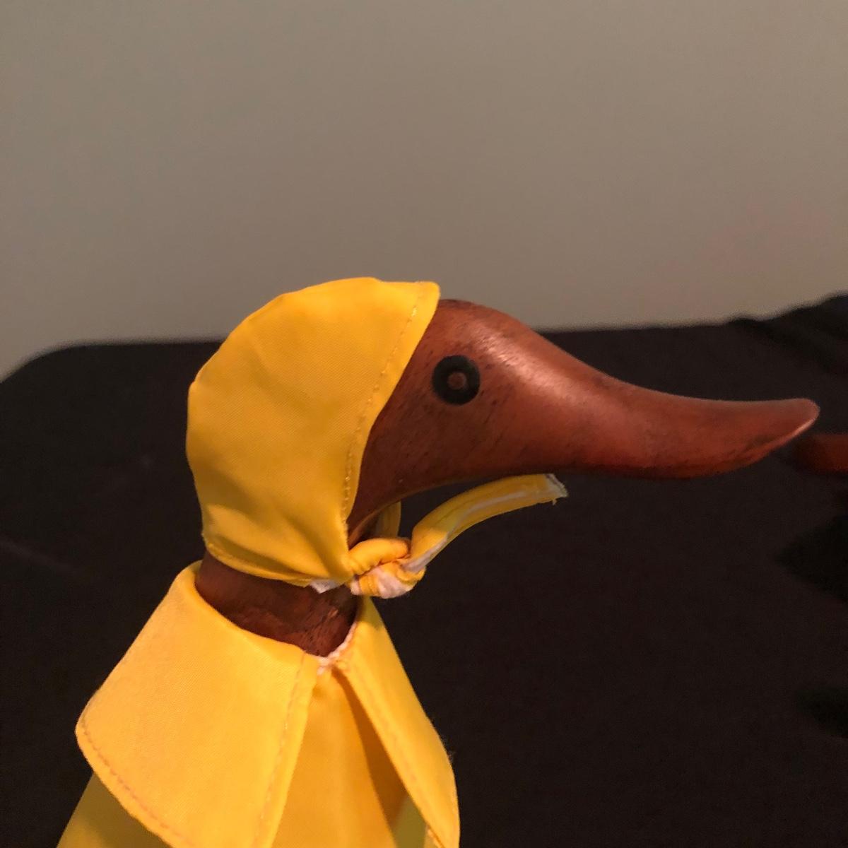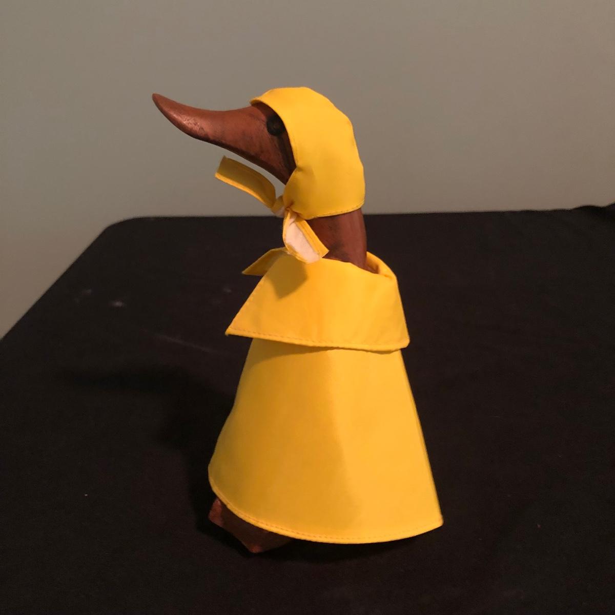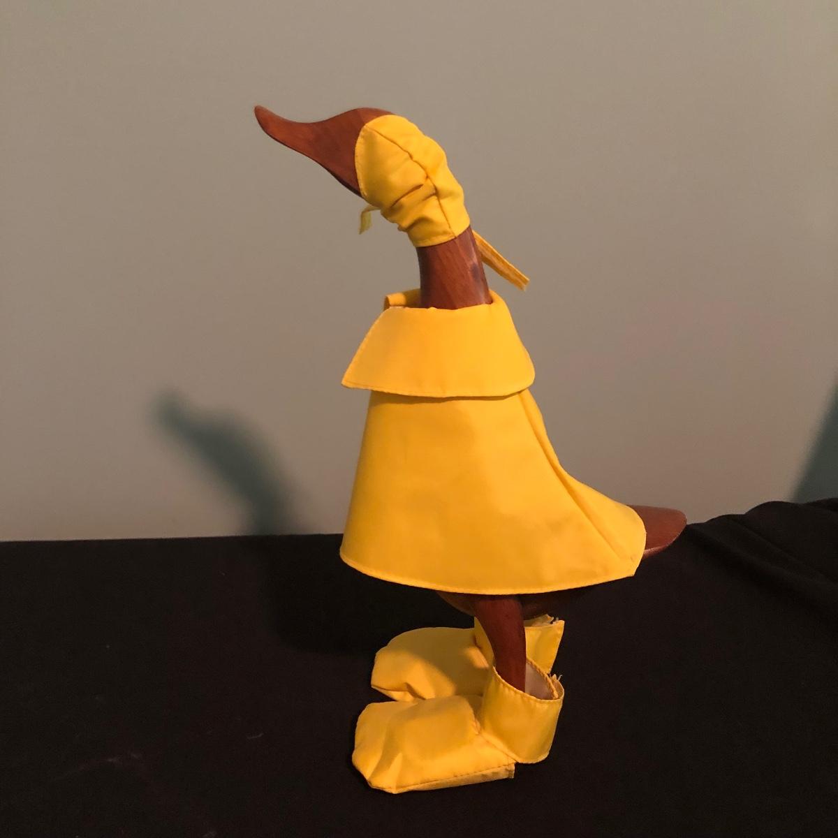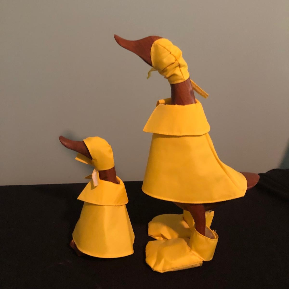 Lot includes two wooden ducks in removable yellow rain slickers. Largest duck has broken foot, see pictures. Both broken pieces are there so It should be a easy fix. Largest duck measures 4.5” x 7” x 12”.