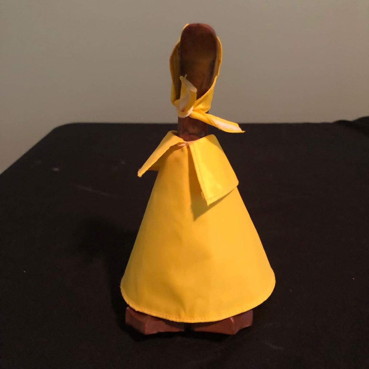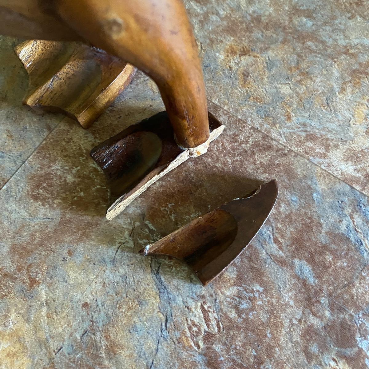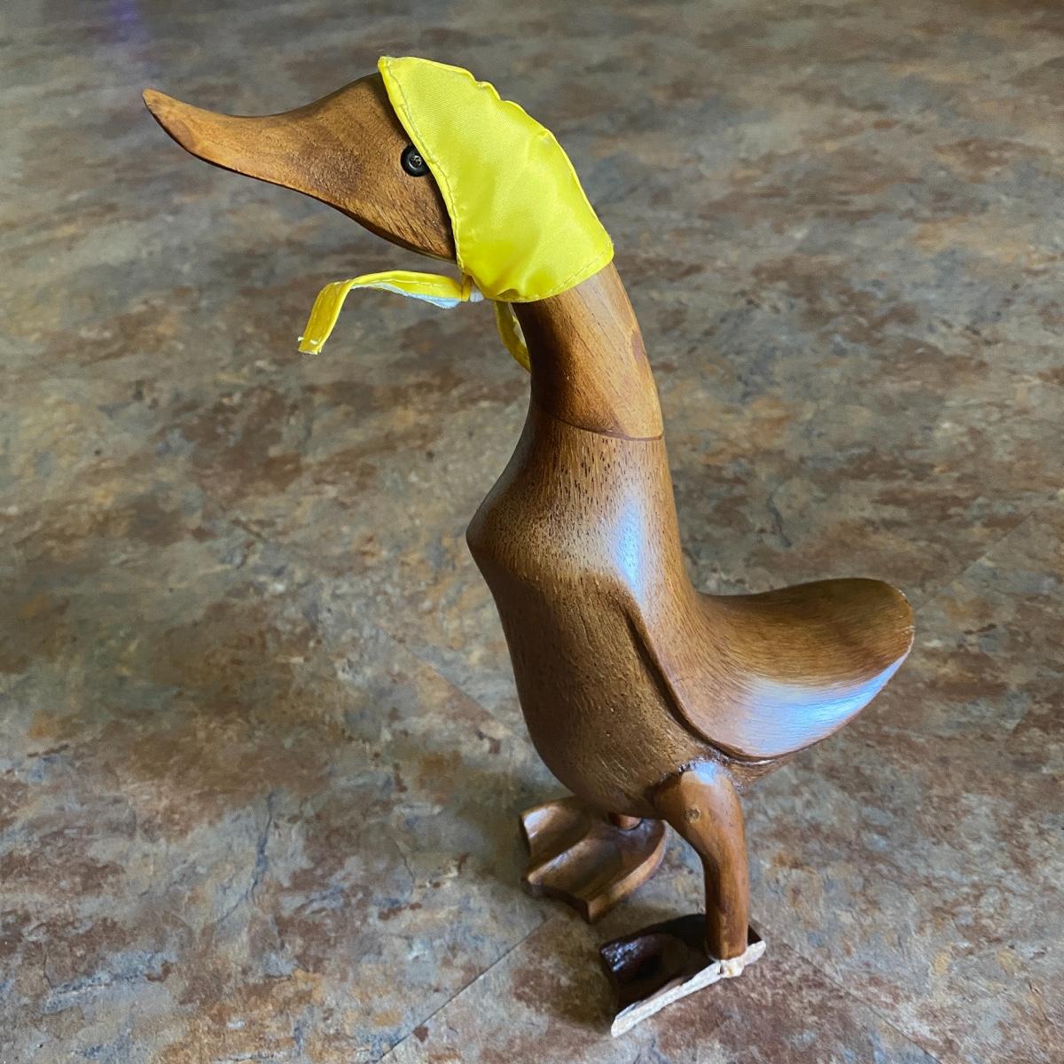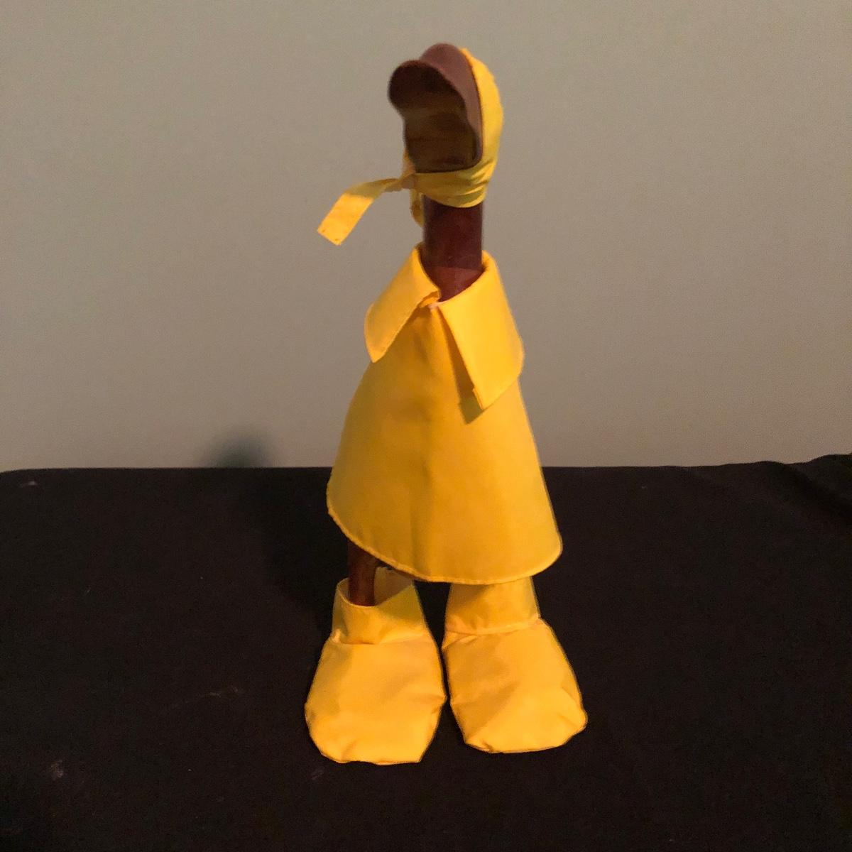 Lot includes two wooden ducks in removable yellow rain slickers. Largest duck has broken foot, see pictures. Both broken pieces are there so It should be a easy fix. Largest duck measures 4.5” x 7” x 12”.