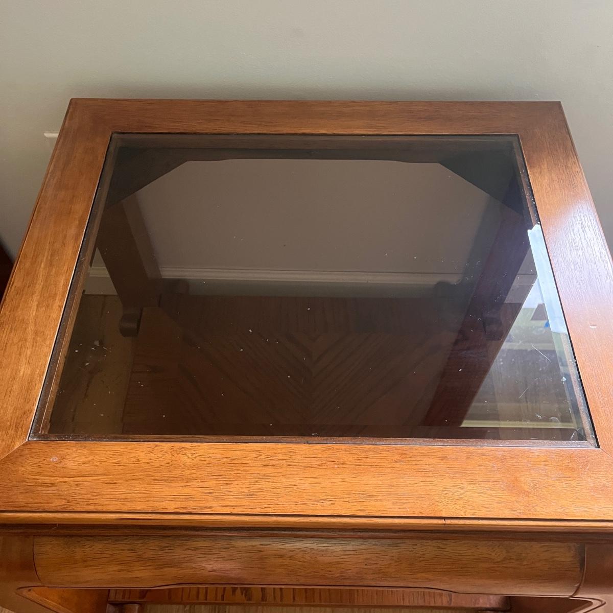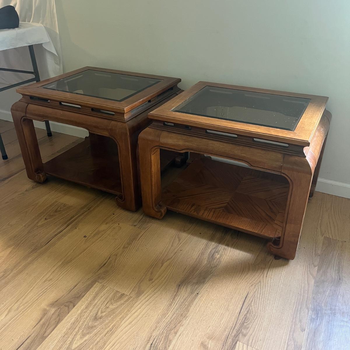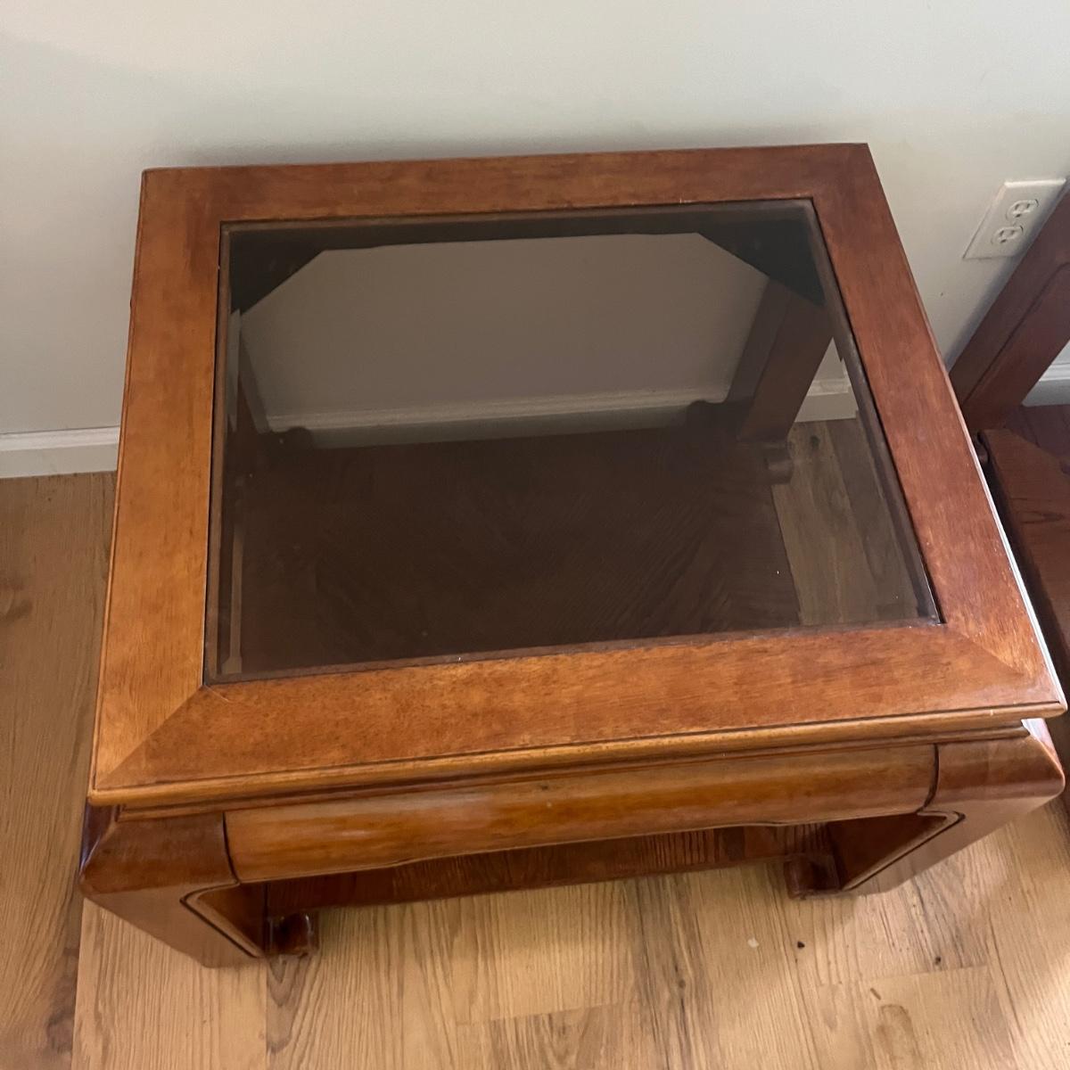Lot includes two wooden end tables with removable beveled glass inserts on top. Tables measure 25” x 28” x 22”H. There is a matching coffee table in a different lot in this auction.