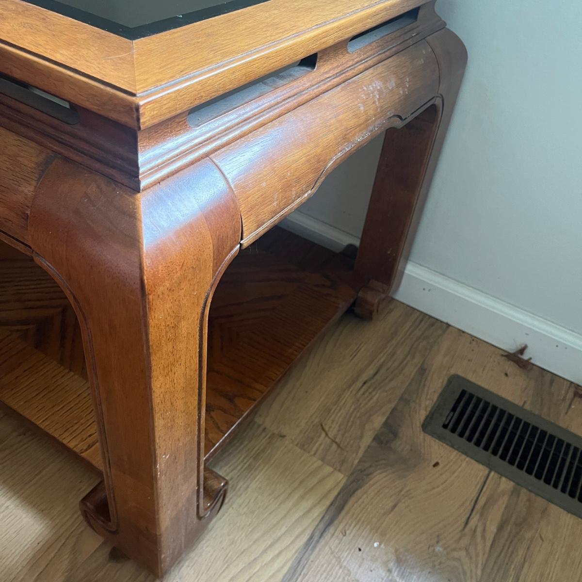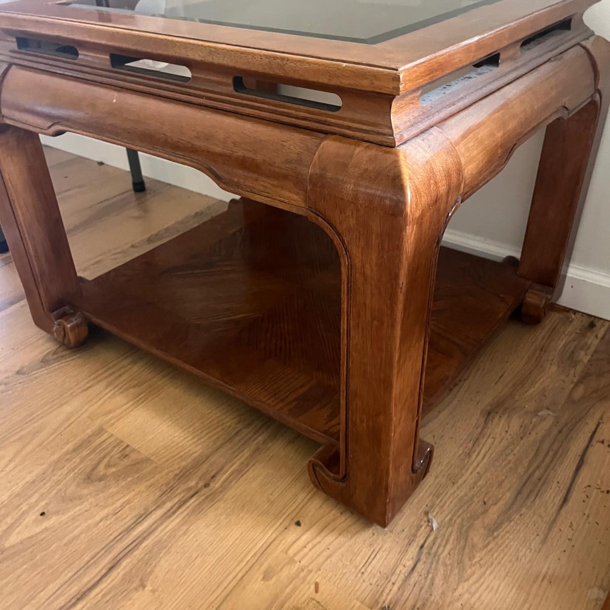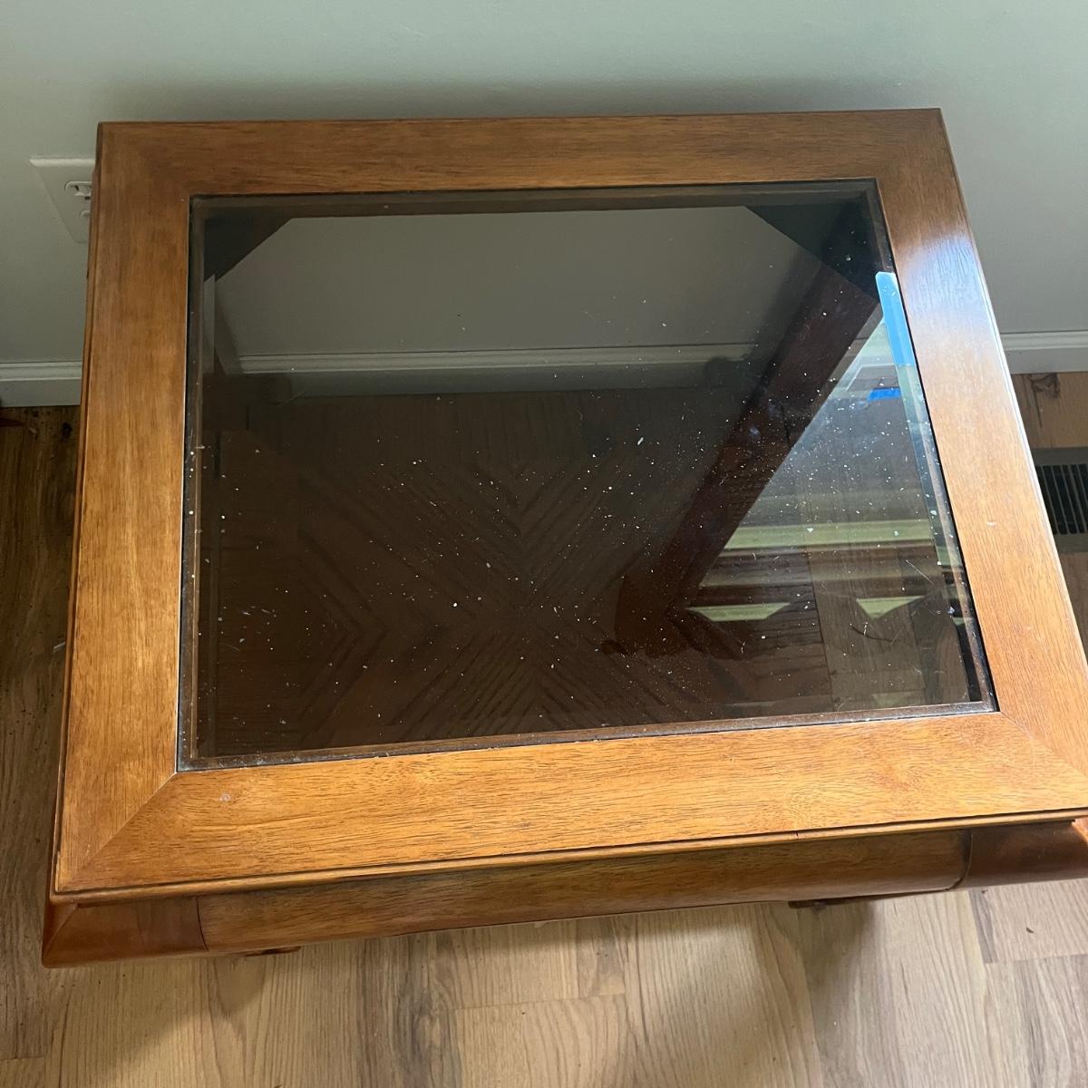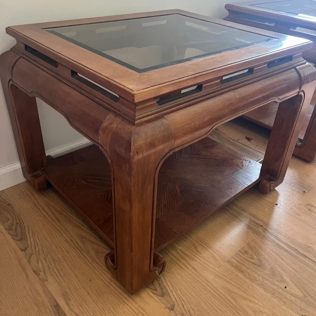 Lot includes two wooden end tables with removable beveled glass inserts on top. Tables measure 25” x 28” x 22”H. There is a matching coffee table in a different lot in this auction.