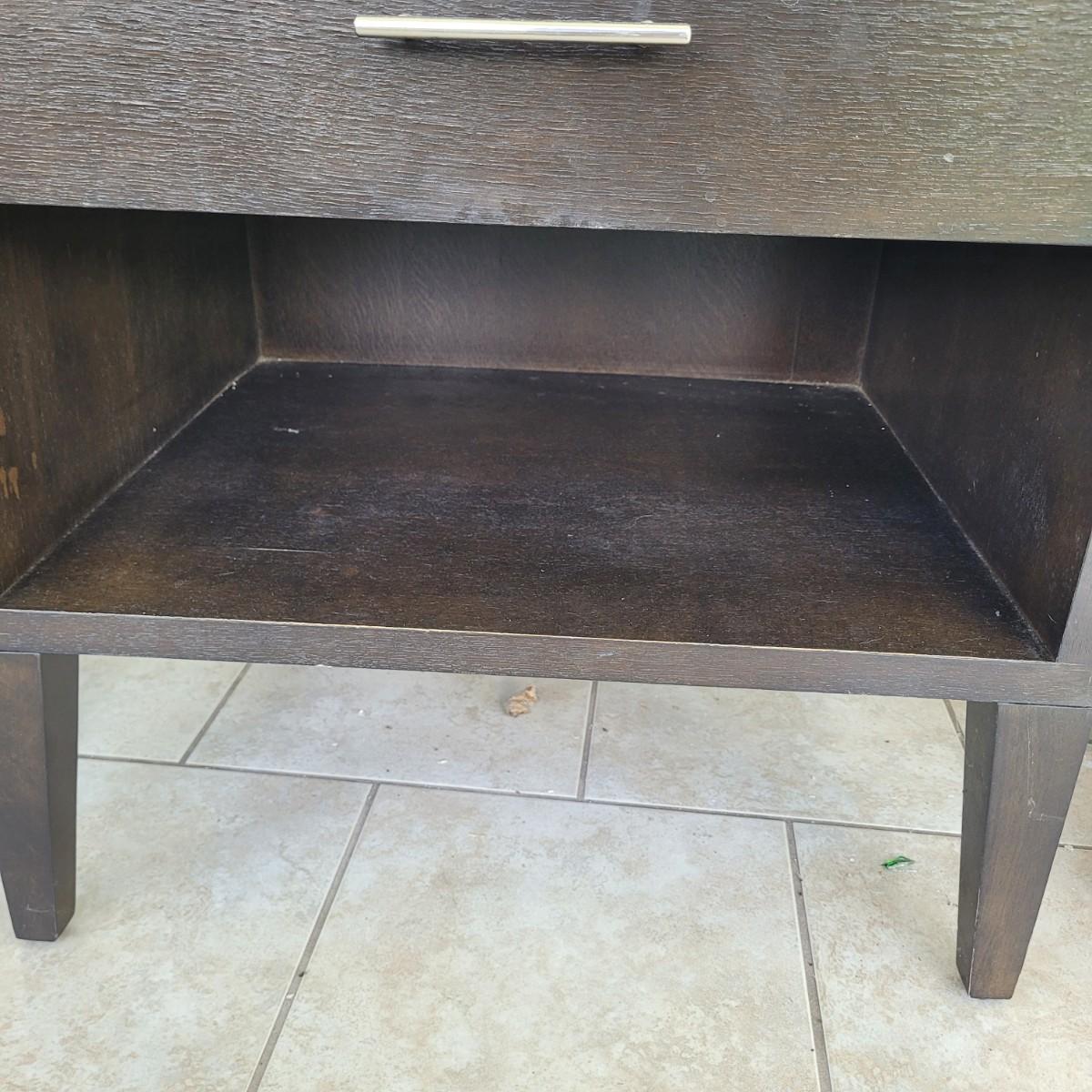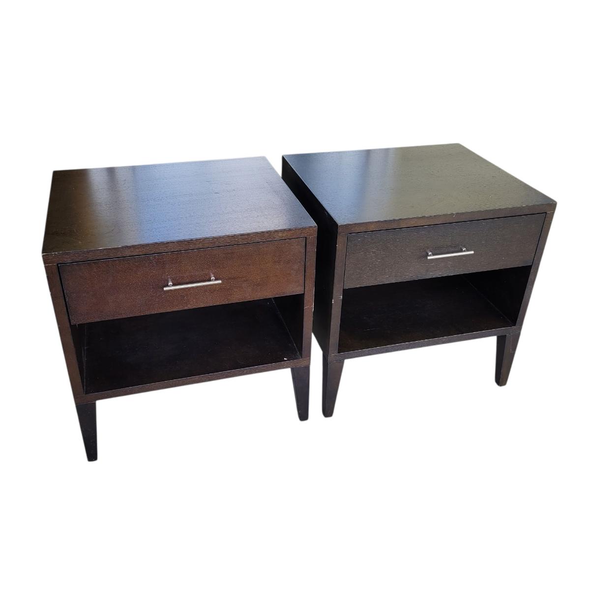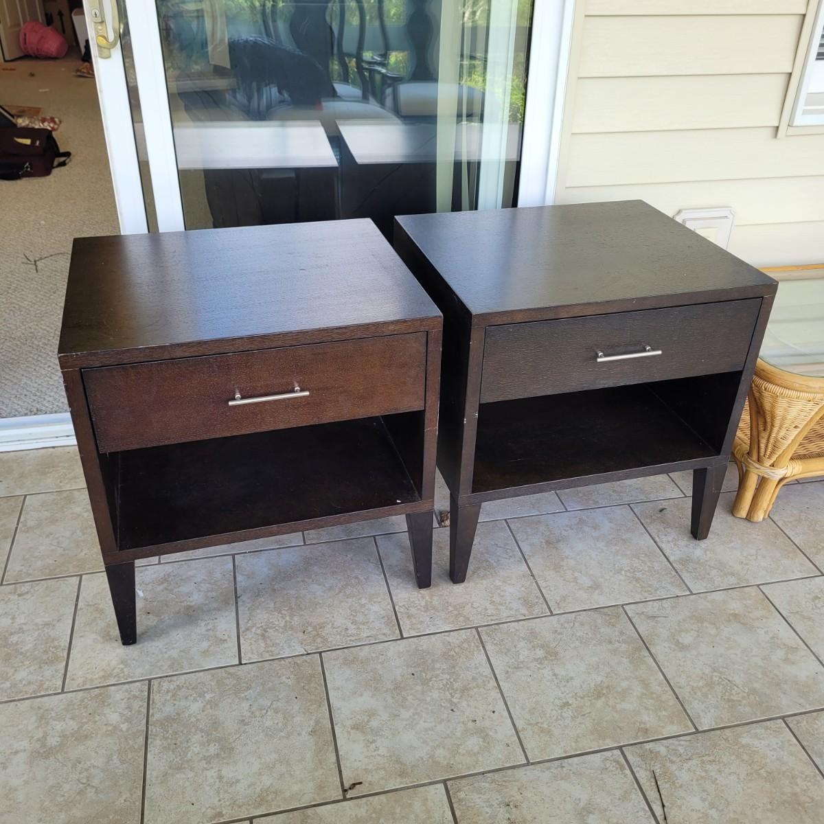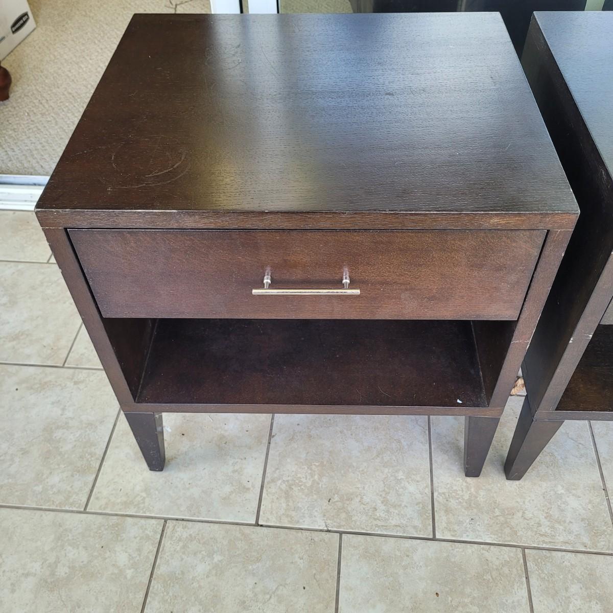 This lot includes two matching wooden end tables or night stands. They are made from wood and feature some metal parts. Each table has a sliding drawer with a metal handle and a large open shelf on the bottom. Legs are made from angled wood. Both tables show minor signs of wear in the form of some scratches and marks. Individually the tables measure 23.5" x 20" x 24"H.