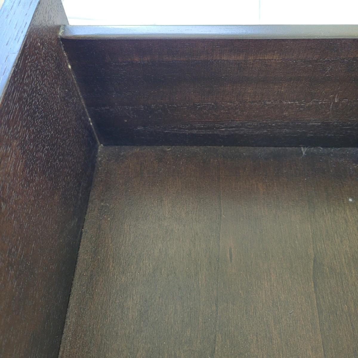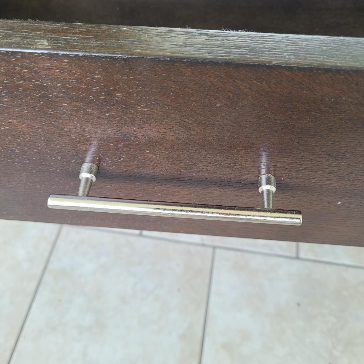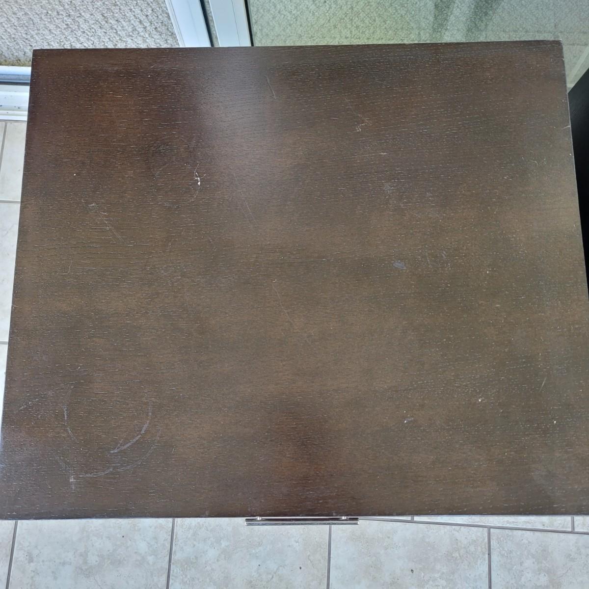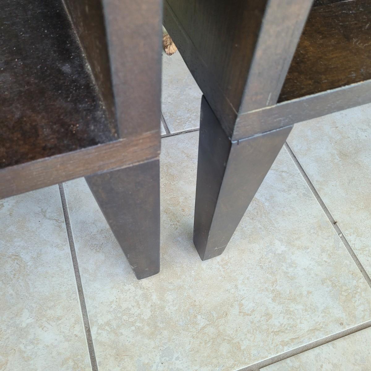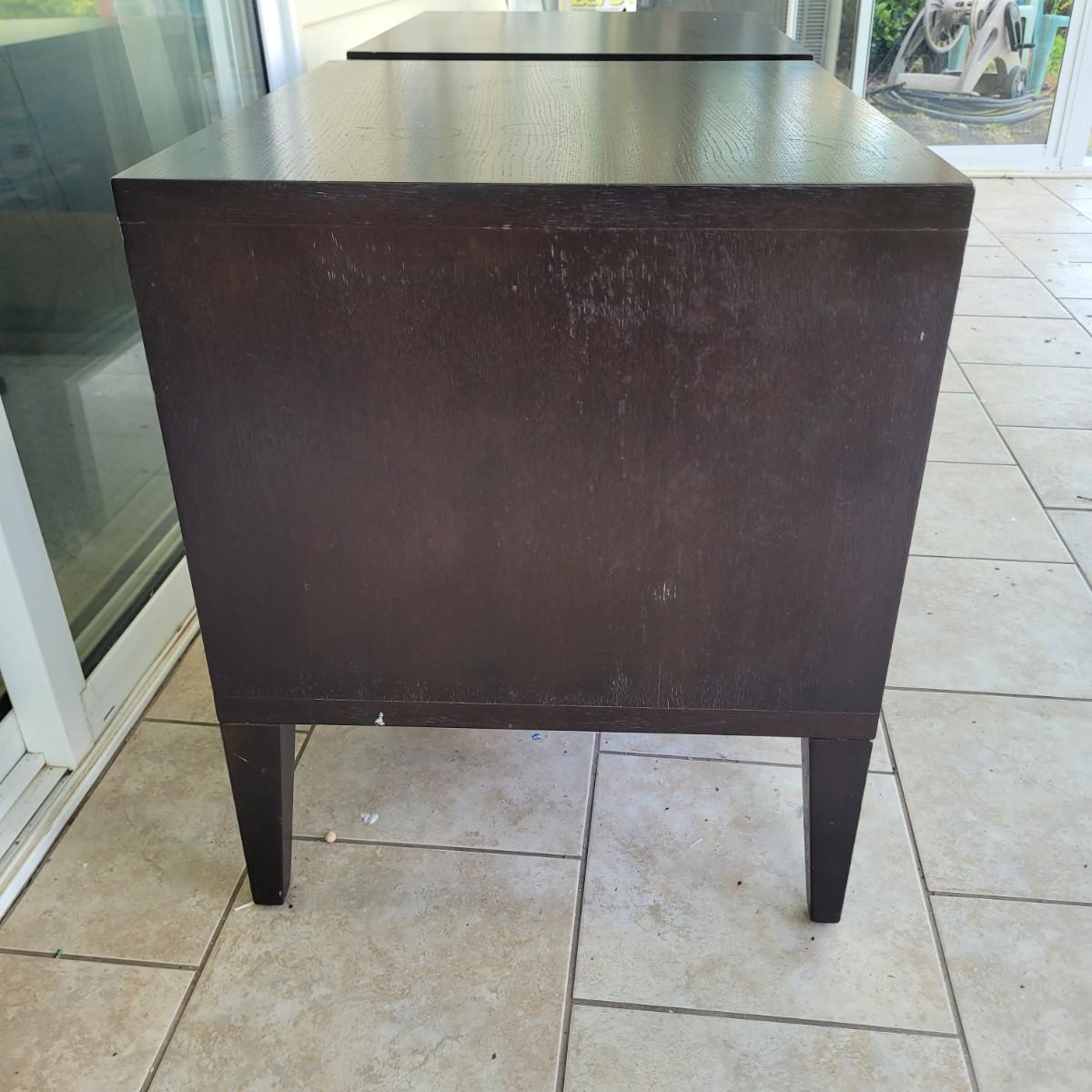 This lot includes two matching wooden end tables or night stands. They are made from wood and feature some metal parts. Each table has a sliding drawer with a metal handle and a large open shelf on the bottom. Legs are made from angled wood. Both tables show minor signs of wear in the form of some scratches and marks. Individually the tables measure 23.5" x 20" x 24"H.