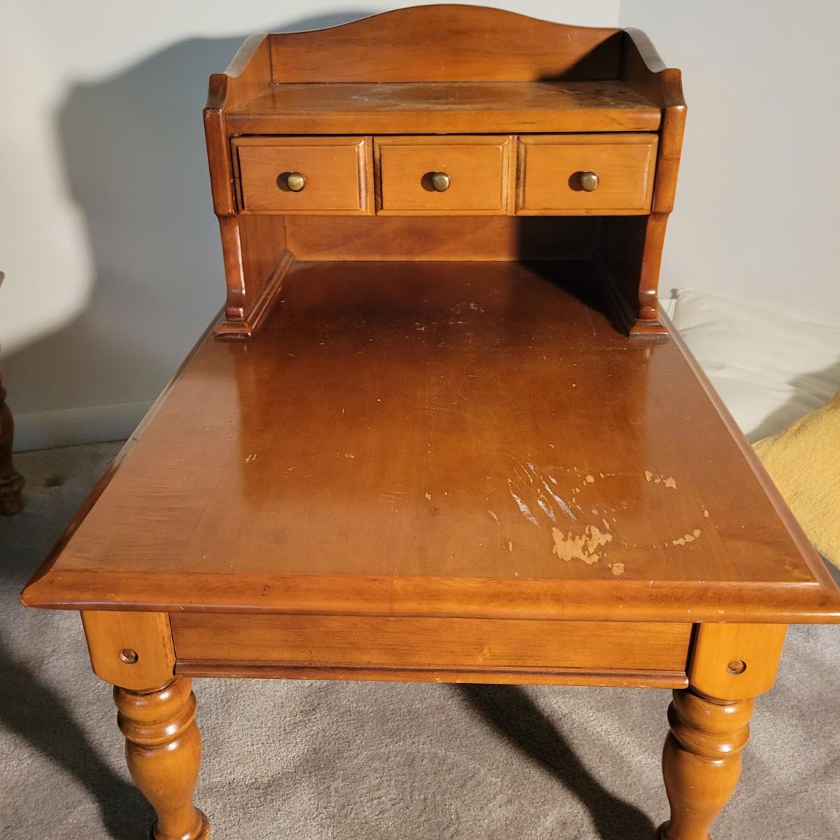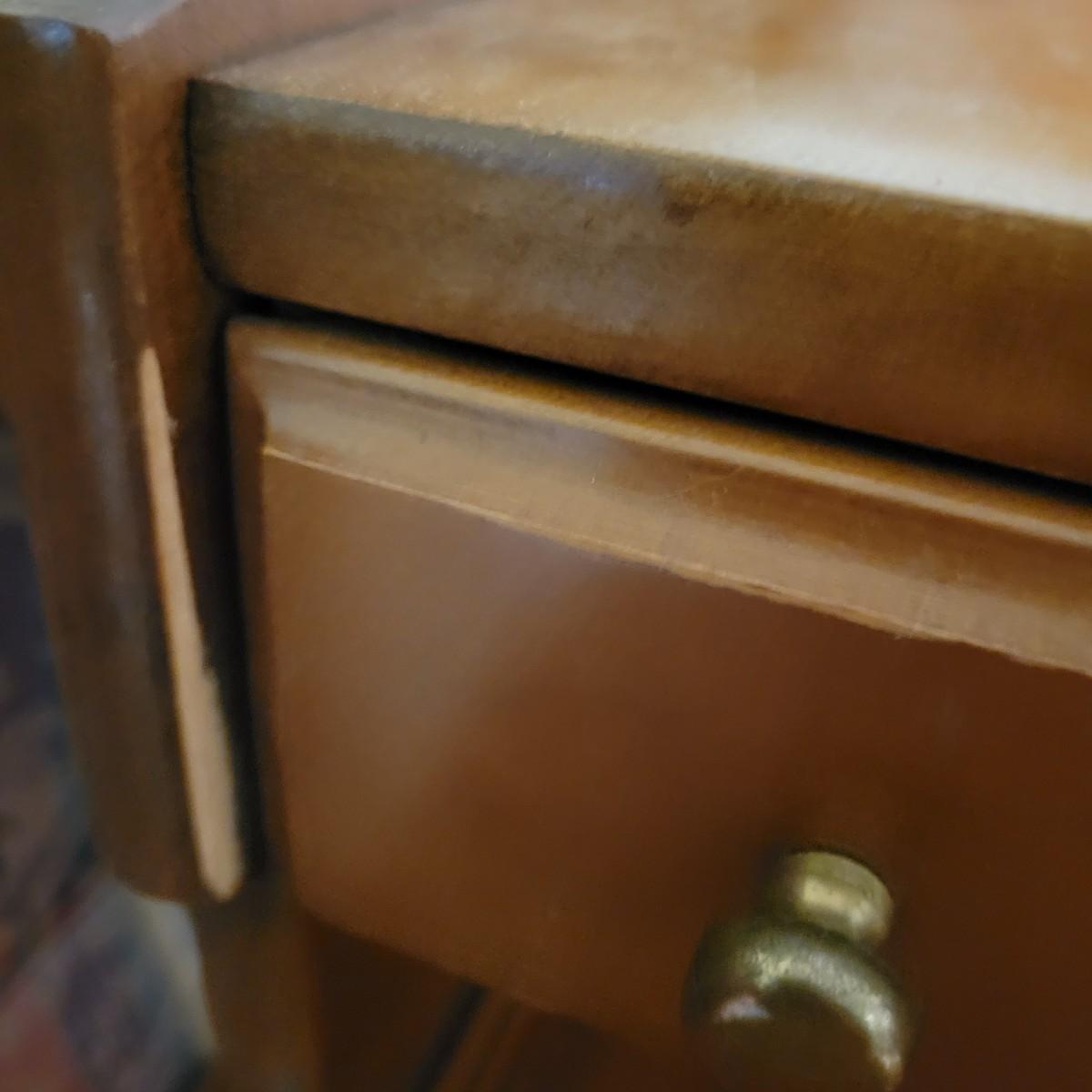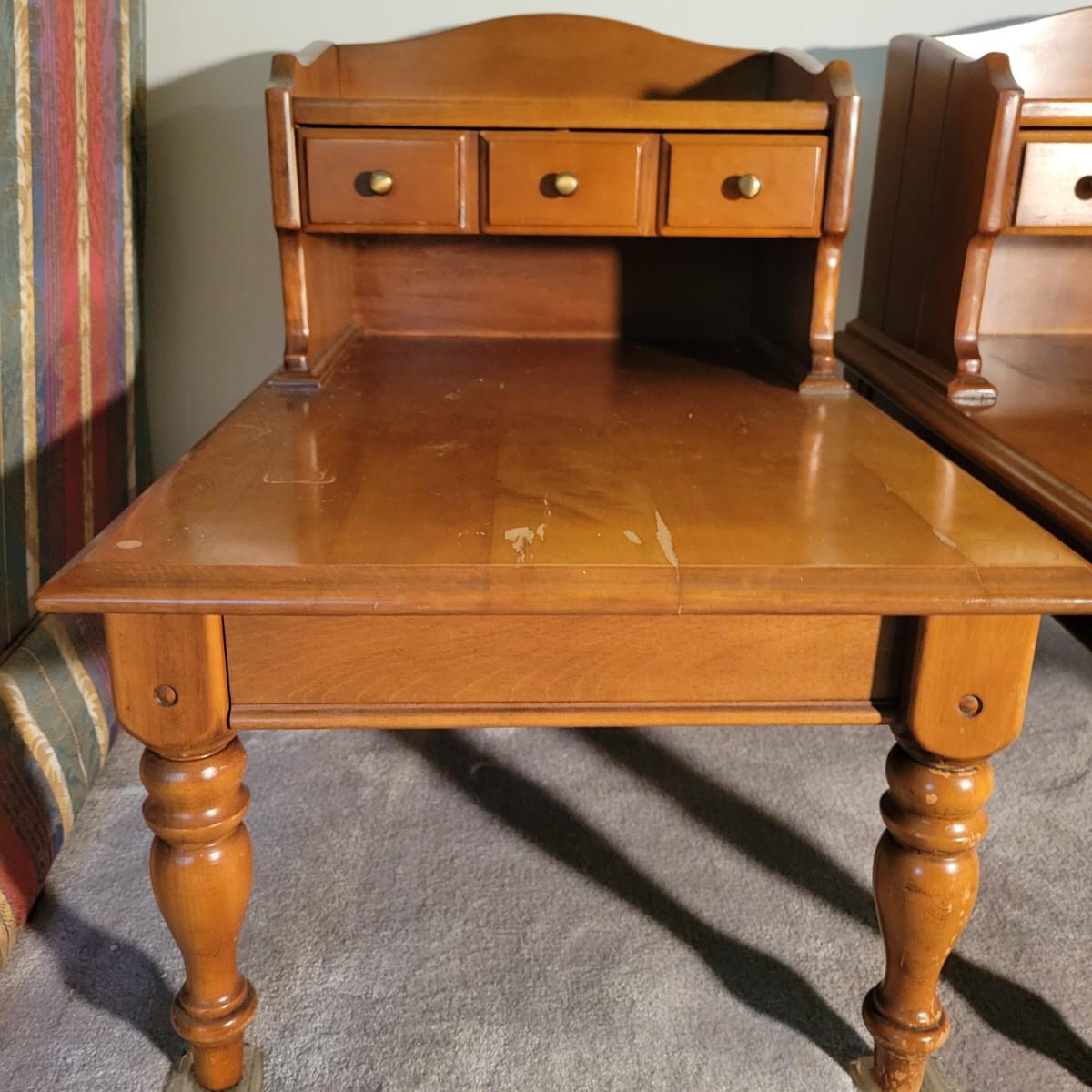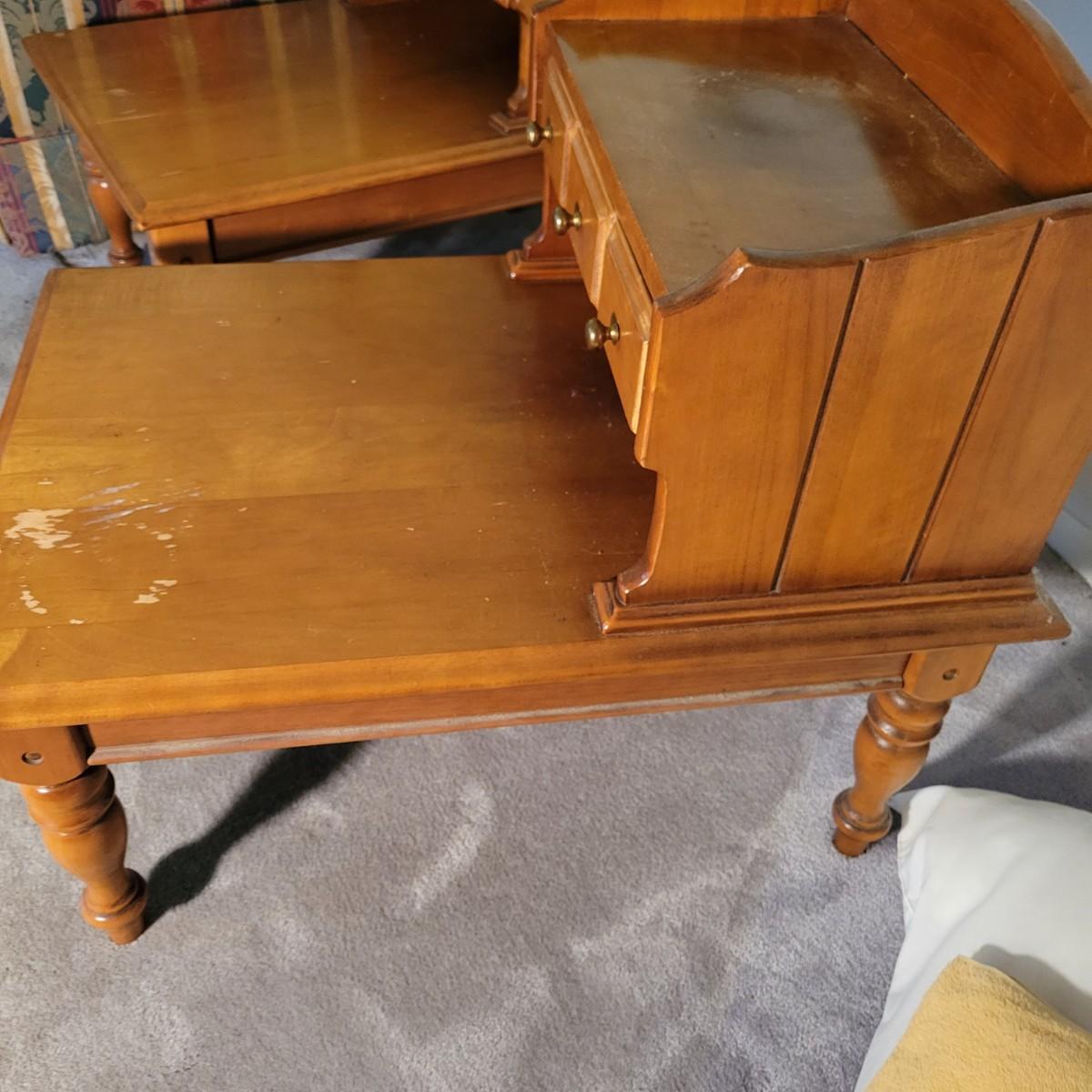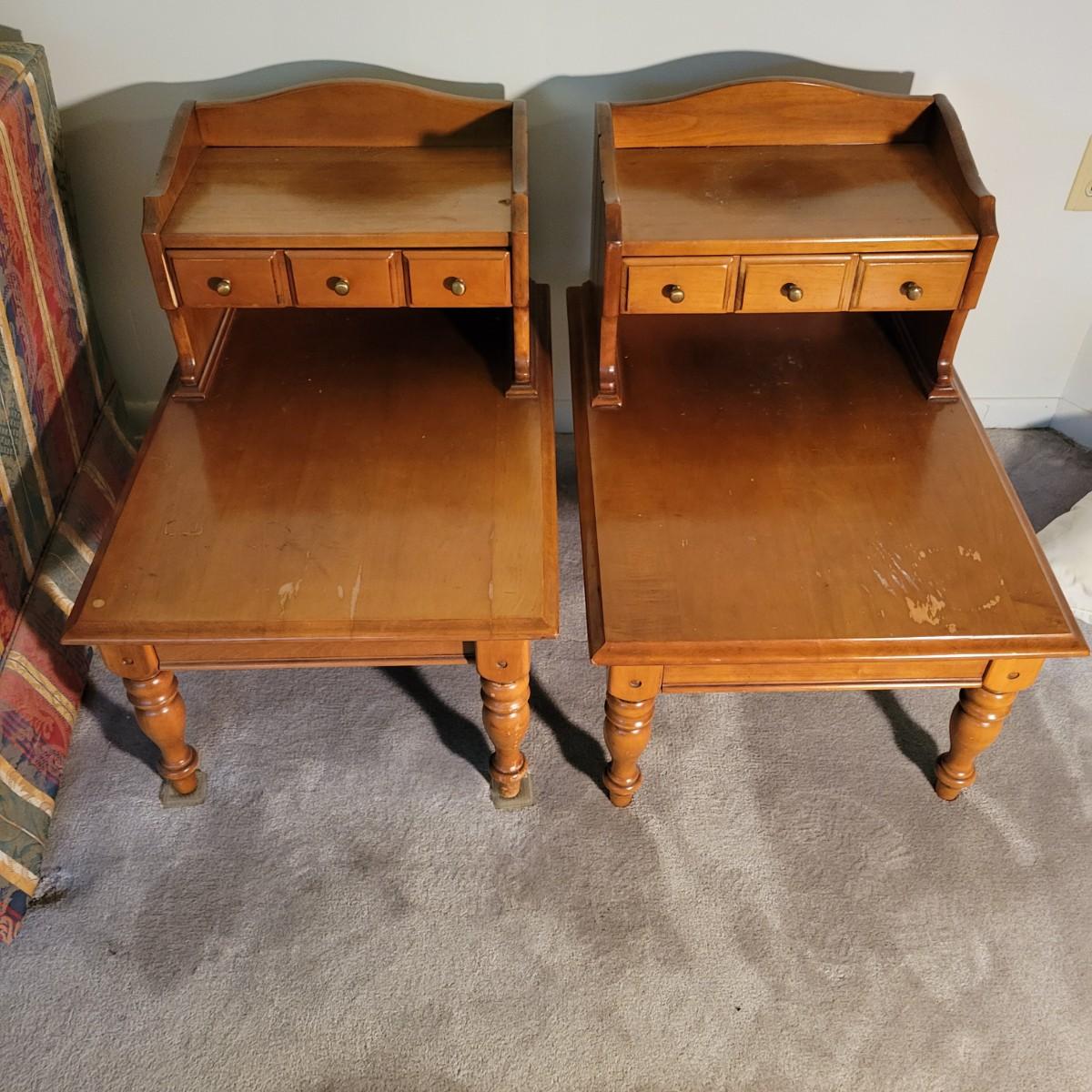 A pair of wooden end tables in fair condition with notable damage and scratches, but could be easily be refinished since it is solid wood. See attached pictures for more detail. Table featuers one drawer with dovetails and brass hardware. Tables measure approximately 20" x 28" x 25" Local pickup only