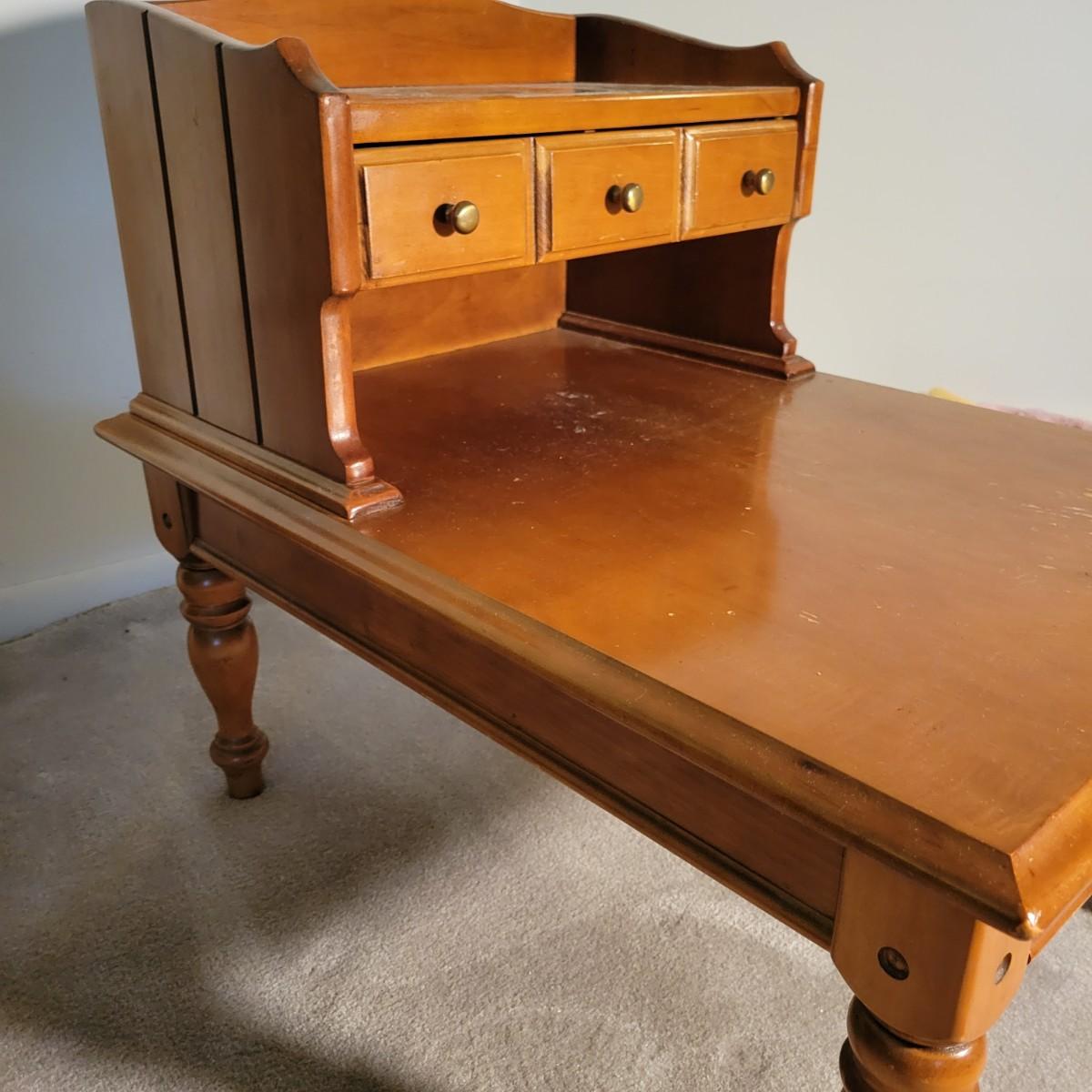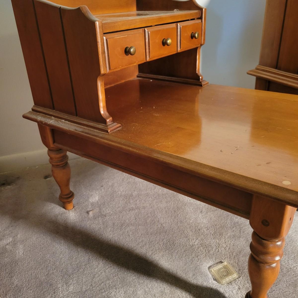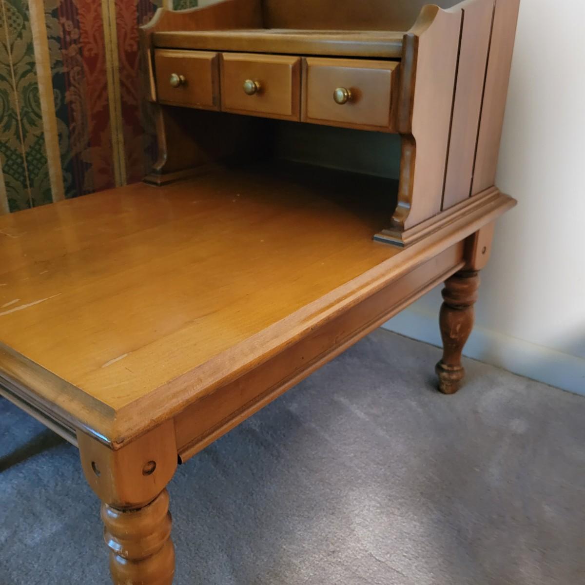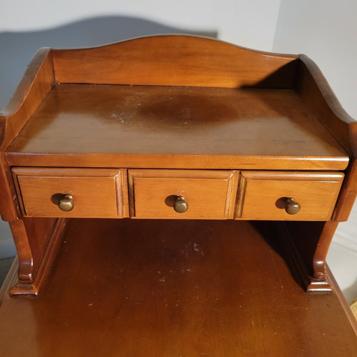A pair of wooden end tables in fair condition with notable damage and scratches, but could be easily be refinished since it is solid wood. See attached pictures for more detail. Table featuers one drawer with dovetails and brass hardware. Tables measure approximately 20" x 28" x 25" Local pickup only