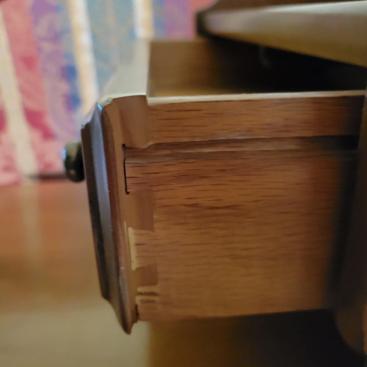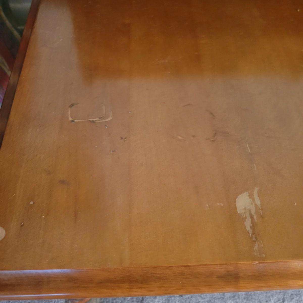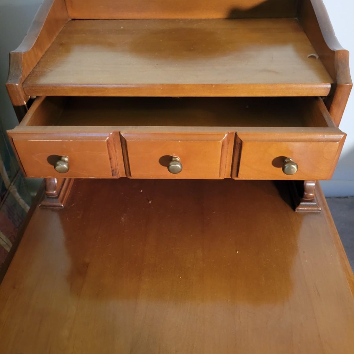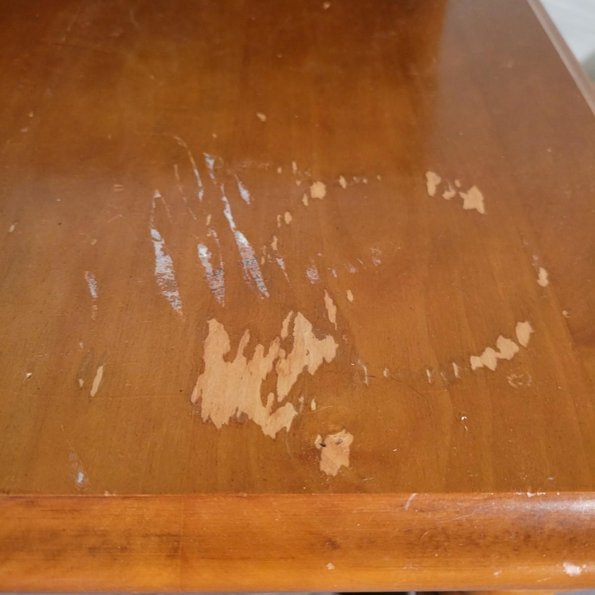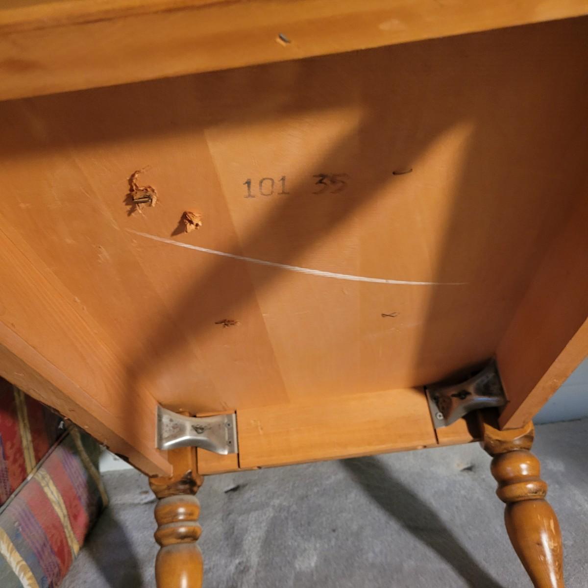 A pair of wooden end tables in fair condition with notable damage and scratches, but could be easily be refinished since it is solid wood. See attached pictures for more detail. Table featuers one drawer with dovetails and brass hardware. Tables measure approximately 20" x 28" x 25" Local pickup only