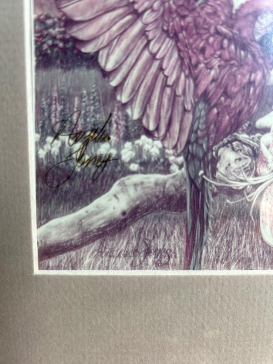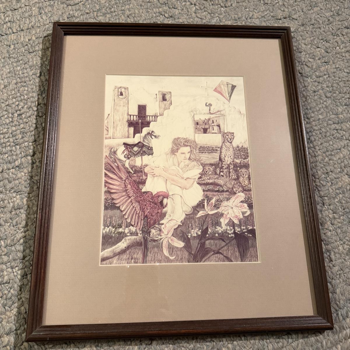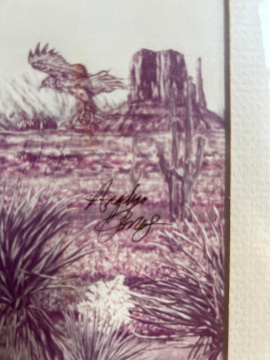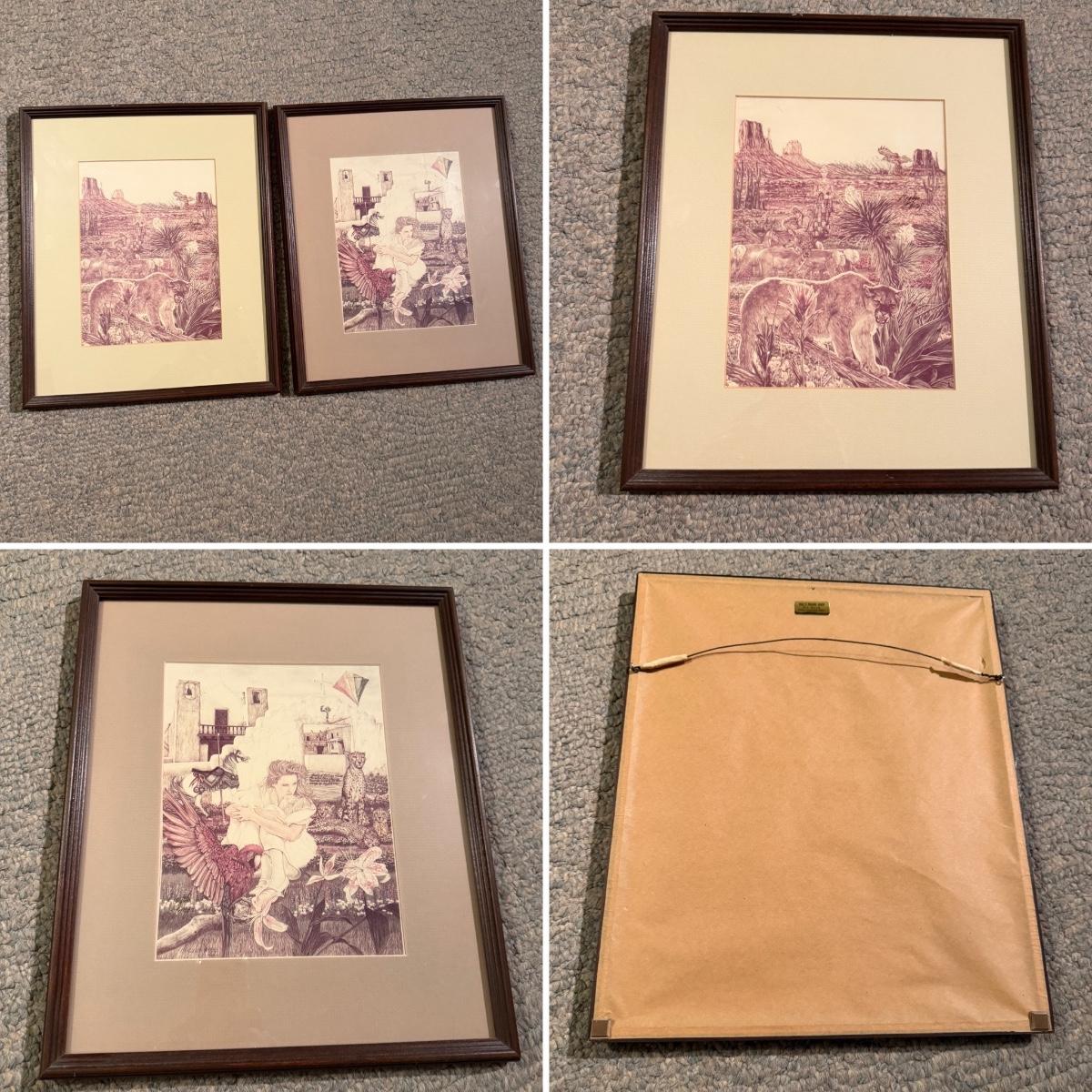 Lot includes two wooden framed and matted art under glass. Both are signed and have writing in the artwork. The subject matter is quite detailed and yet varying compositions. Signature looks like Angelica Jones. Frames measure 12.5” x 15.5”H.