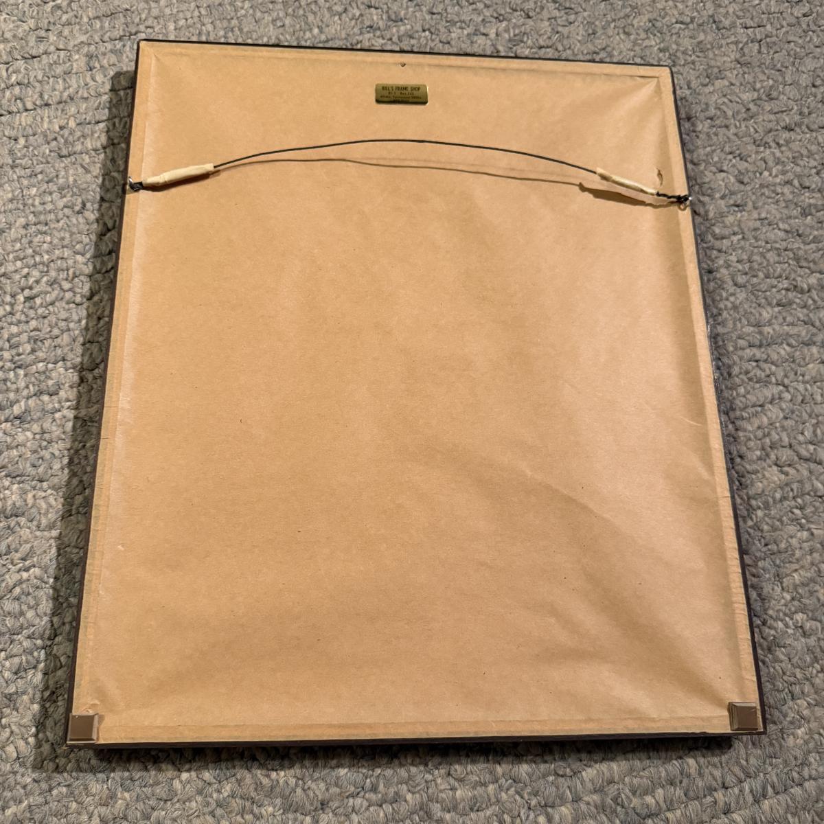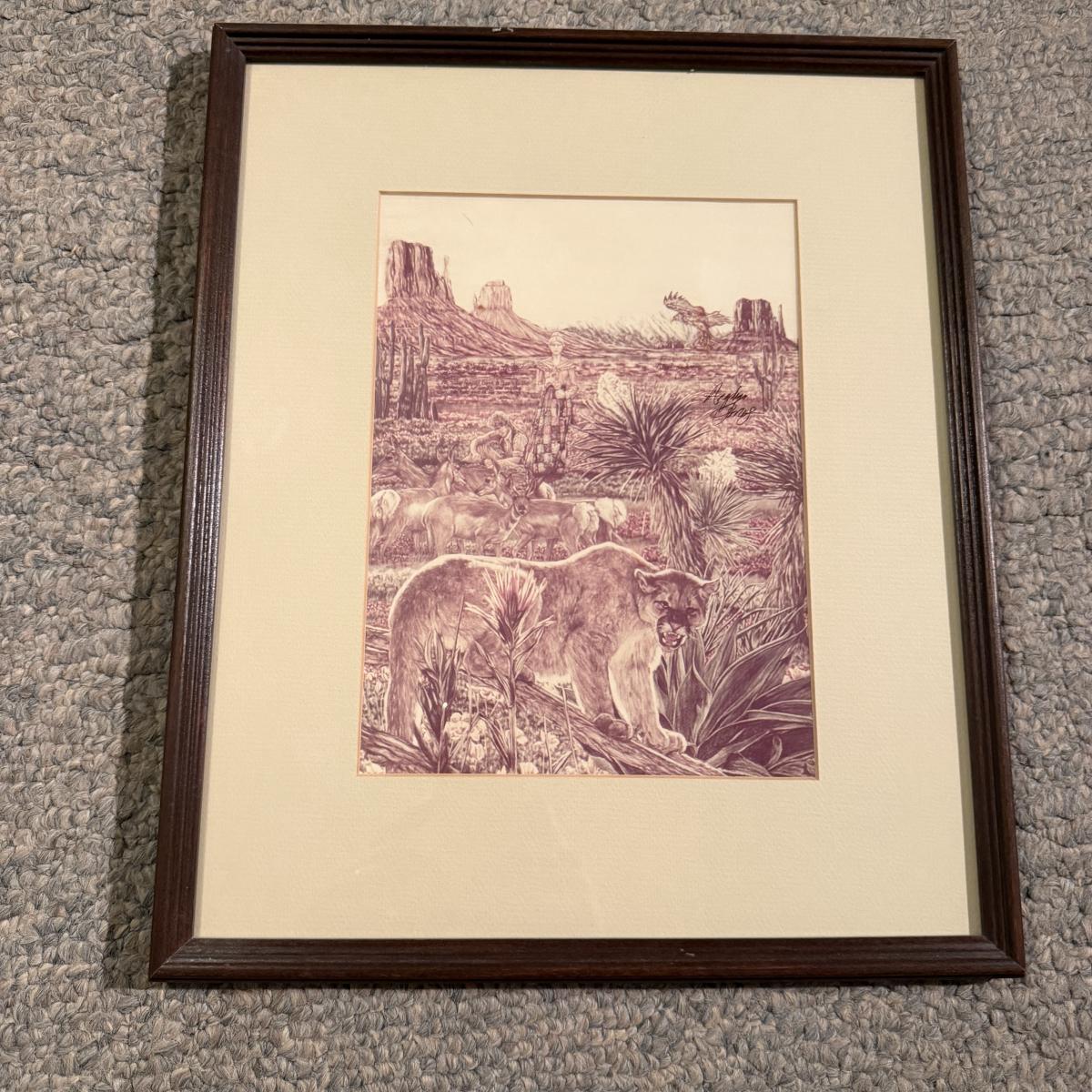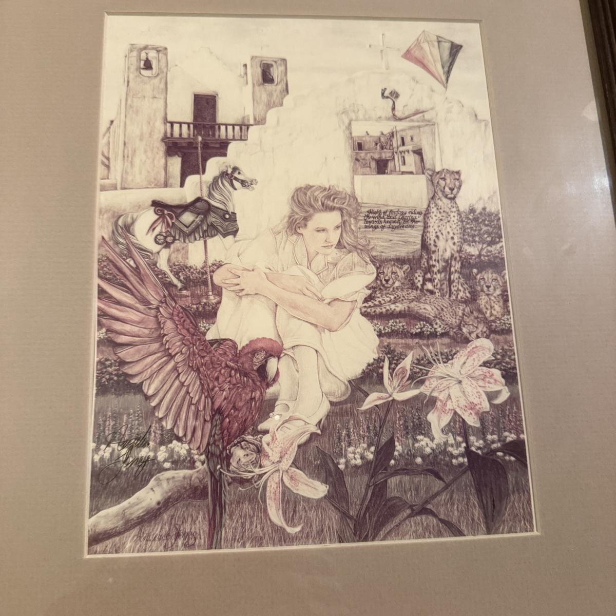 Lot includes two wooden framed and matted art under glass. Both are signed and have writing in the artwork. The subject matter is quite detailed and yet varying compositions. Signature looks like Angelica Jones. Frames measure 12.5” x 15.5”H.