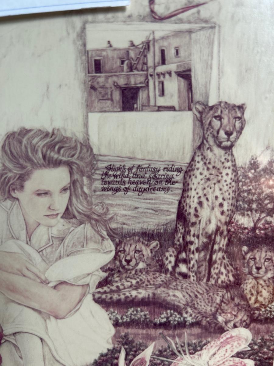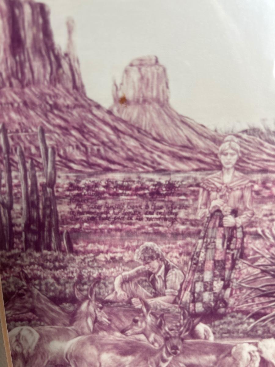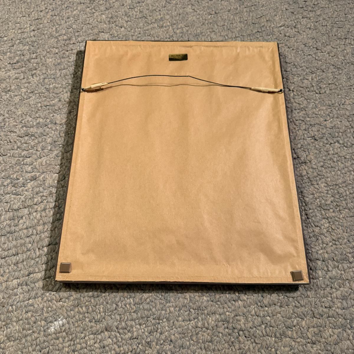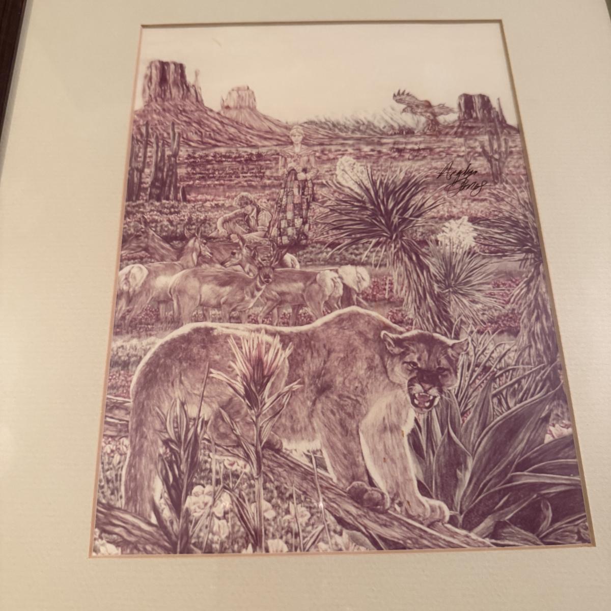 Lot includes two wooden framed and matted art under glass. Both are signed and have writing in the artwork. The subject matter is quite detailed and yet varying compositions. Signature looks like Angelica Jones. Frames measure 12.5” x 15.5”H.