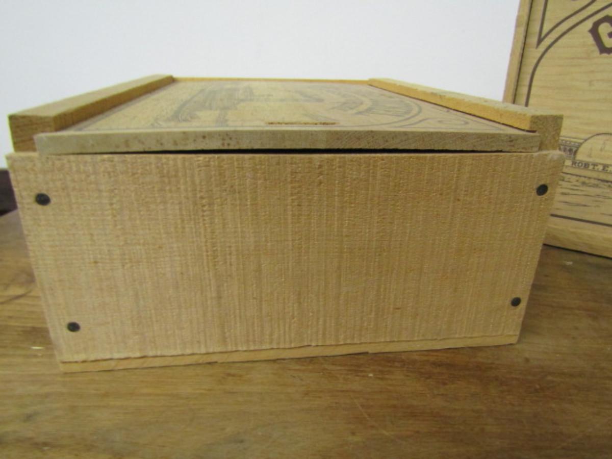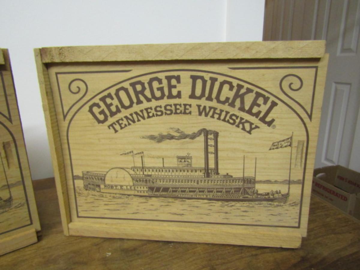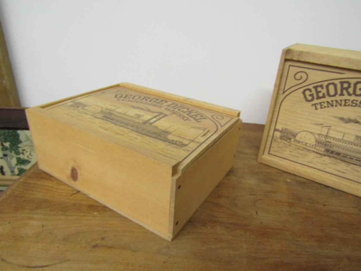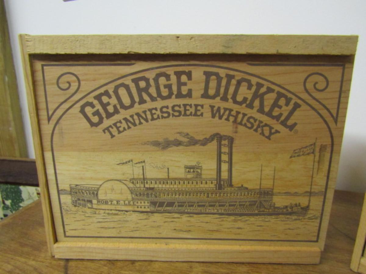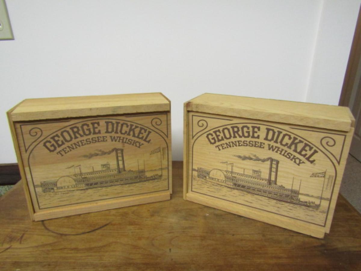Pair of Wooden George Dickel Whisky Boxes with Slide-to-Open Fronts