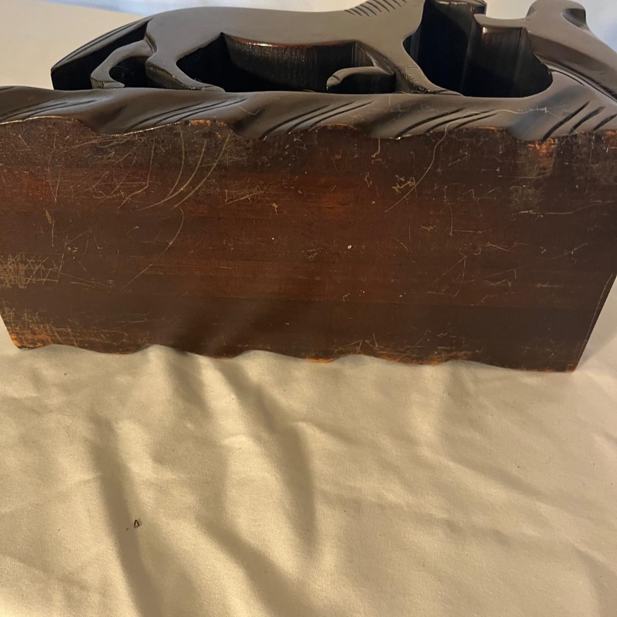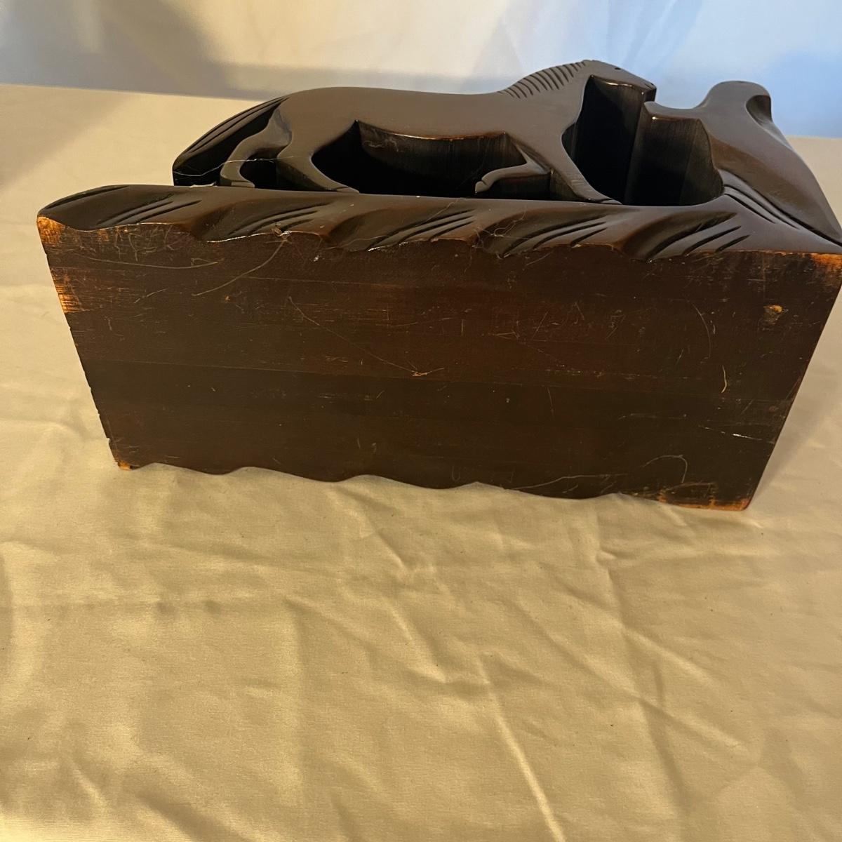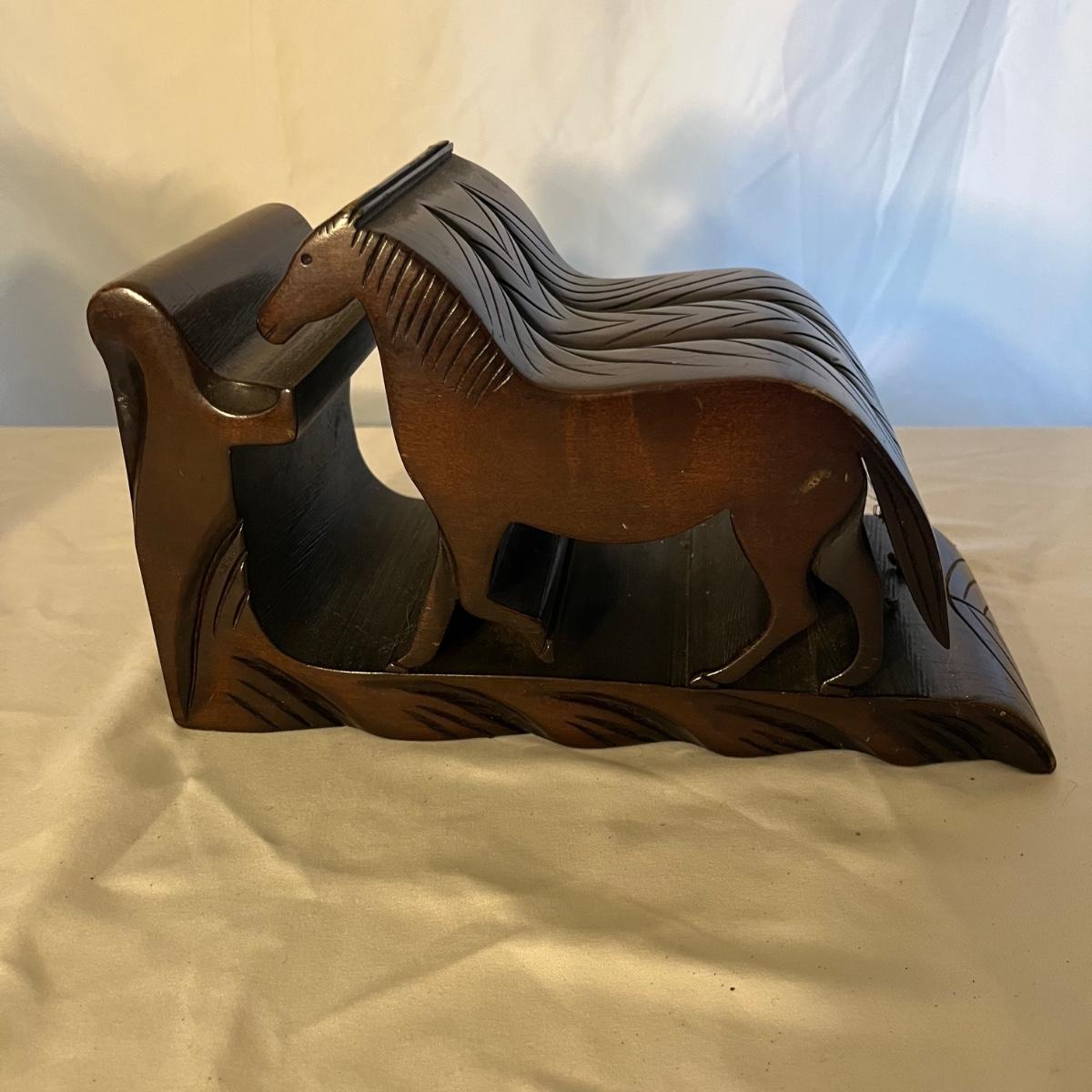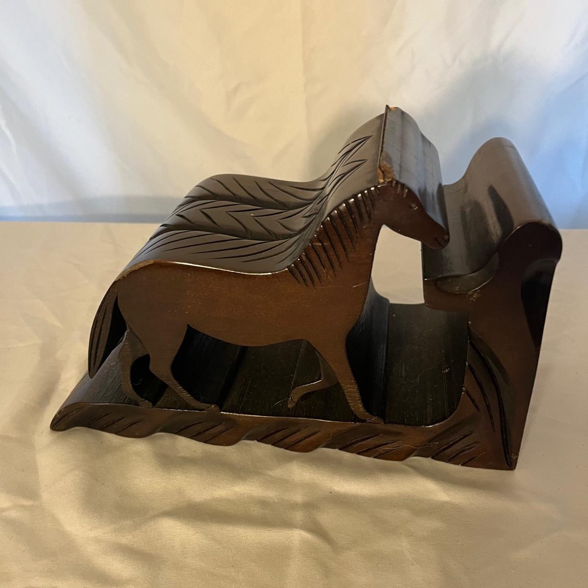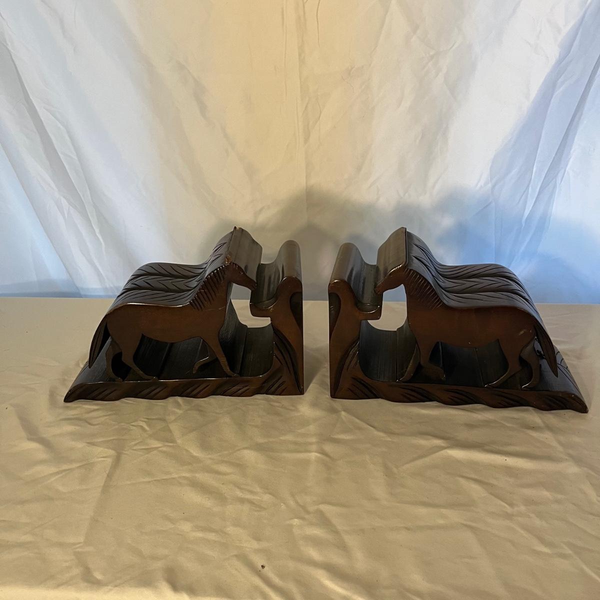 Lot includes a pair of wooden horse bookends. Bookends measure 4.5” x 10” x 6”. There is some chips by horses ears, see pictures.