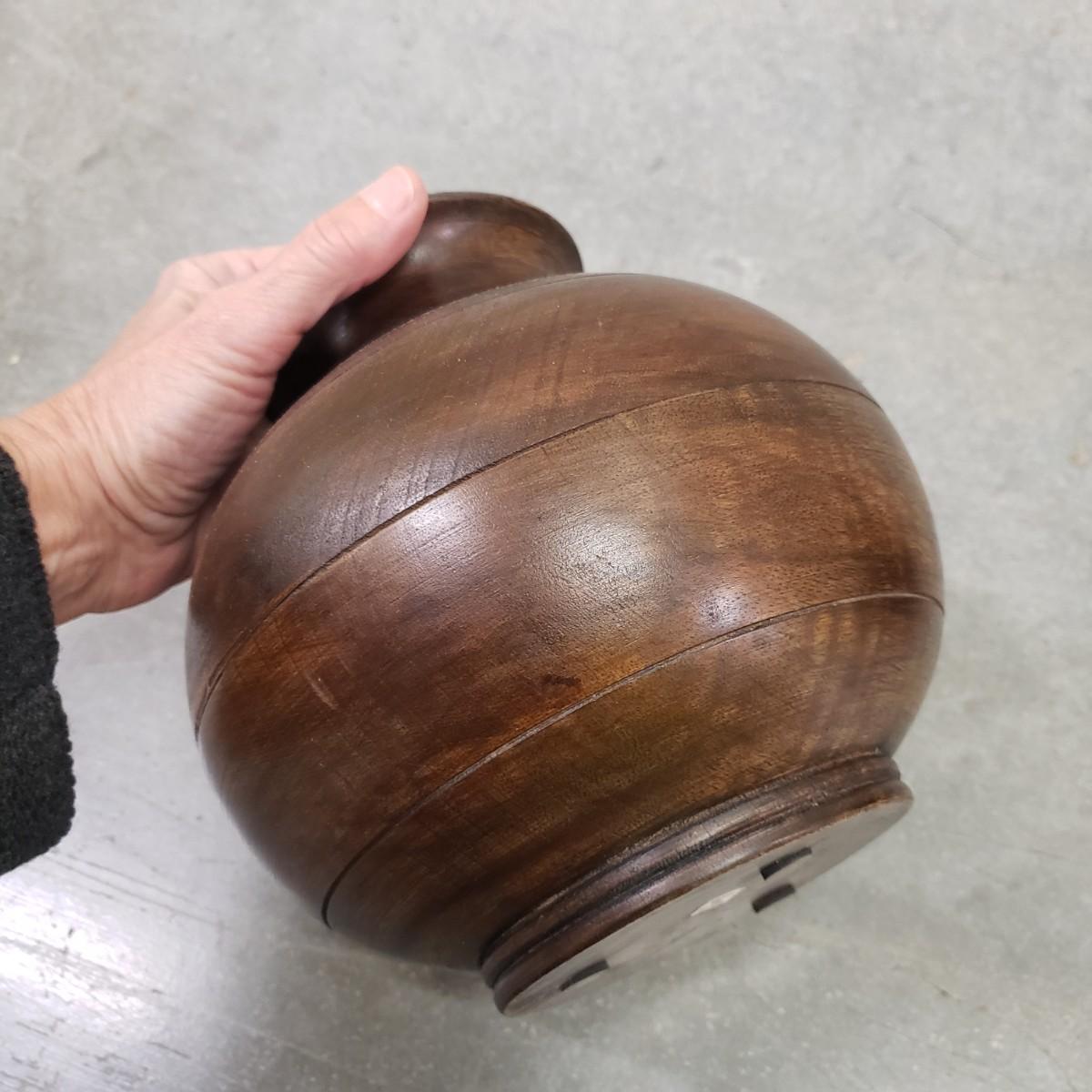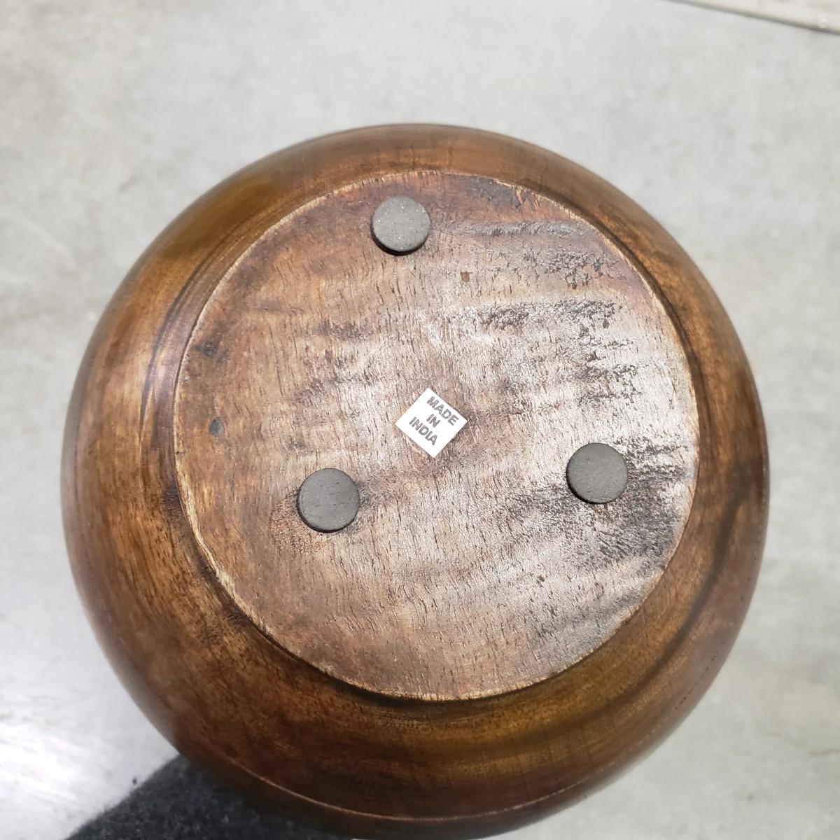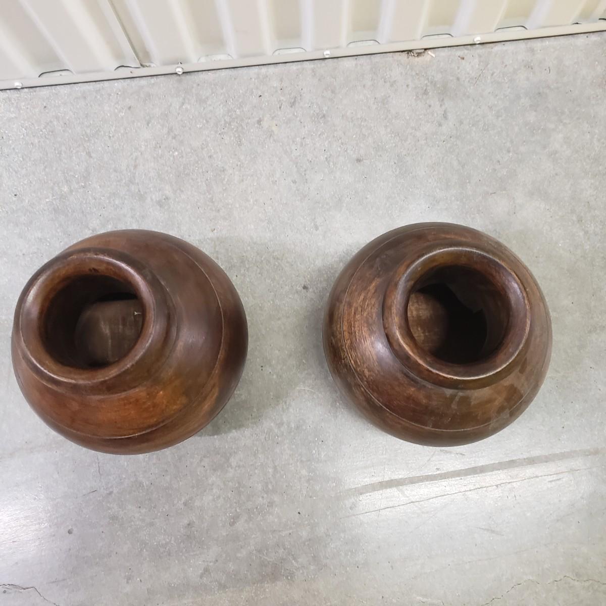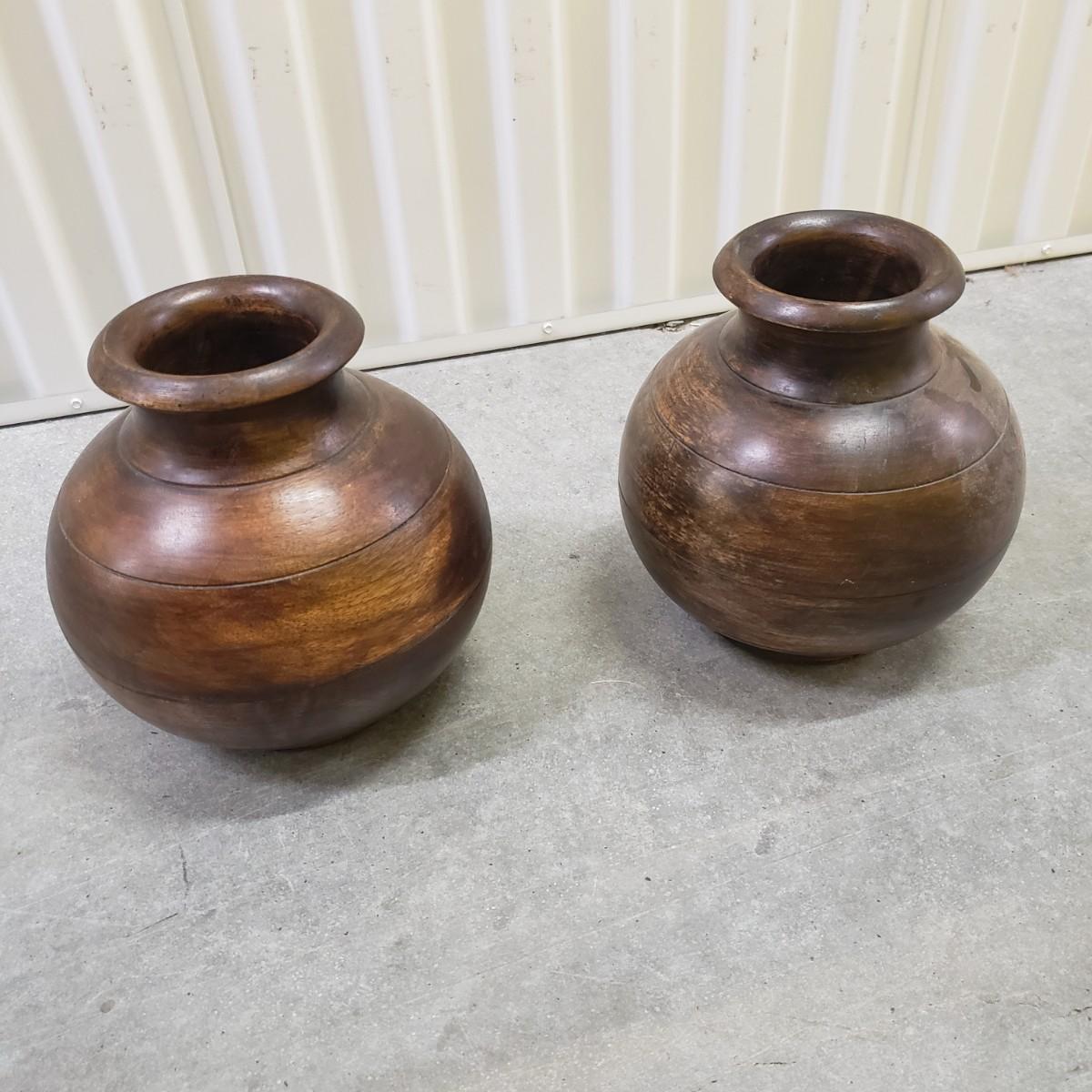 This gorgeous pair of turned wooden vases were made in India. They measure approximately 8" x 8"H. They each have three rubber stays on the bottom. There are two engraved lines around the middle.
