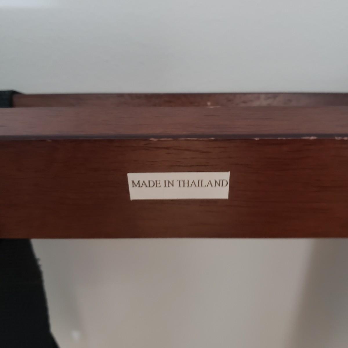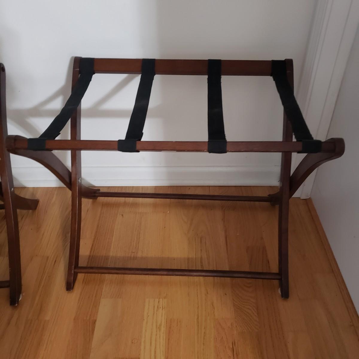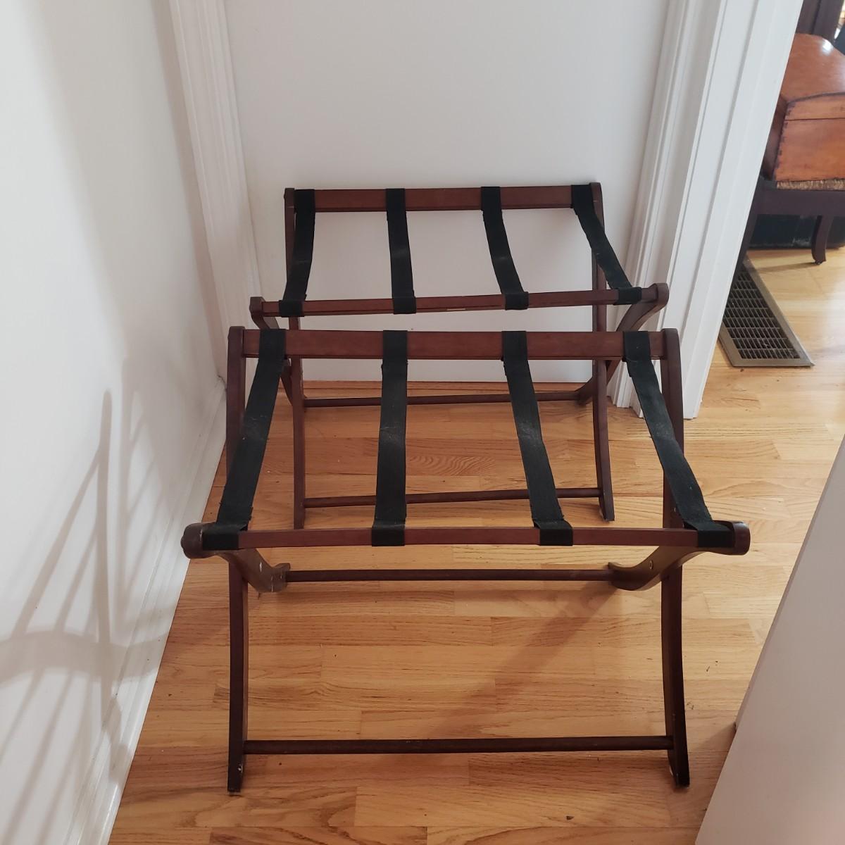 These are a wooden pair of luggage racks made in Thailand. The straps are black nylon and sturdy. Each rack measures 18" x 25" x 21"H.
