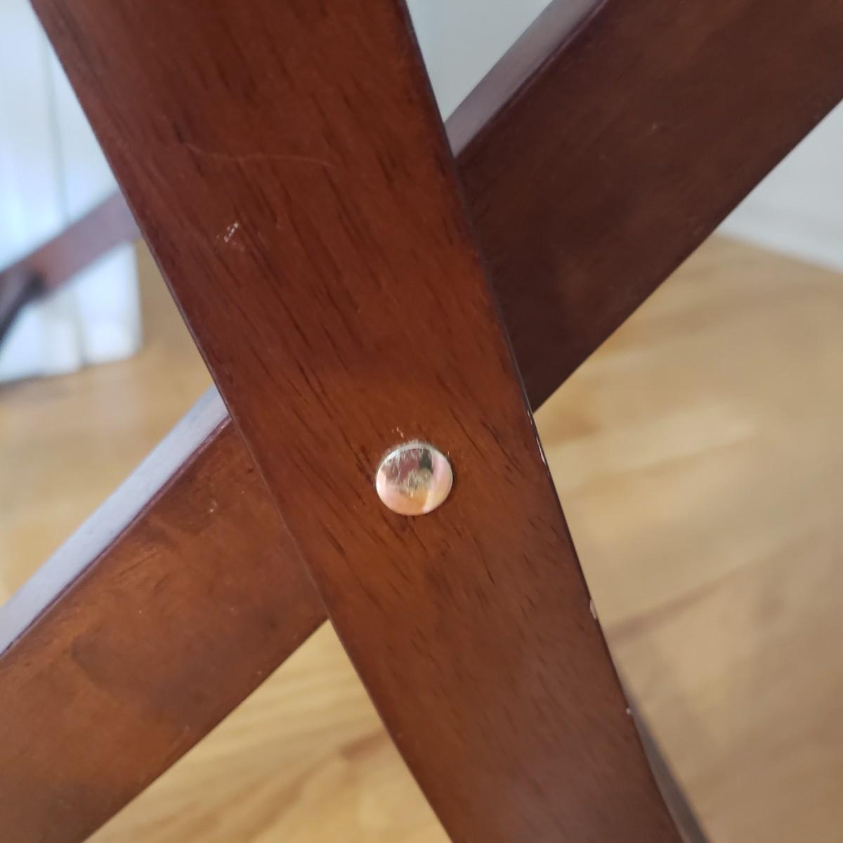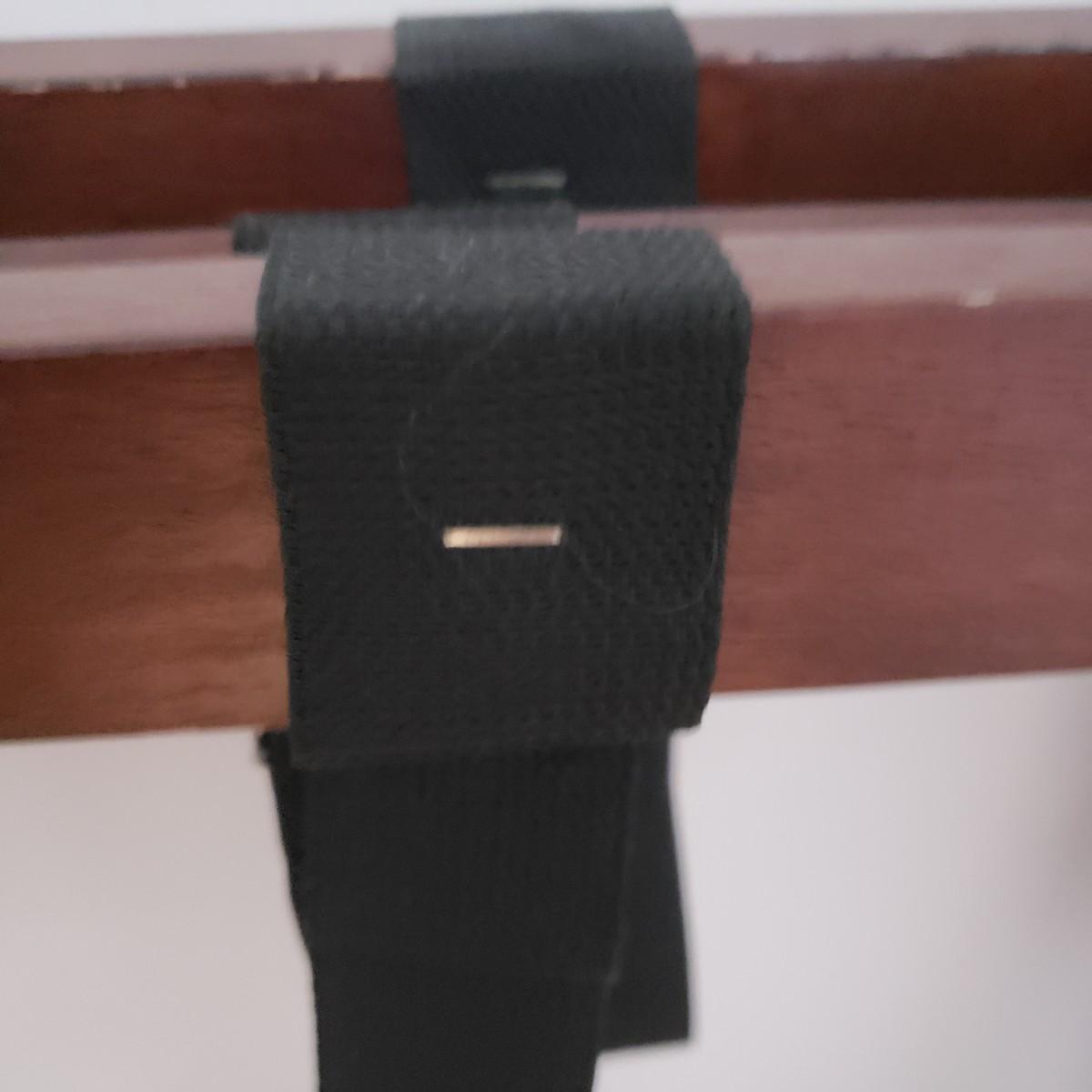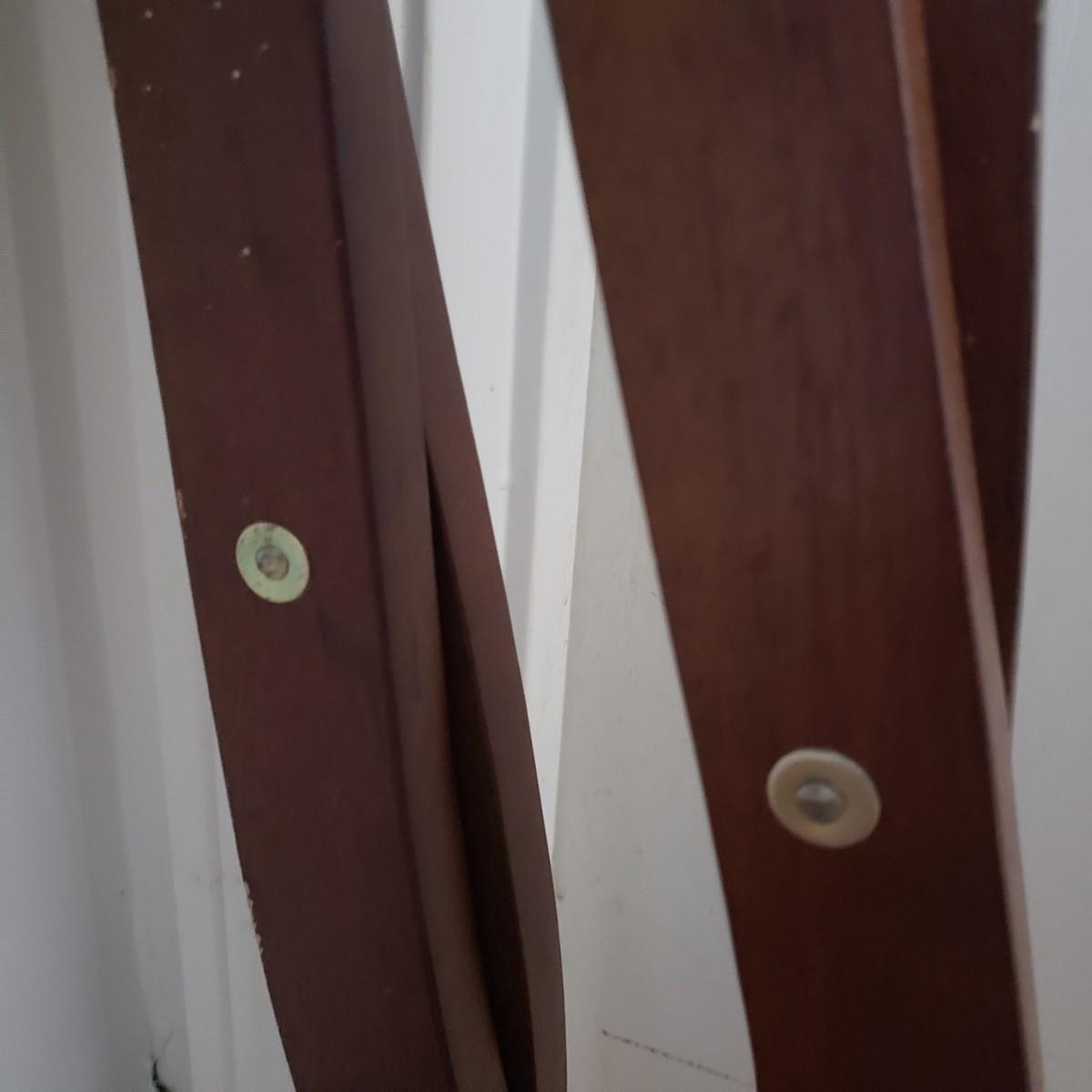 These are a wooden pair of luggage racks made in Thailand. The straps are black nylon and sturdy. Each rack measures 18" x 25" x 21"H.