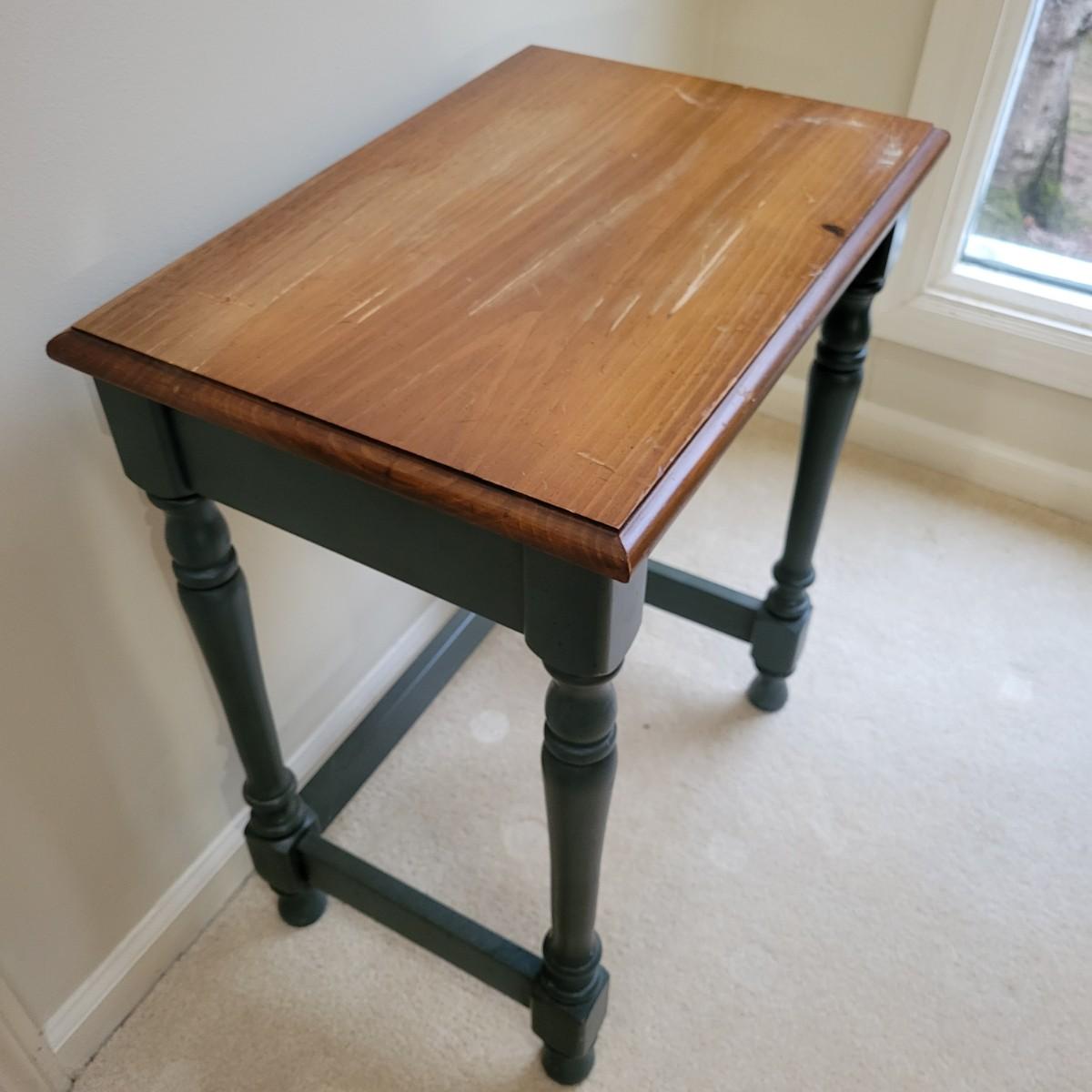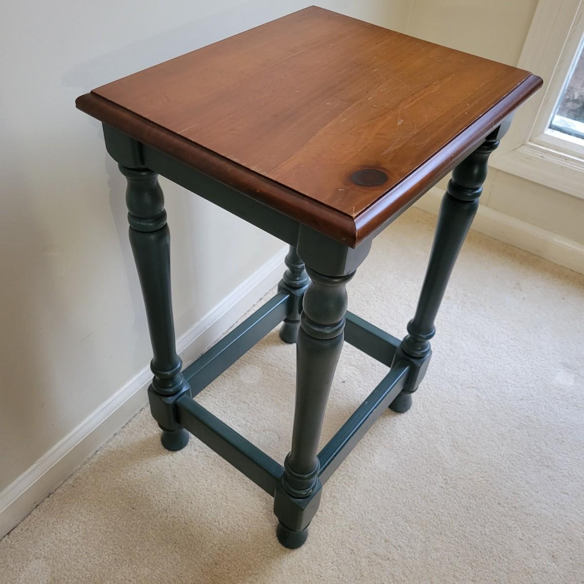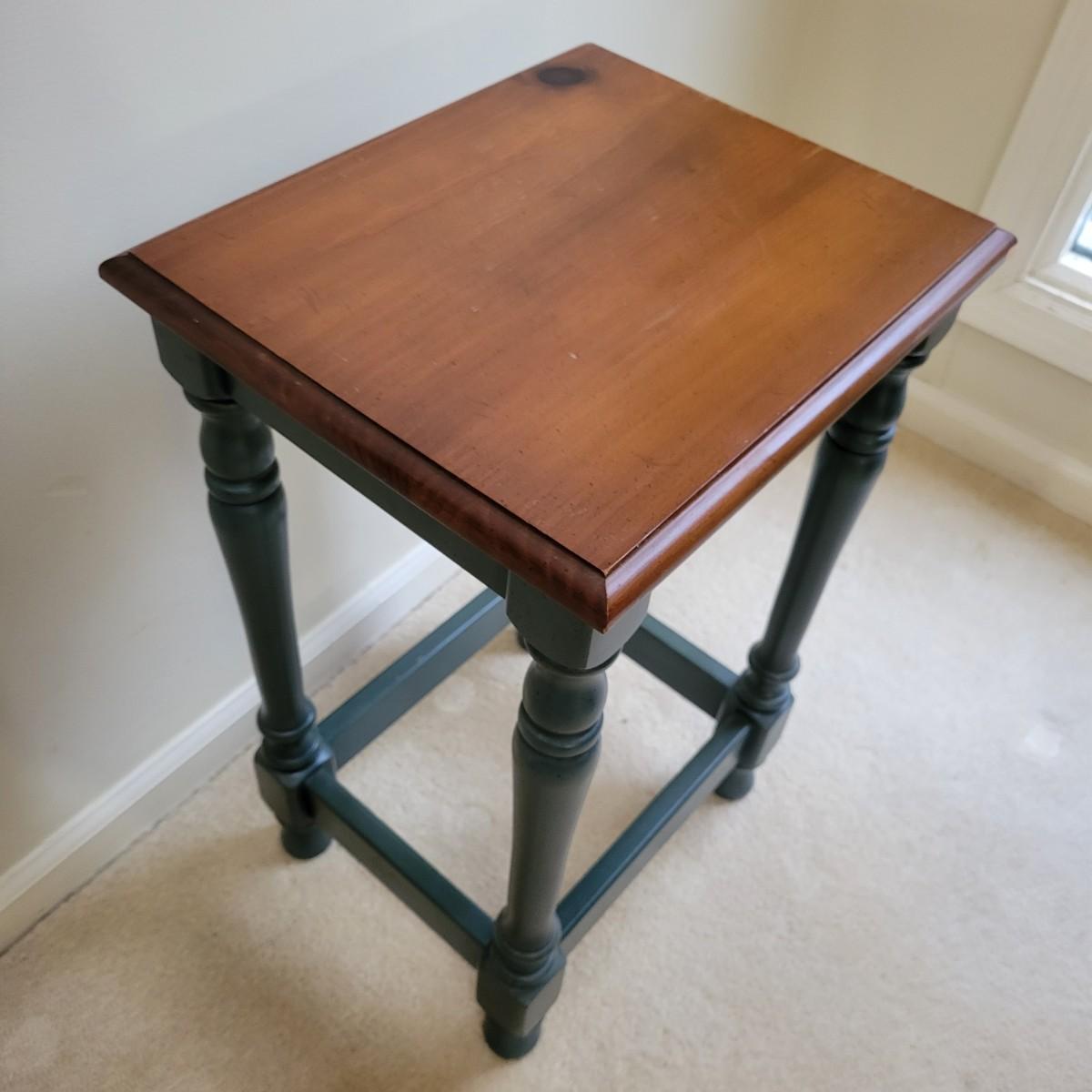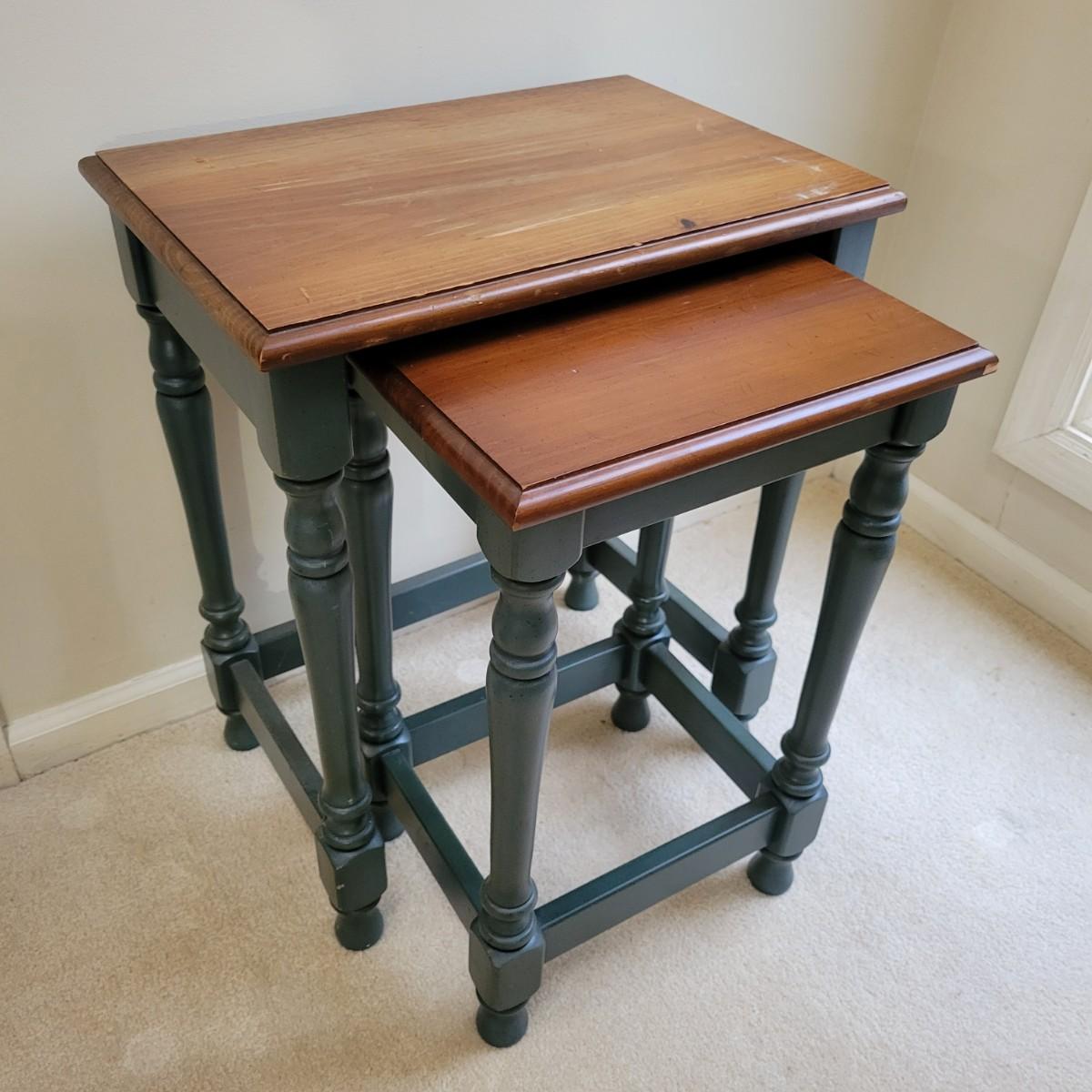 A pair of wooden nesting tables in good condition with some minor blemishes and scratches. These tables have medium stained tops with blue legs. The smaller table does have a slightly darker stain, likely from the larger table having sun fading. Larger table measures approximately 19" x 13" x 23". Local pickup only