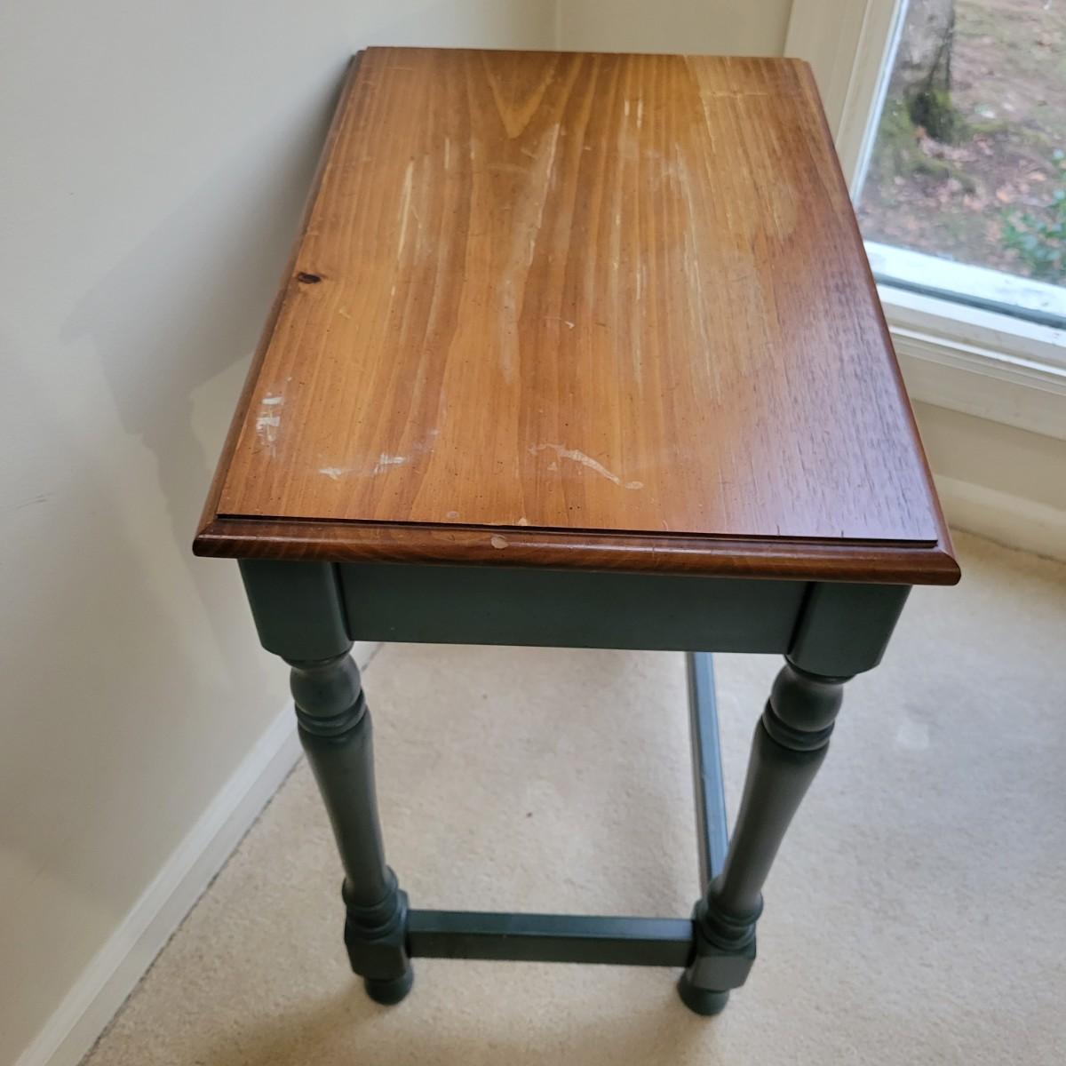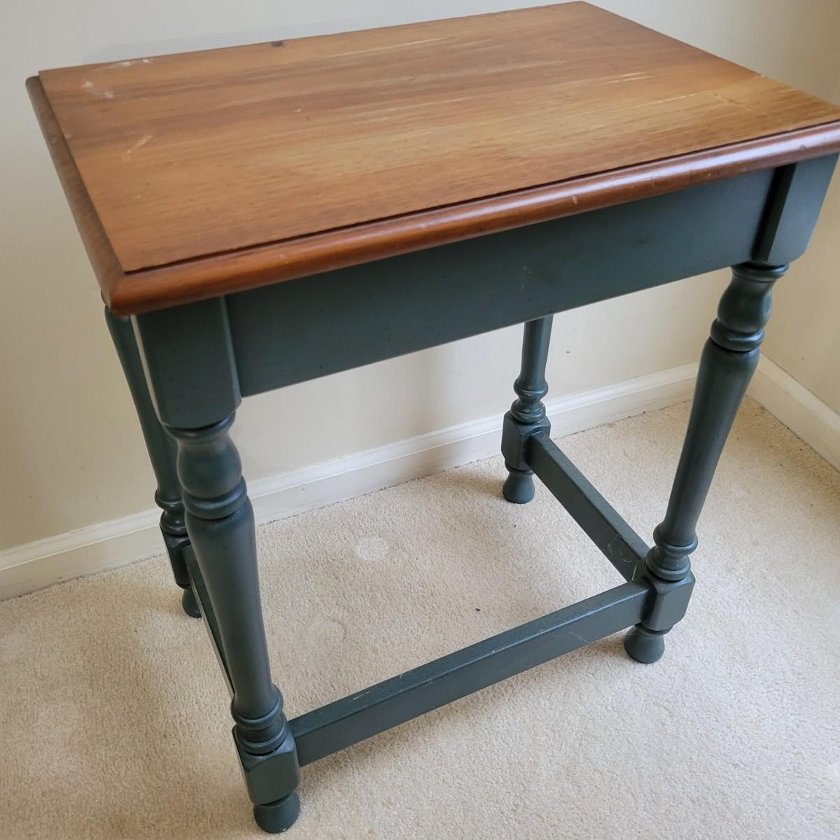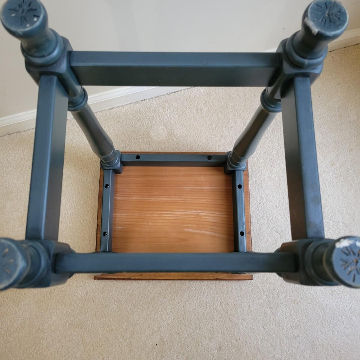 A pair of wooden nesting tables in good condition with some minor blemishes and scratches. These tables have medium stained tops with blue legs. The smaller table does have a slightly darker stain, likely from the larger table having sun fading. Larger table measures approximately 19" x 13" x 23". Local pickup only