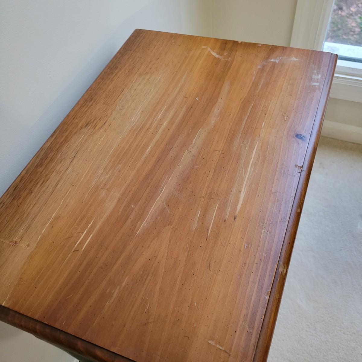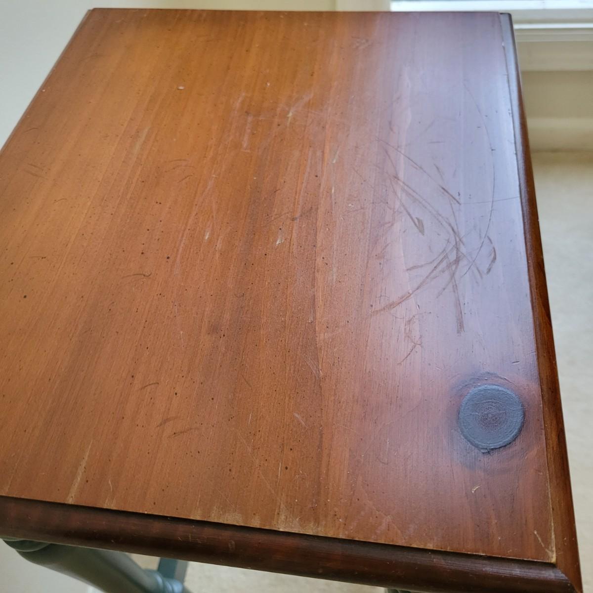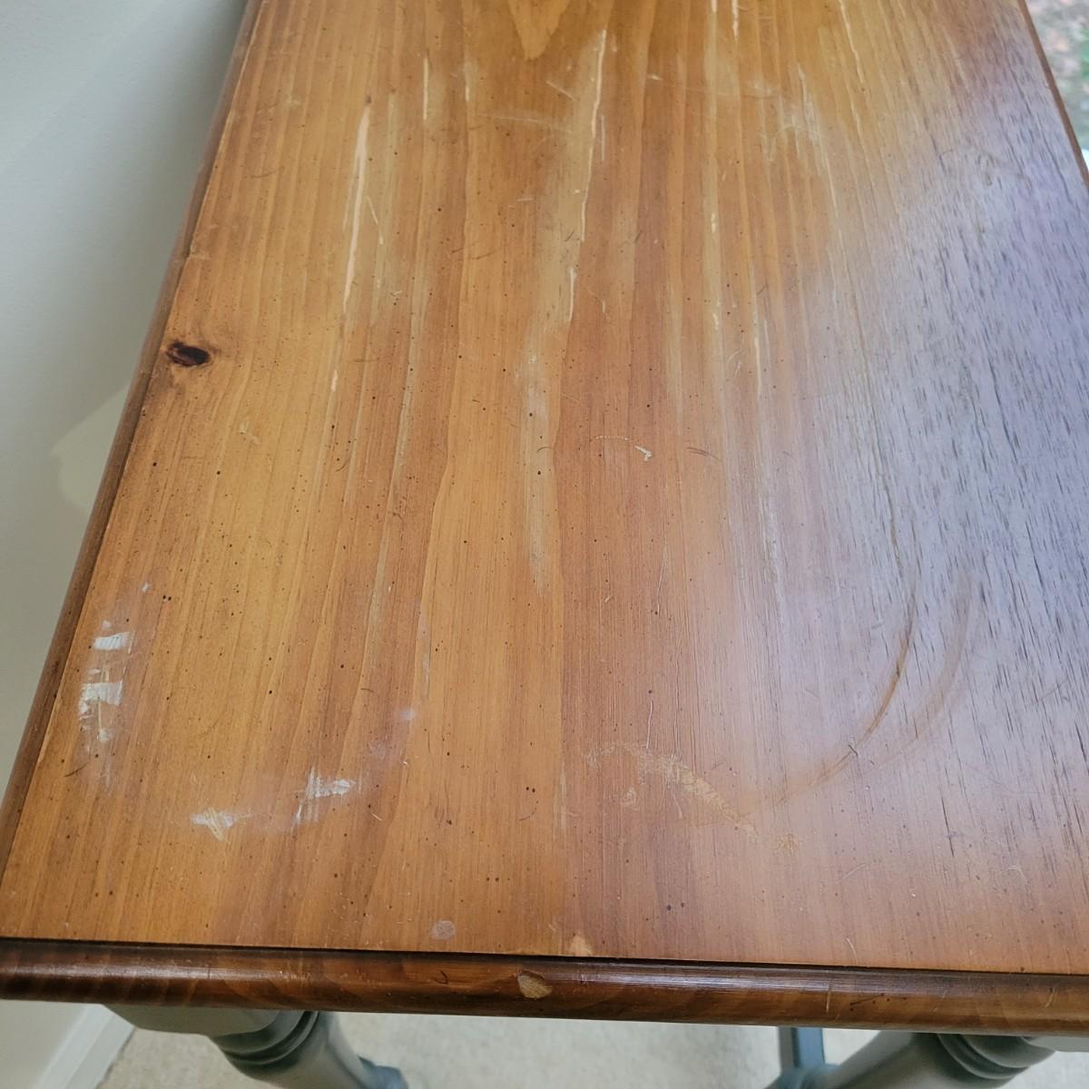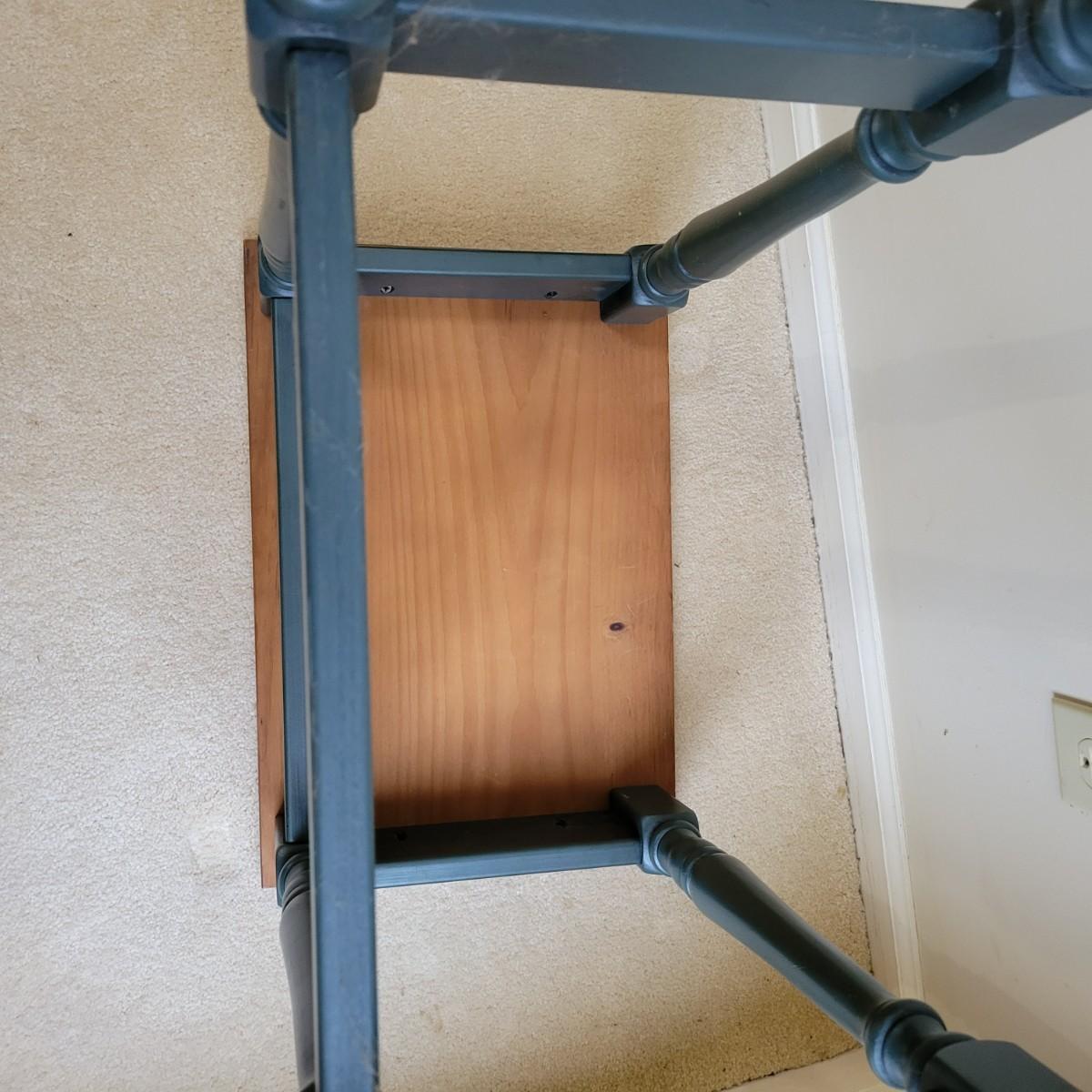 A pair of wooden nesting tables in good condition with some minor blemishes and scratches. These tables have medium stained tops with blue legs. The smaller table does have a slightly darker stain, likely from the larger table having sun fading. Larger table measures approximately 19" x 13" x 23". Local pickup only