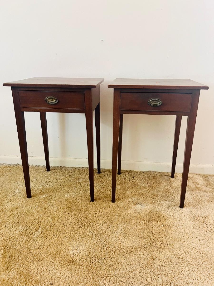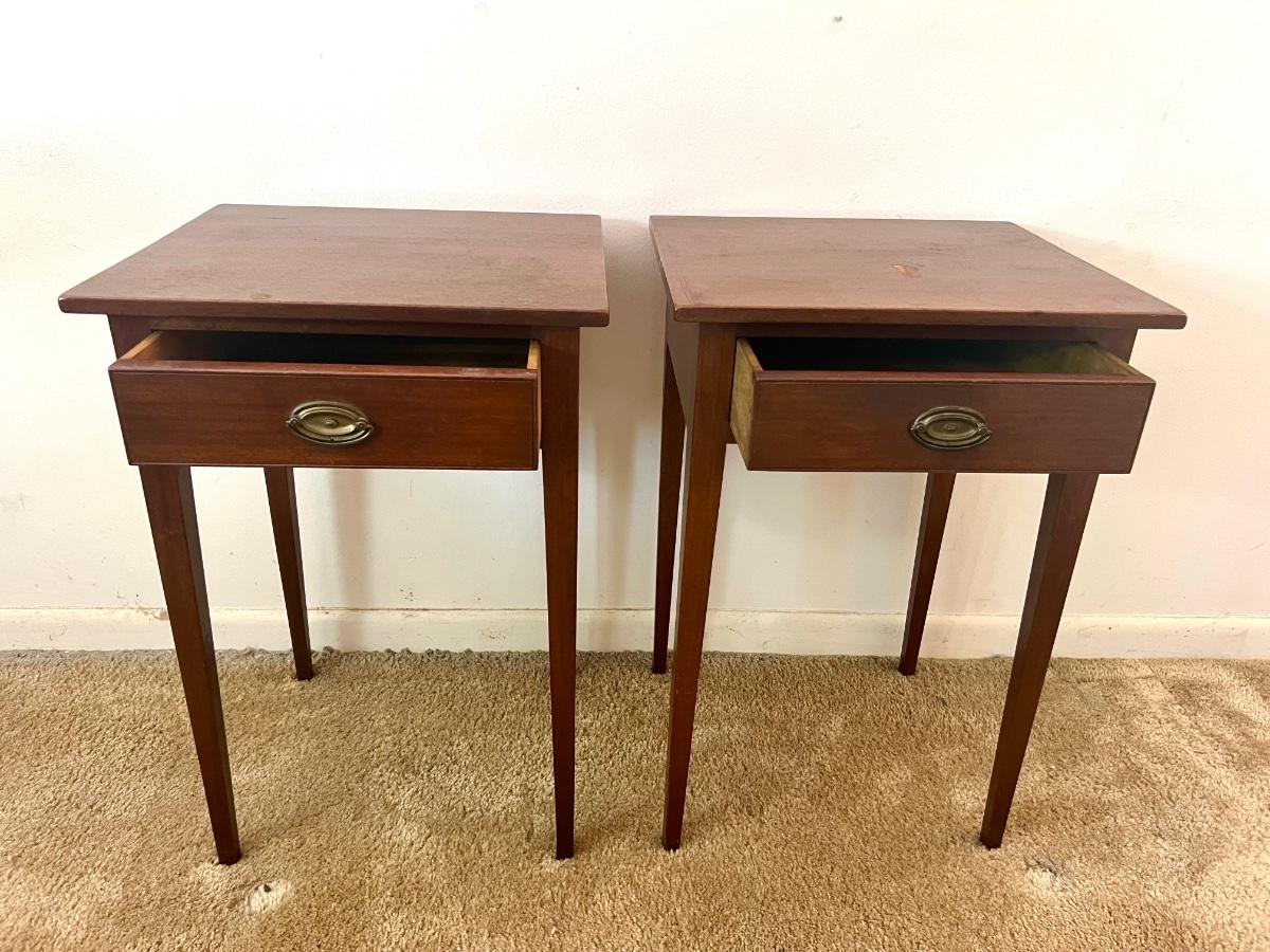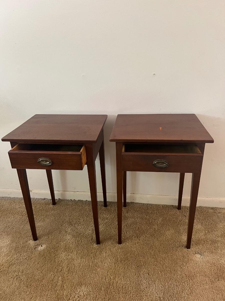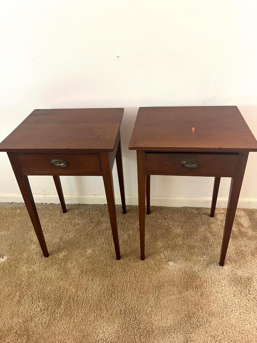 Pair Of Wooden Night stands, each has one drawer. Measures 27 inches tall, 16 inches deep and 18 inches long. One night stand has an imperfection. See pictures.