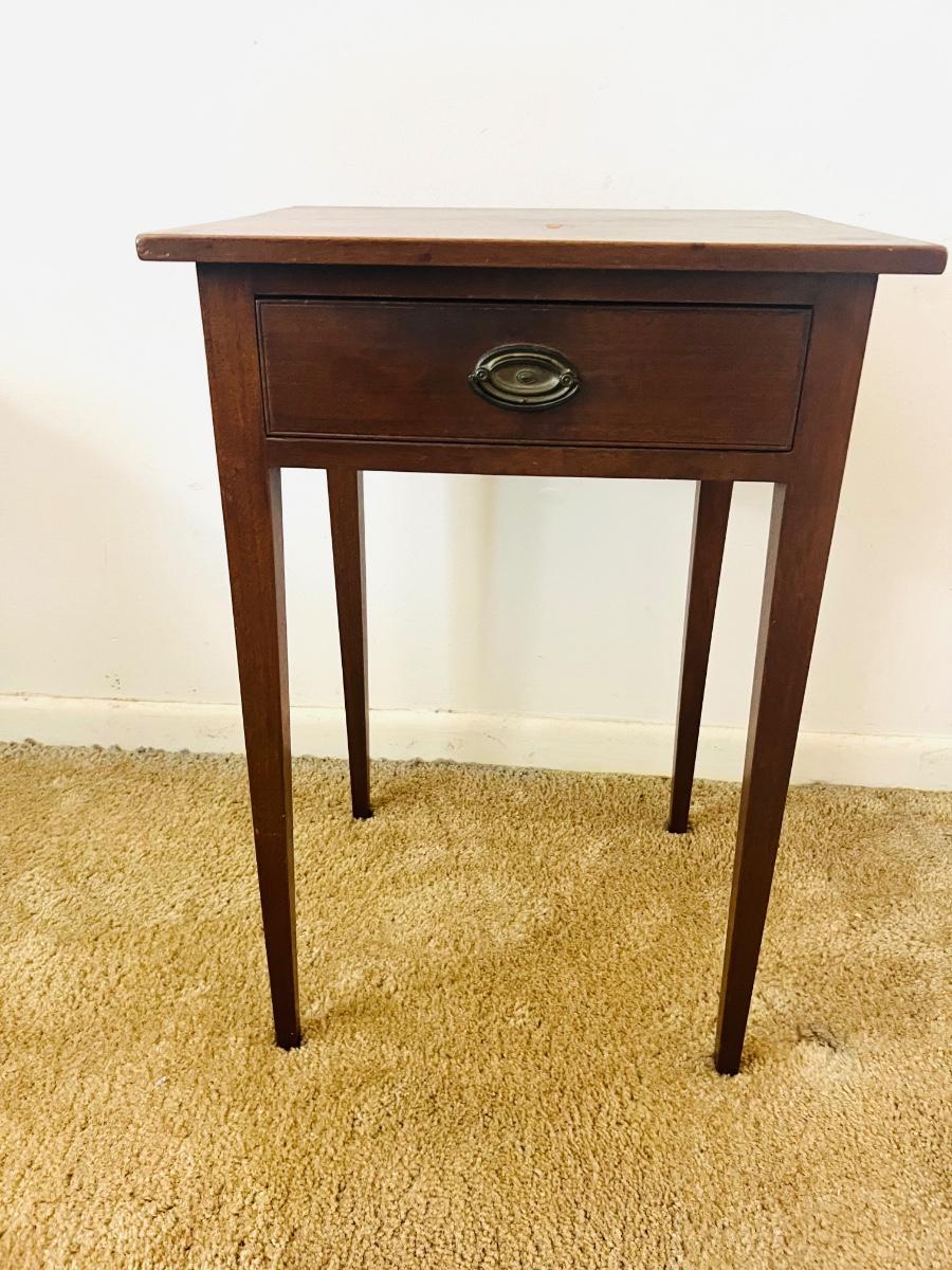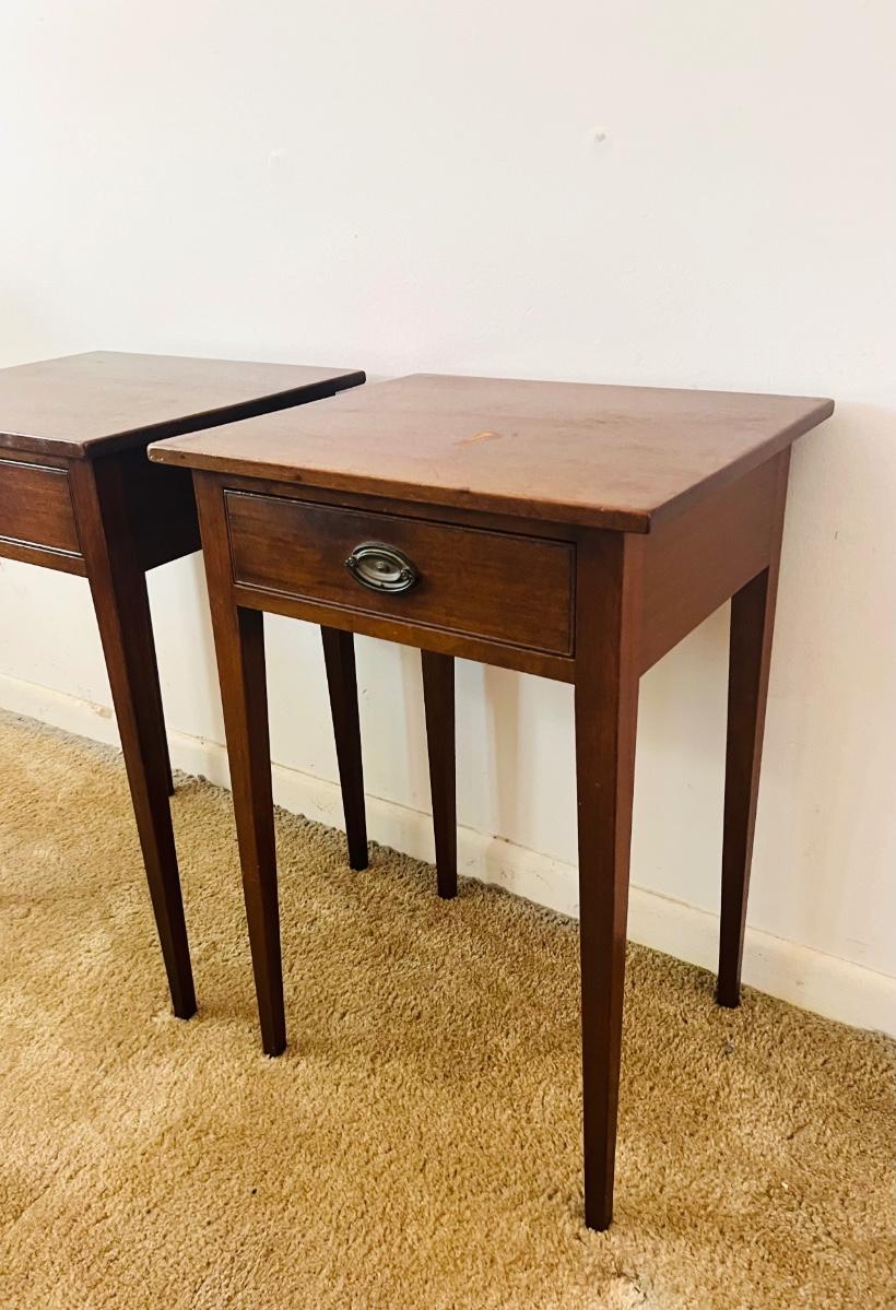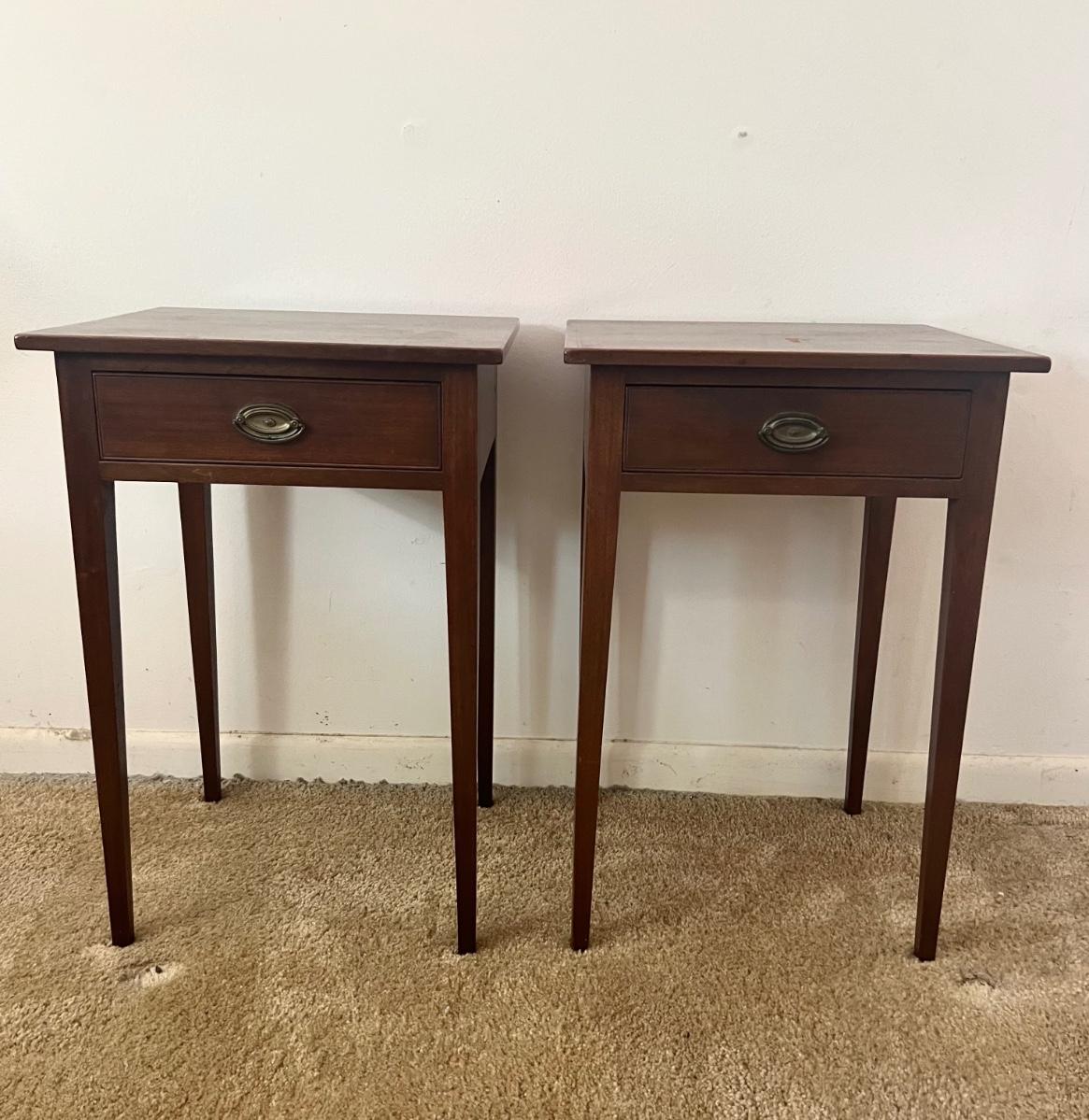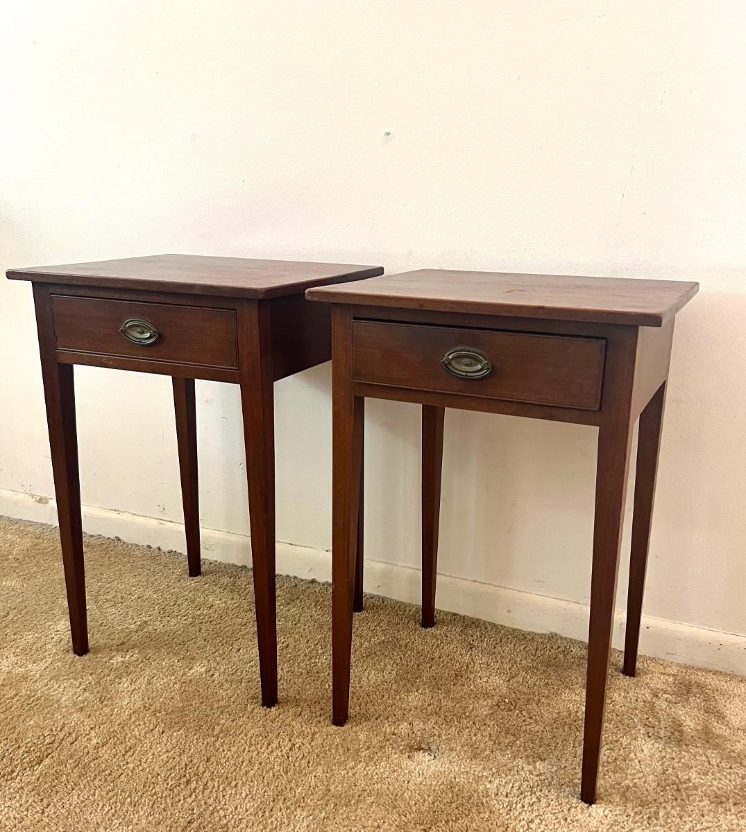 Pair Of Wooden Night stands, each has one drawer. Measures 27 inches tall, 16 inches deep and 18 inches long. One night stand has an imperfection. See pictures.