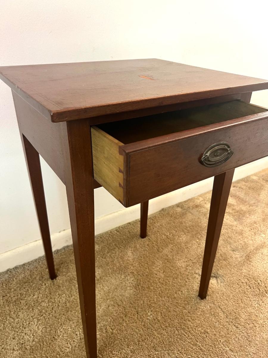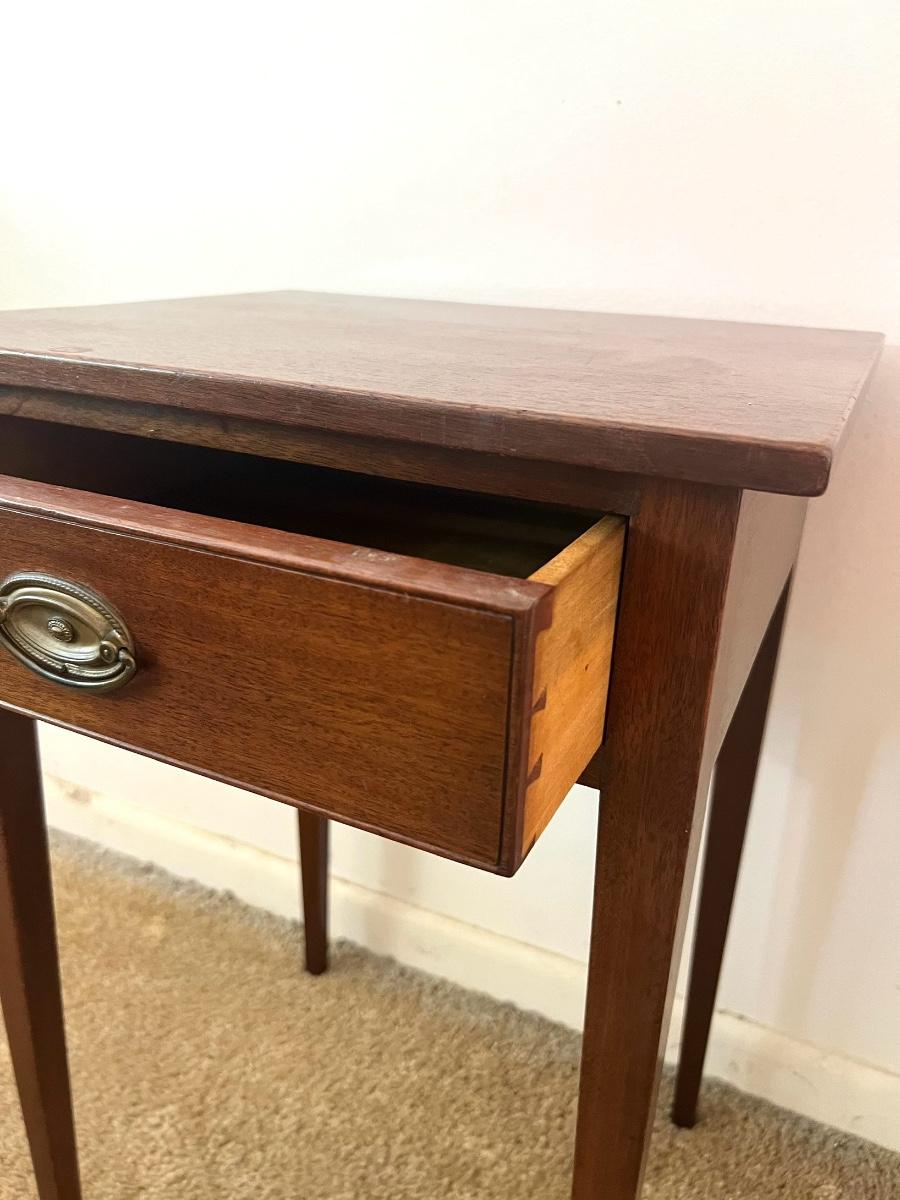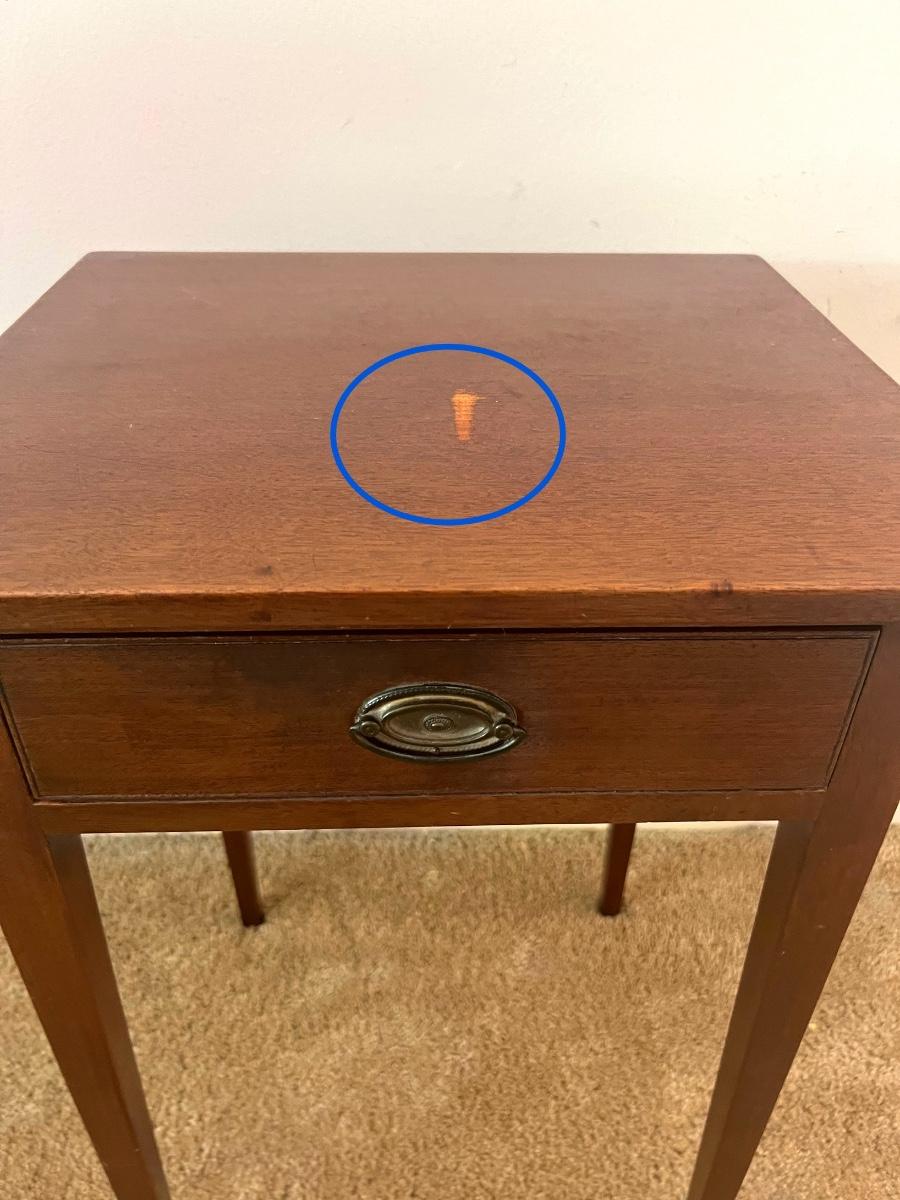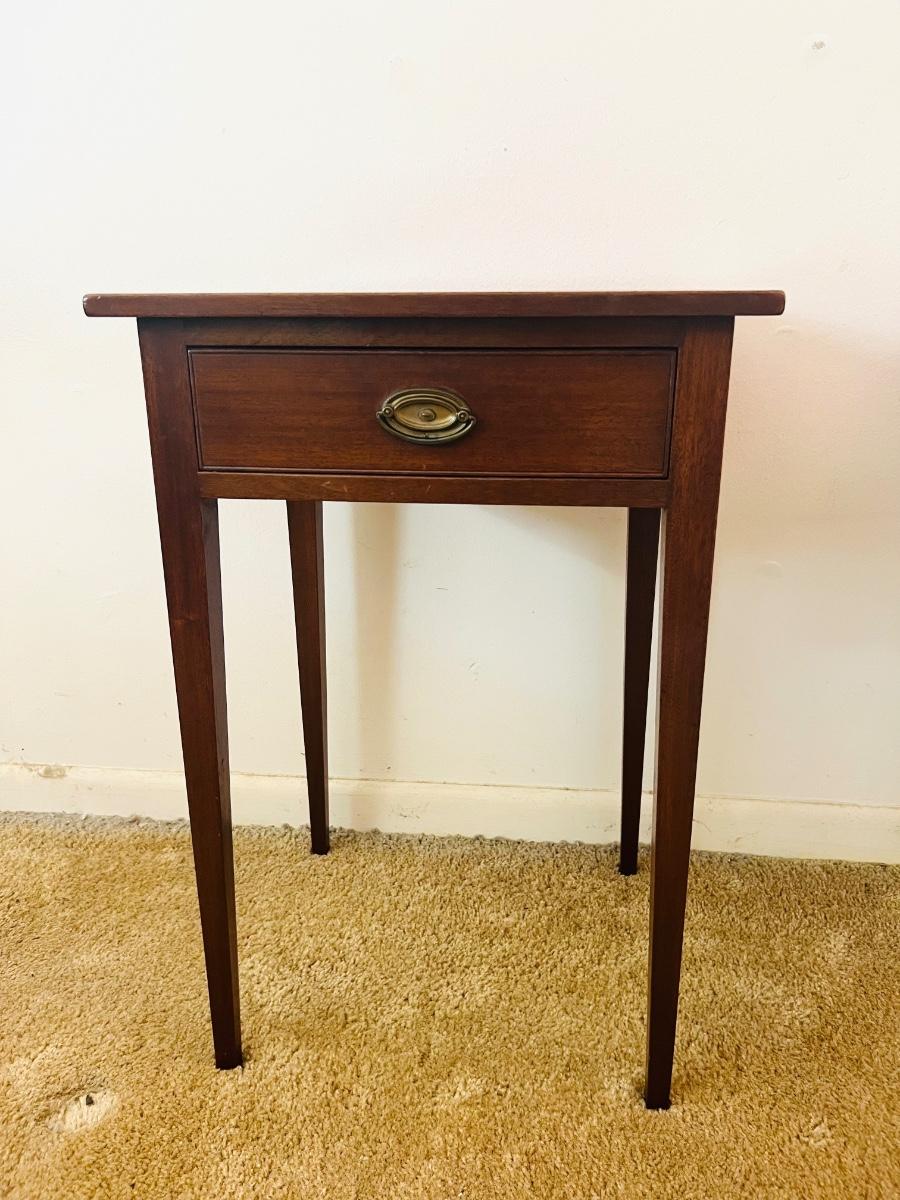 Pair Of Wooden Night stands, each has one drawer. Measures 27 inches tall, 16 inches deep and 18 inches long. One night stand has an imperfection. See pictures.