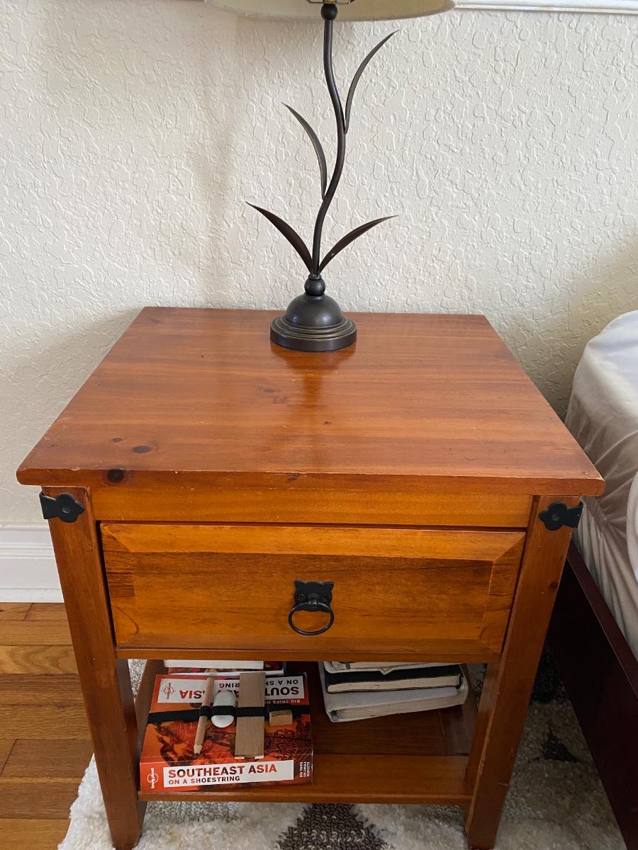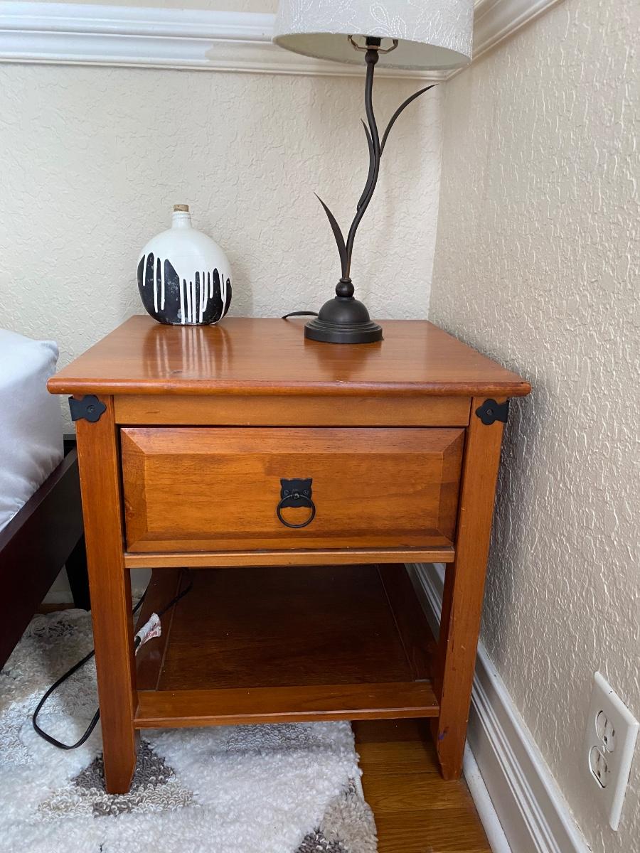 Pair of wooden nightstands with drawer and shelf. Approx 20w x 18d x 22h. Very good condition