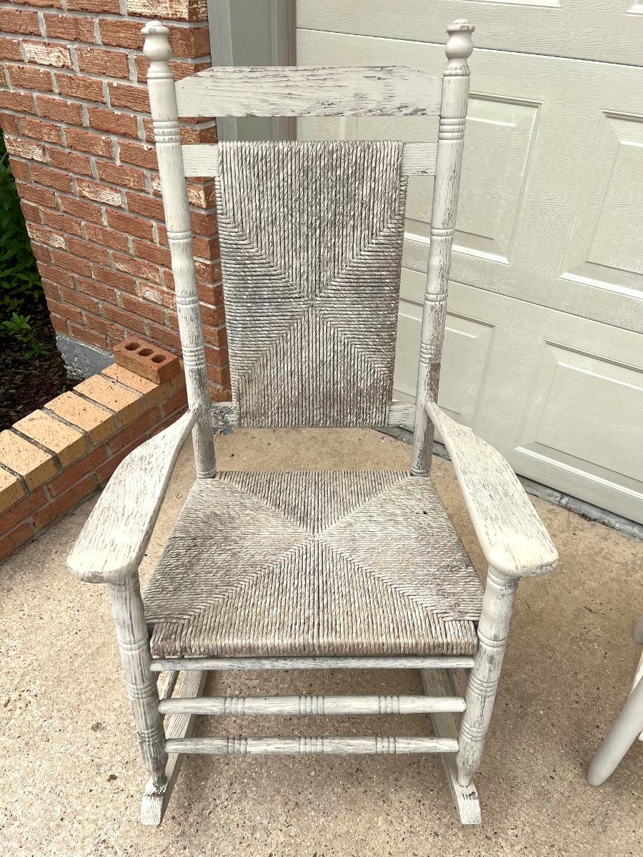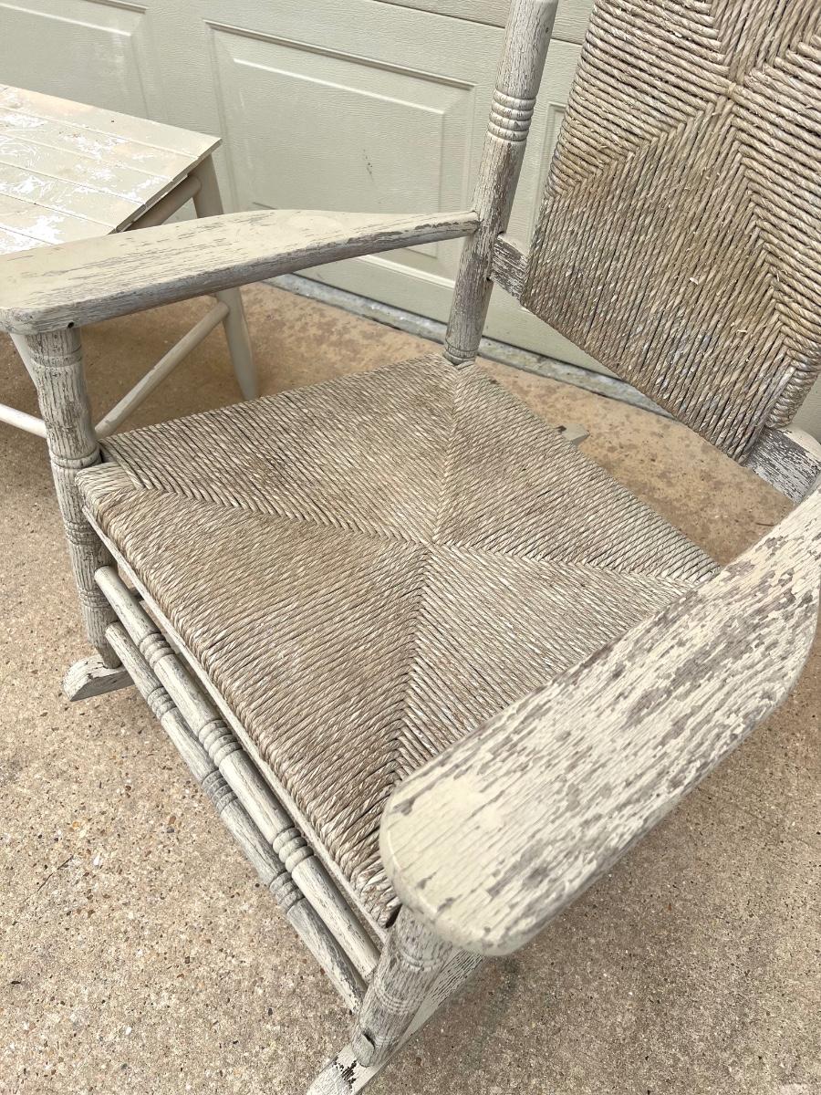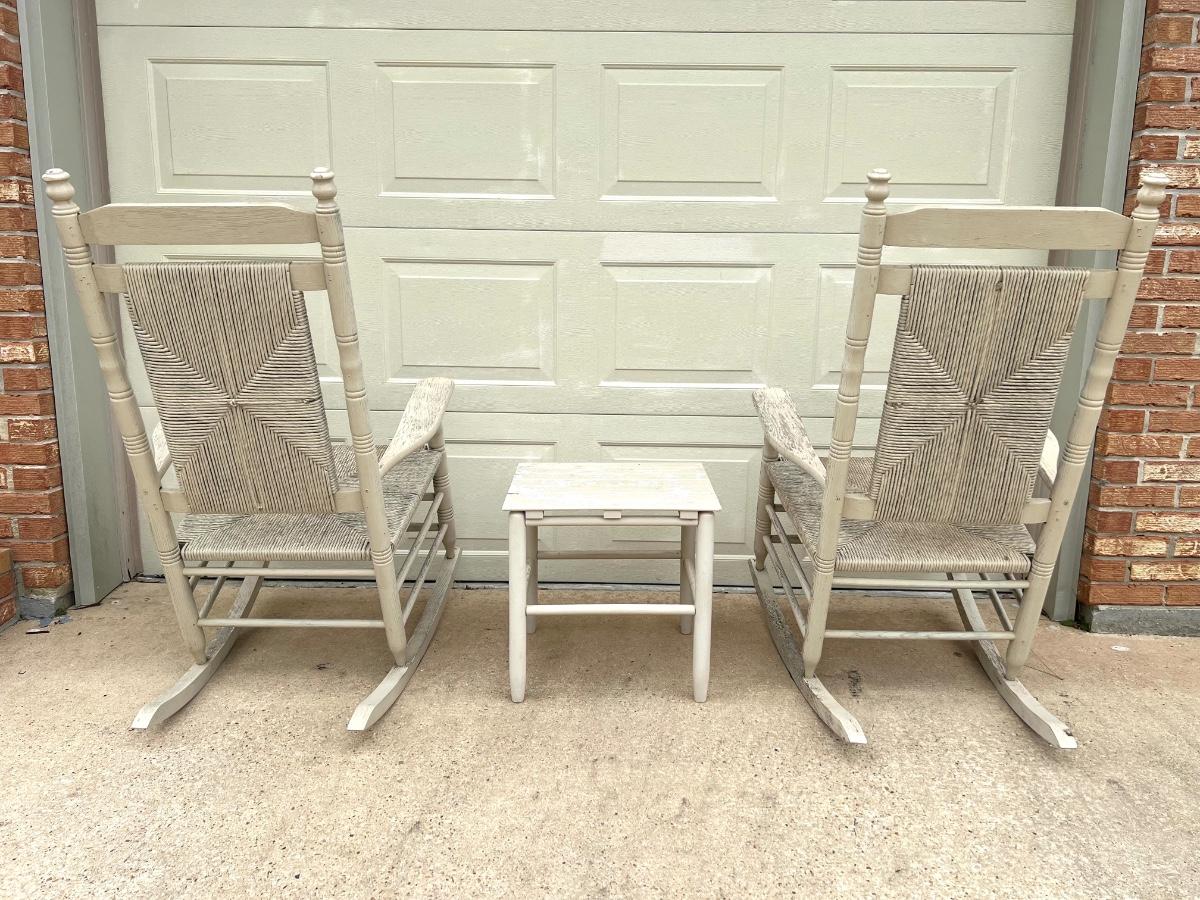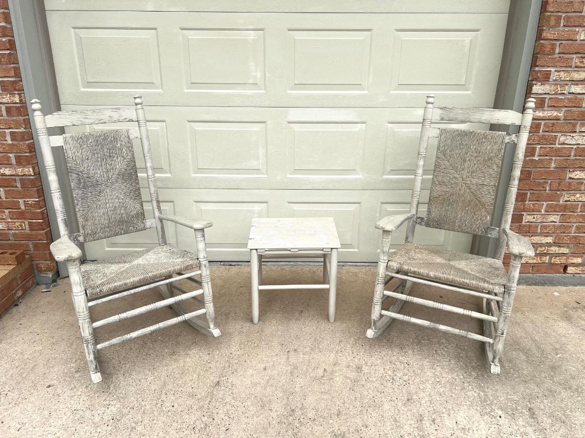 Paint is peeling on all but the set is very solid. No loose parts. Heavy and solid. See pictures for condition. Rockers measure 26”W, 46”T on the back and 20”T from ground to seat. Table measures 19” x 16” x 10”T.