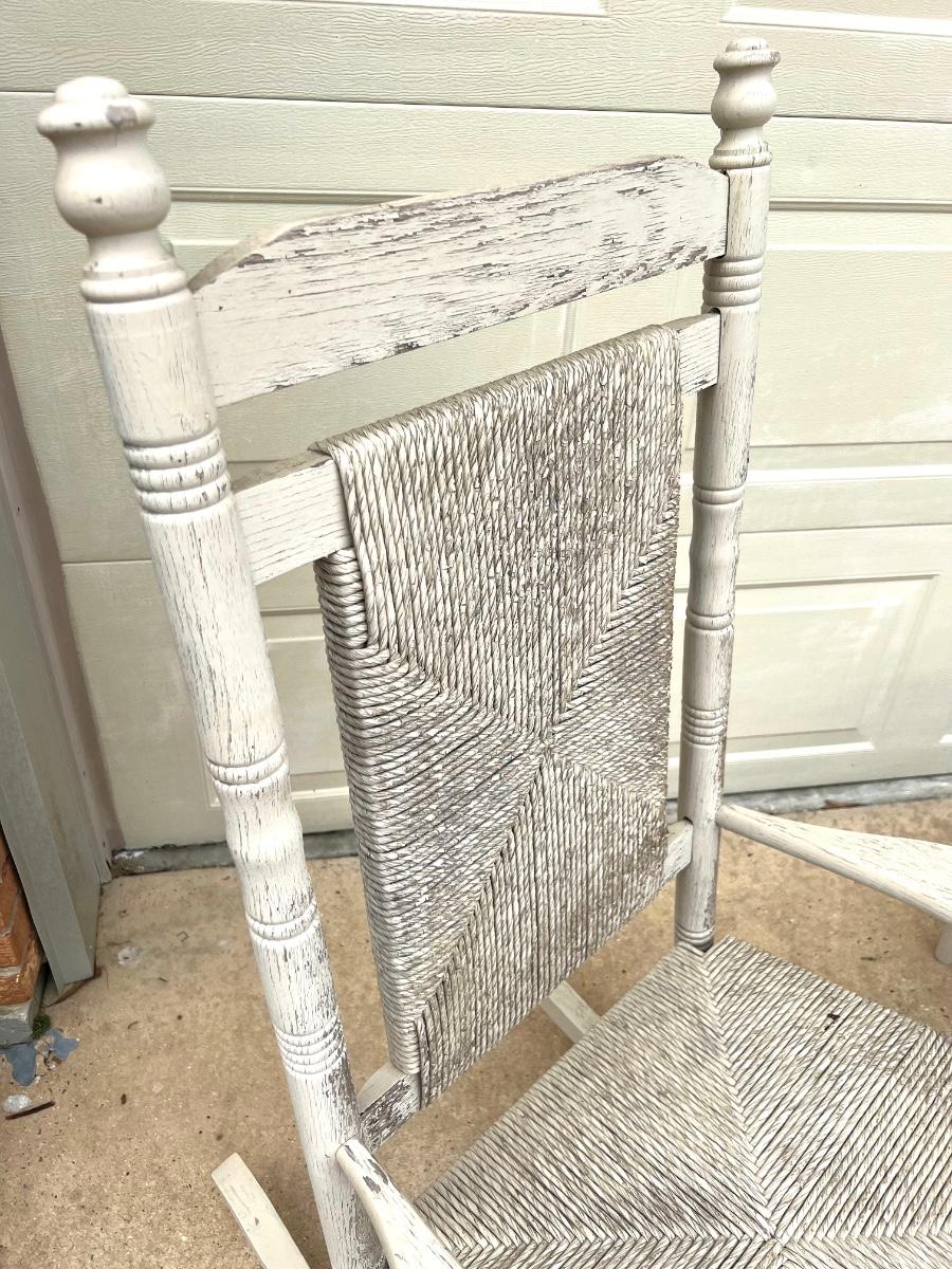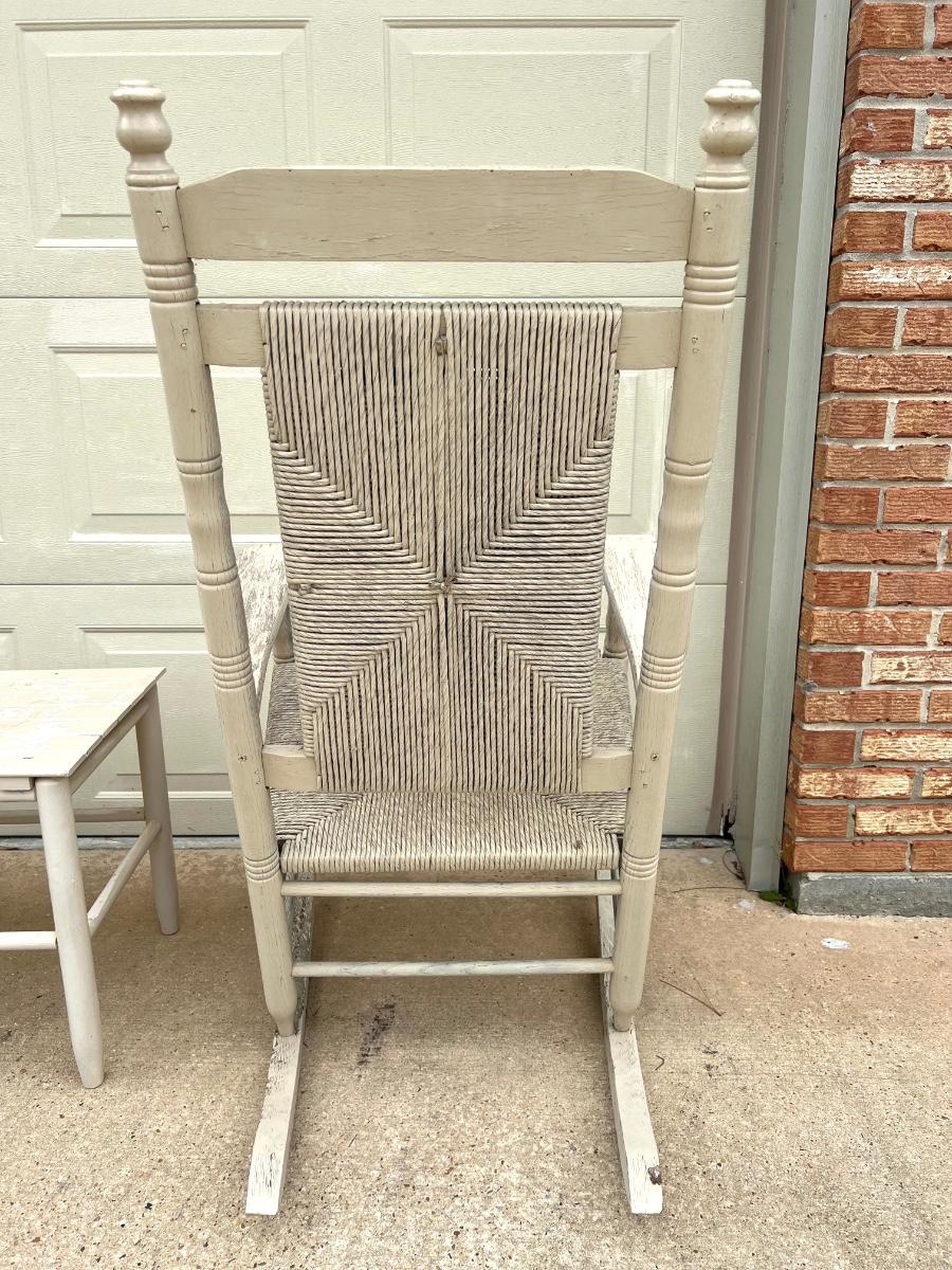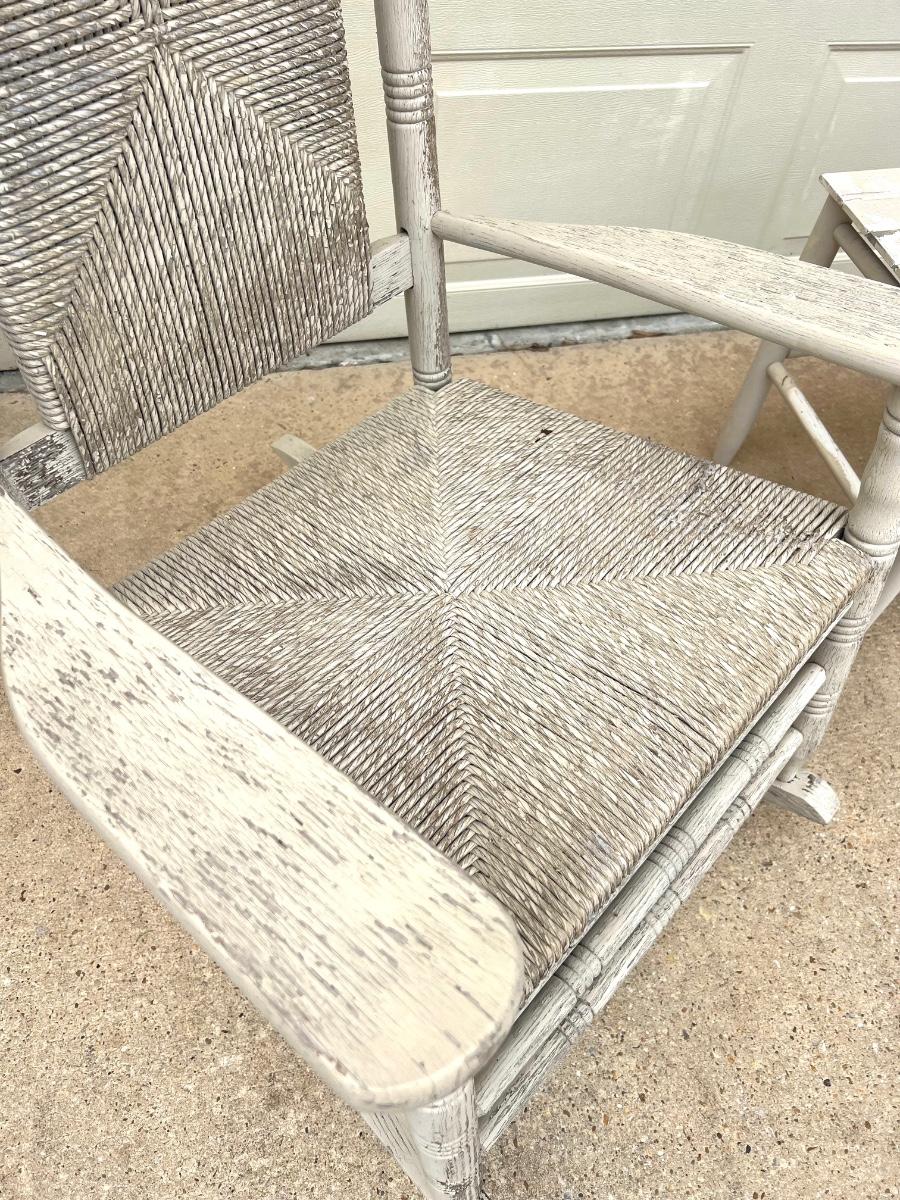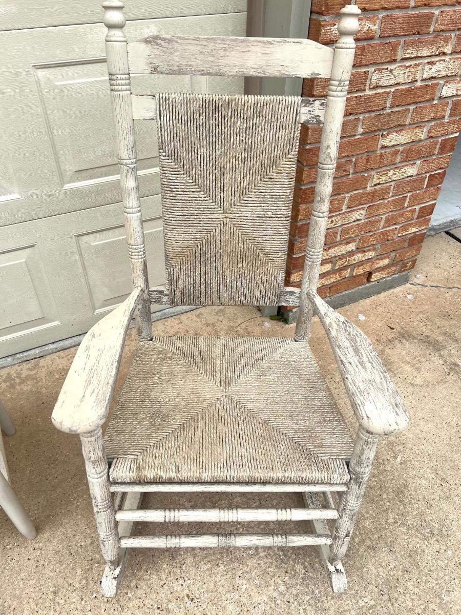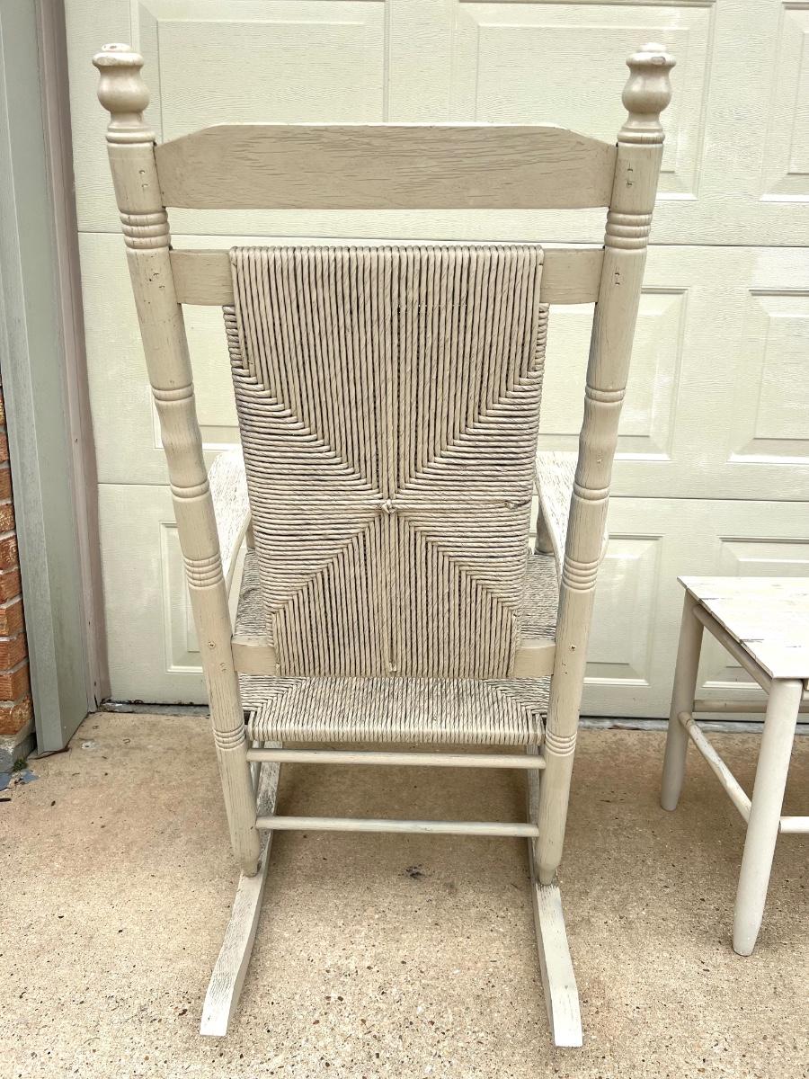 Paint is peeling on all but the set is very solid. No loose parts. Heavy and solid. See pictures for condition. Rockers measure 26”W, 46”T on the back and 20”T from ground to seat. Table measures 19” x 16” x 10”T.