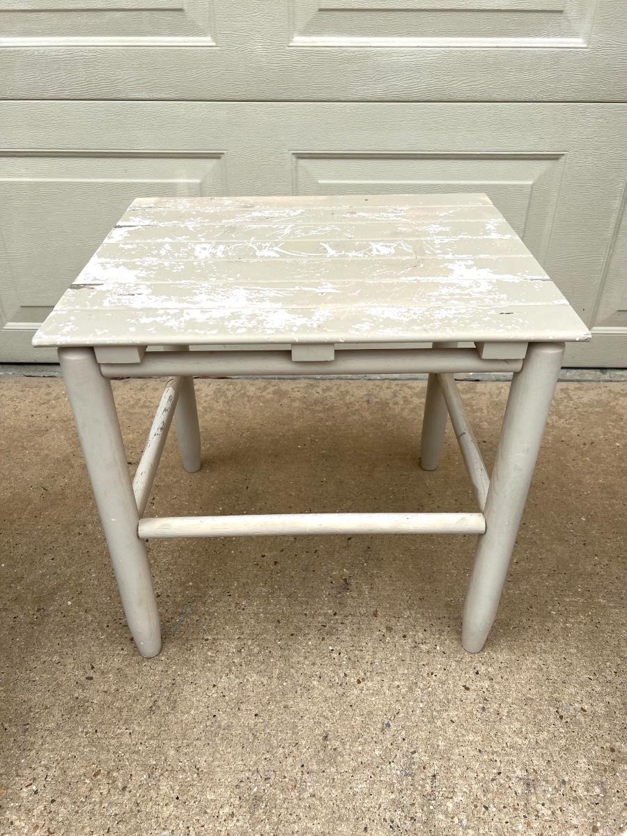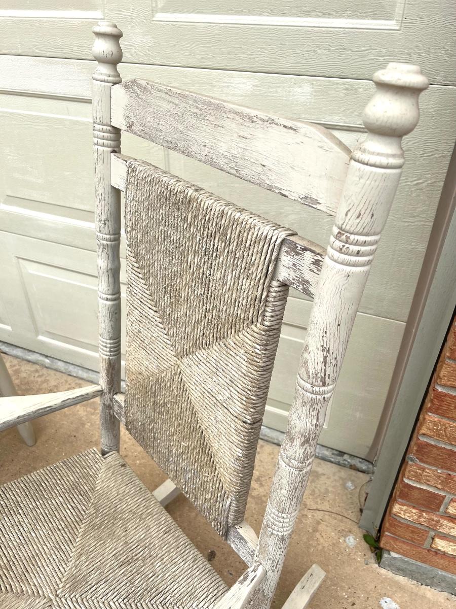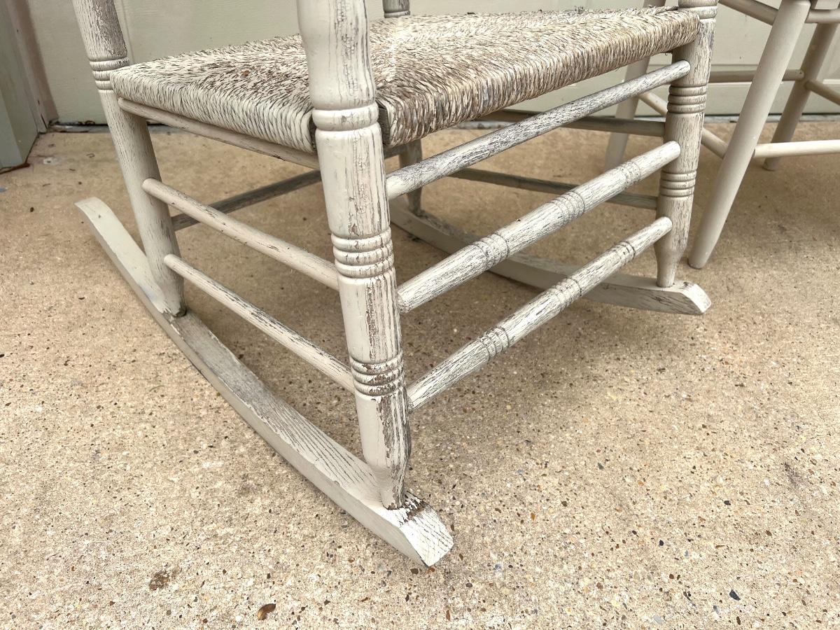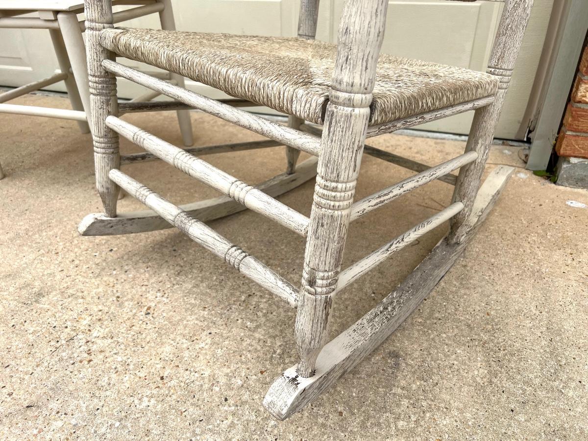Paint is peeling on all but the set is very solid. No loose parts. Heavy and solid. See pictures for condition. Rockers measure 26”W, 46”T on the back and 20”T from ground to seat. Table measures 19” x 16” x 10”T.