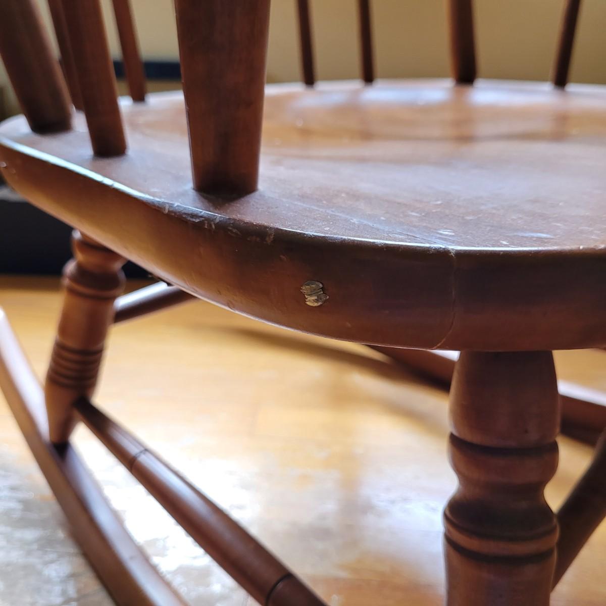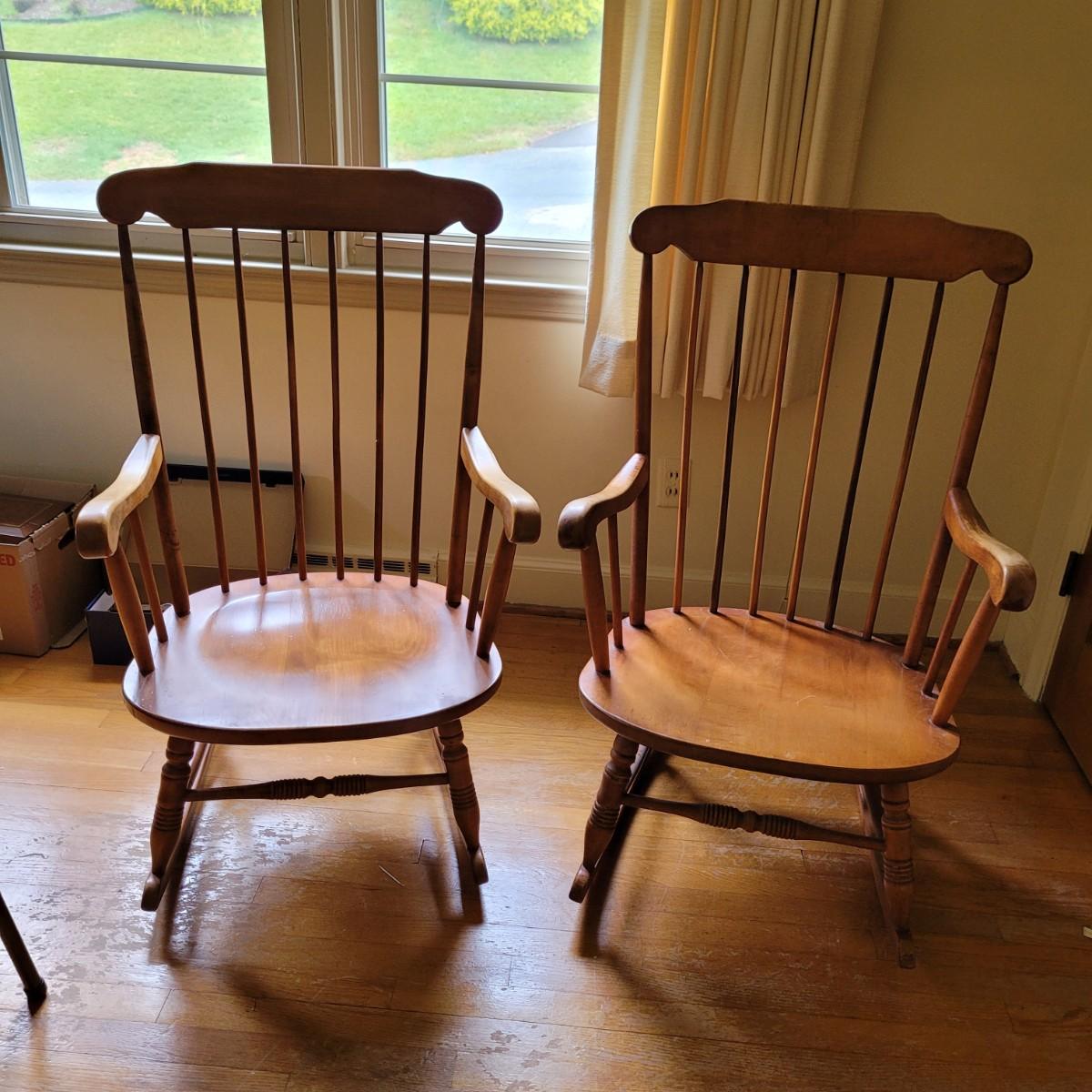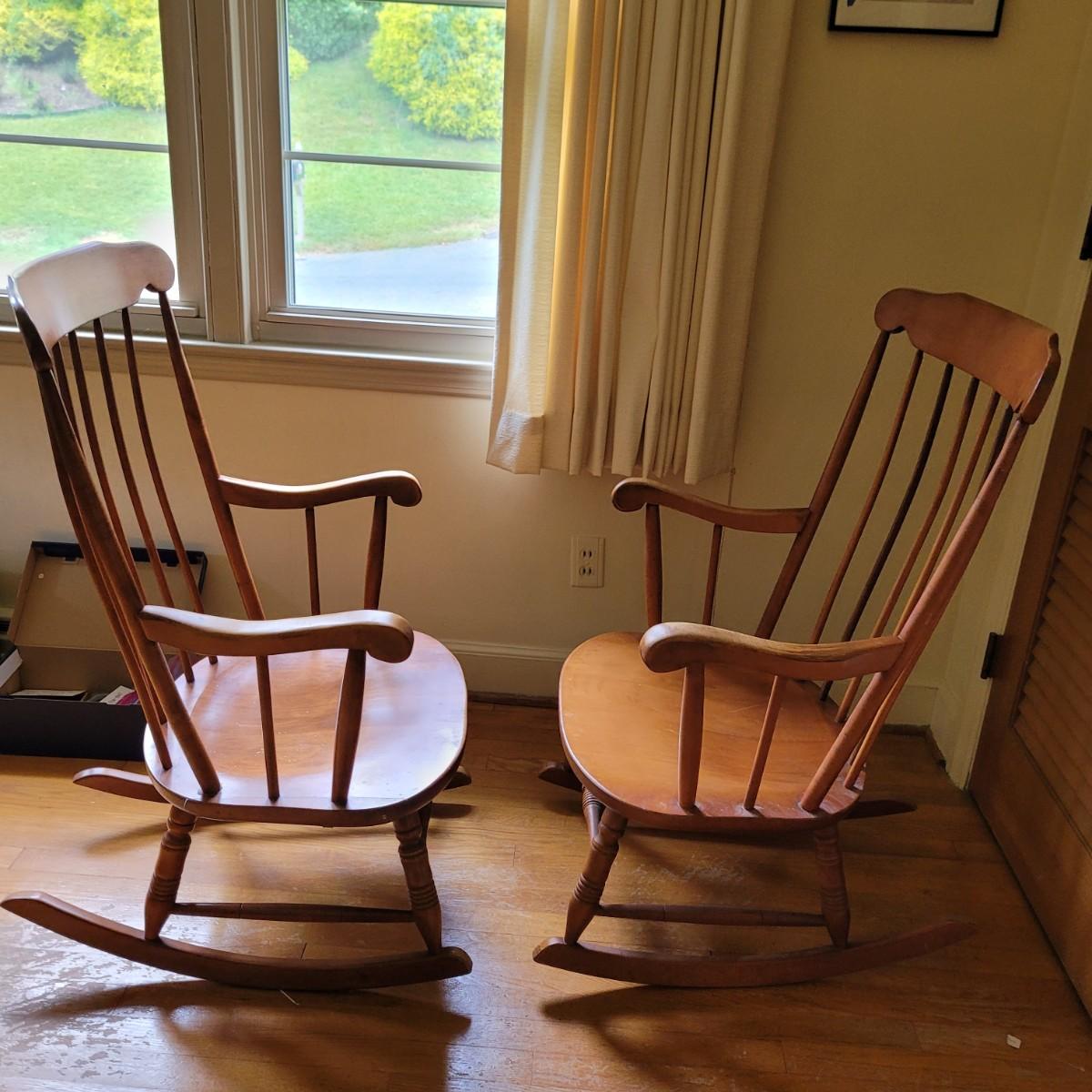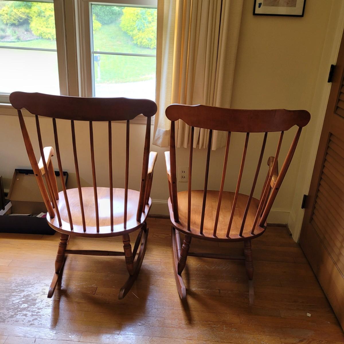 Pair of solid wood rocking chairs. Both chairs are sturdy, with no loose pieces. There are some scuffs and scratches present, (see photos). Chairs measure approximately 25"L x28"W x40"H, seat height 14"H. Local pickup only.