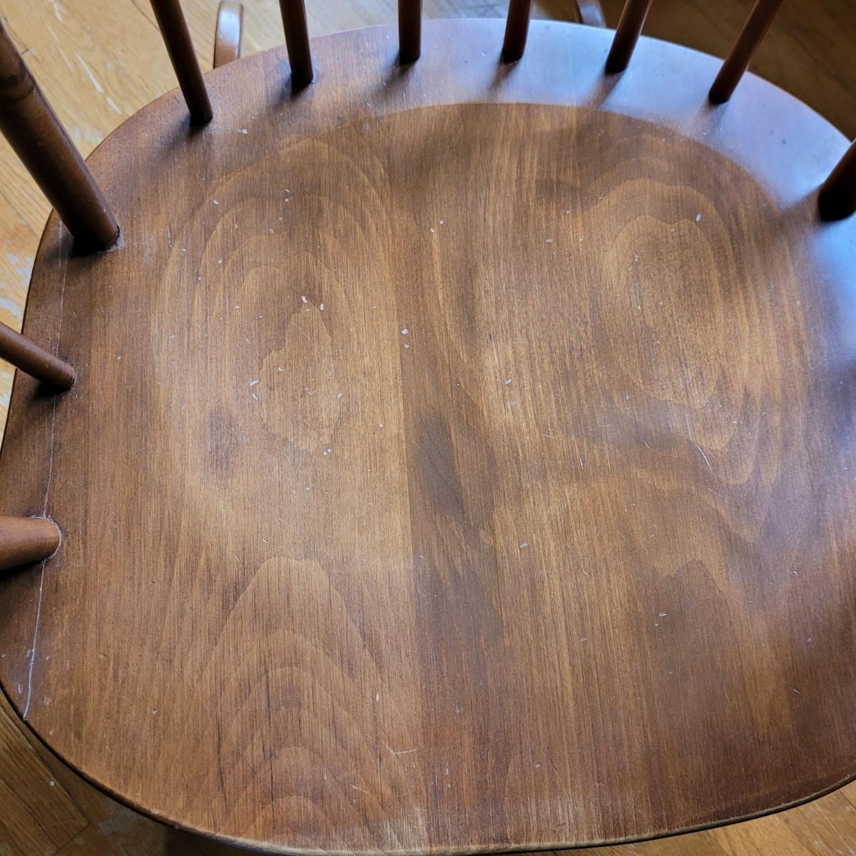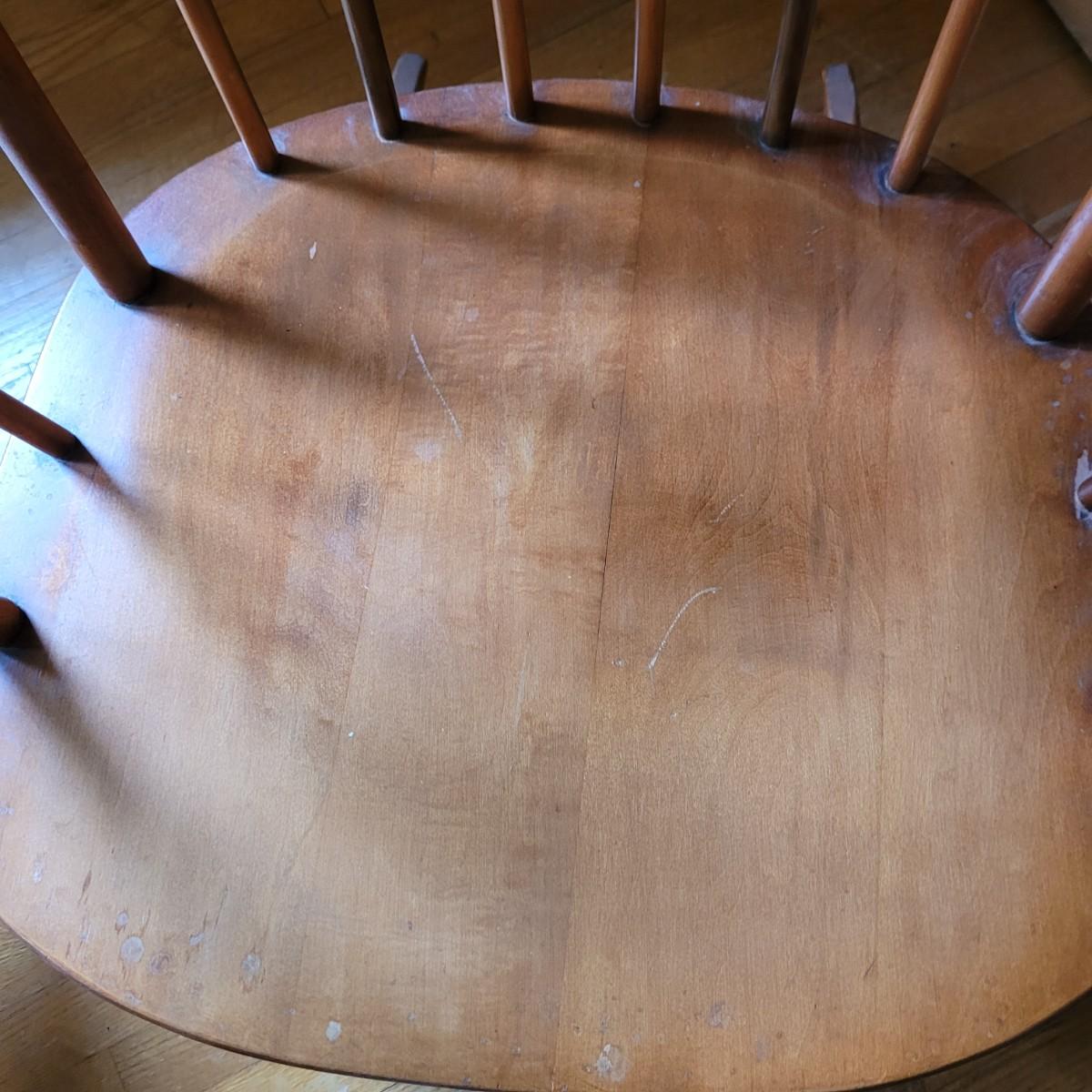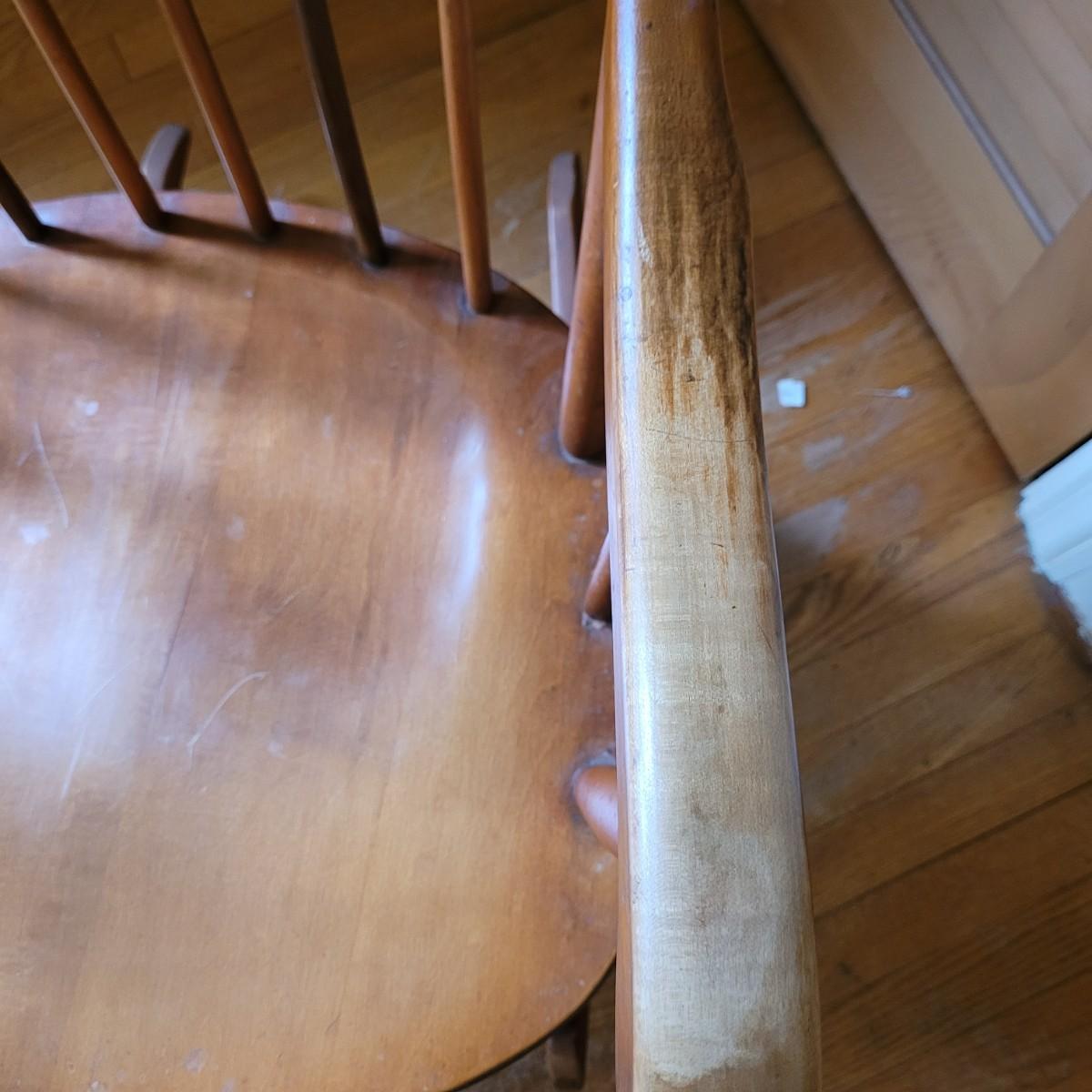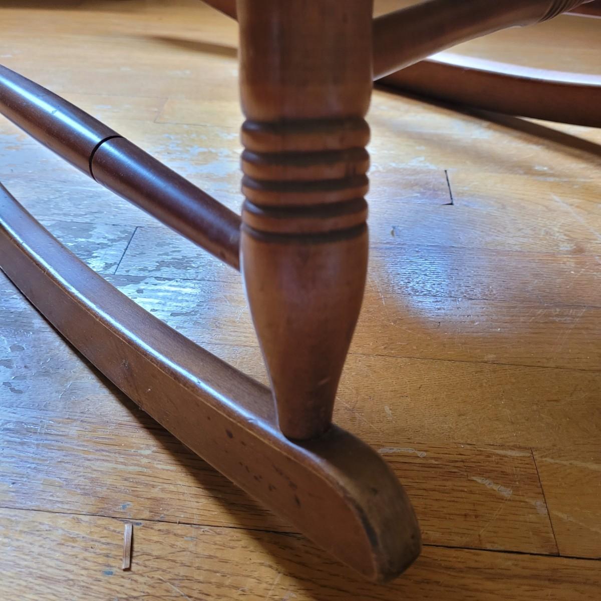 Pair of solid wood rocking chairs. Both chairs are sturdy, with no loose pieces. There are some scuffs and scratches present, (see photos). Chairs measure approximately 25"L x28"W x40"H, seat height 14"H. Local pickup only.