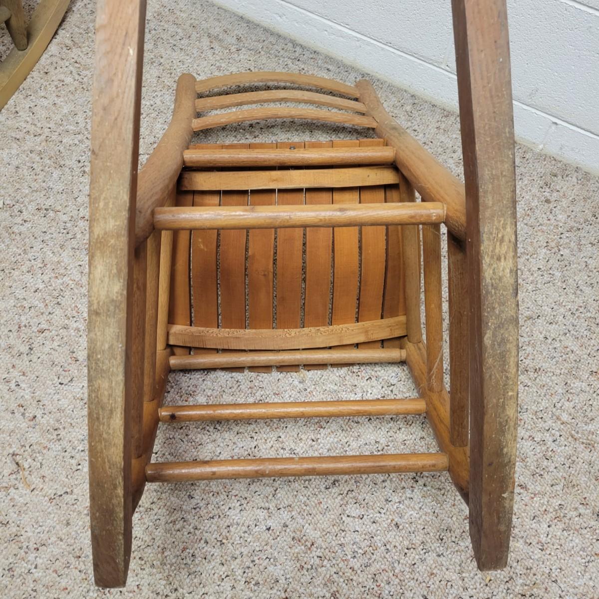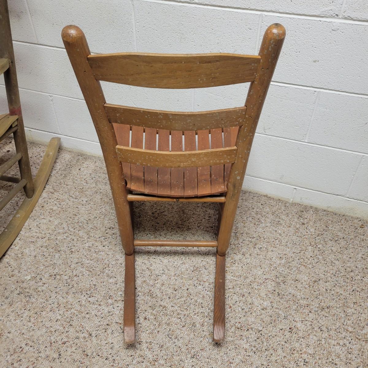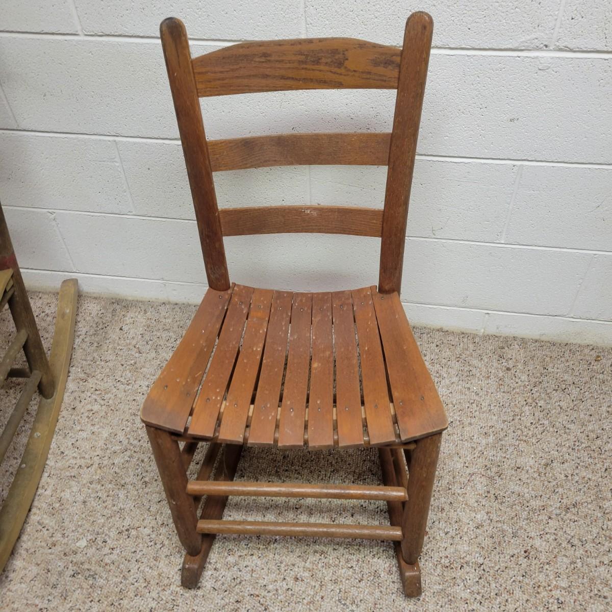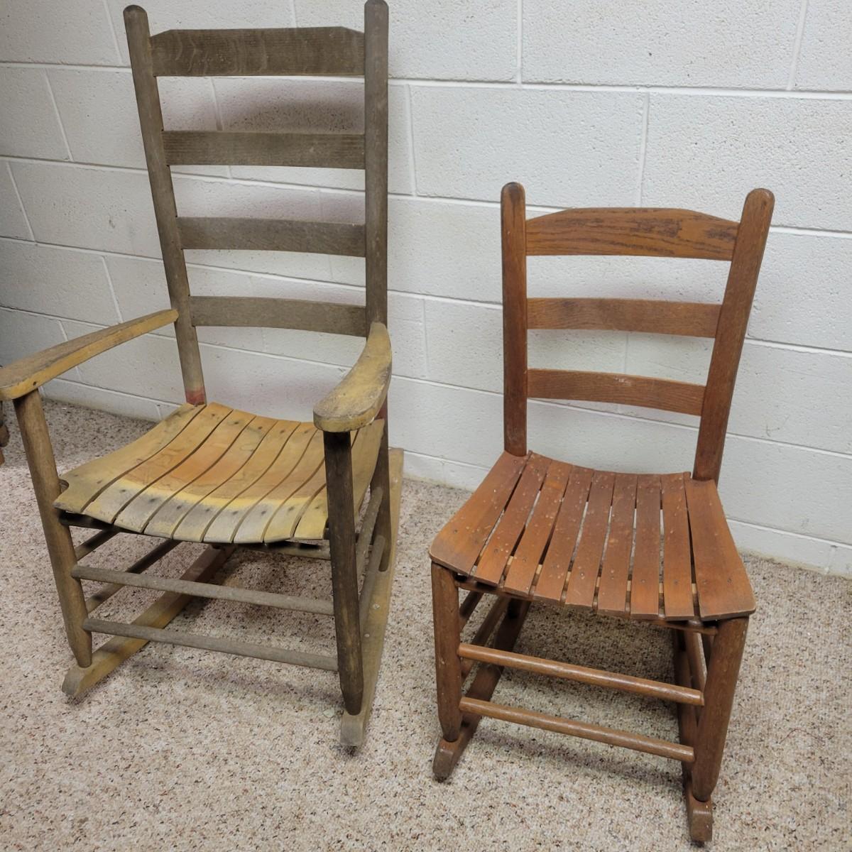 Two wooden rocking chairs in good condition, but with some fading and blemishes due to age. Included is a small rocking chair that appears to be made of oak and measures approximately 17" x 26" x 32.5" with a seat height of 15.5". The larger rocking chair also appears to be made of oak and most of its original stain has faded. It measures approximately 24" x 30" x 42" with a seat height of 16". Local pickup only