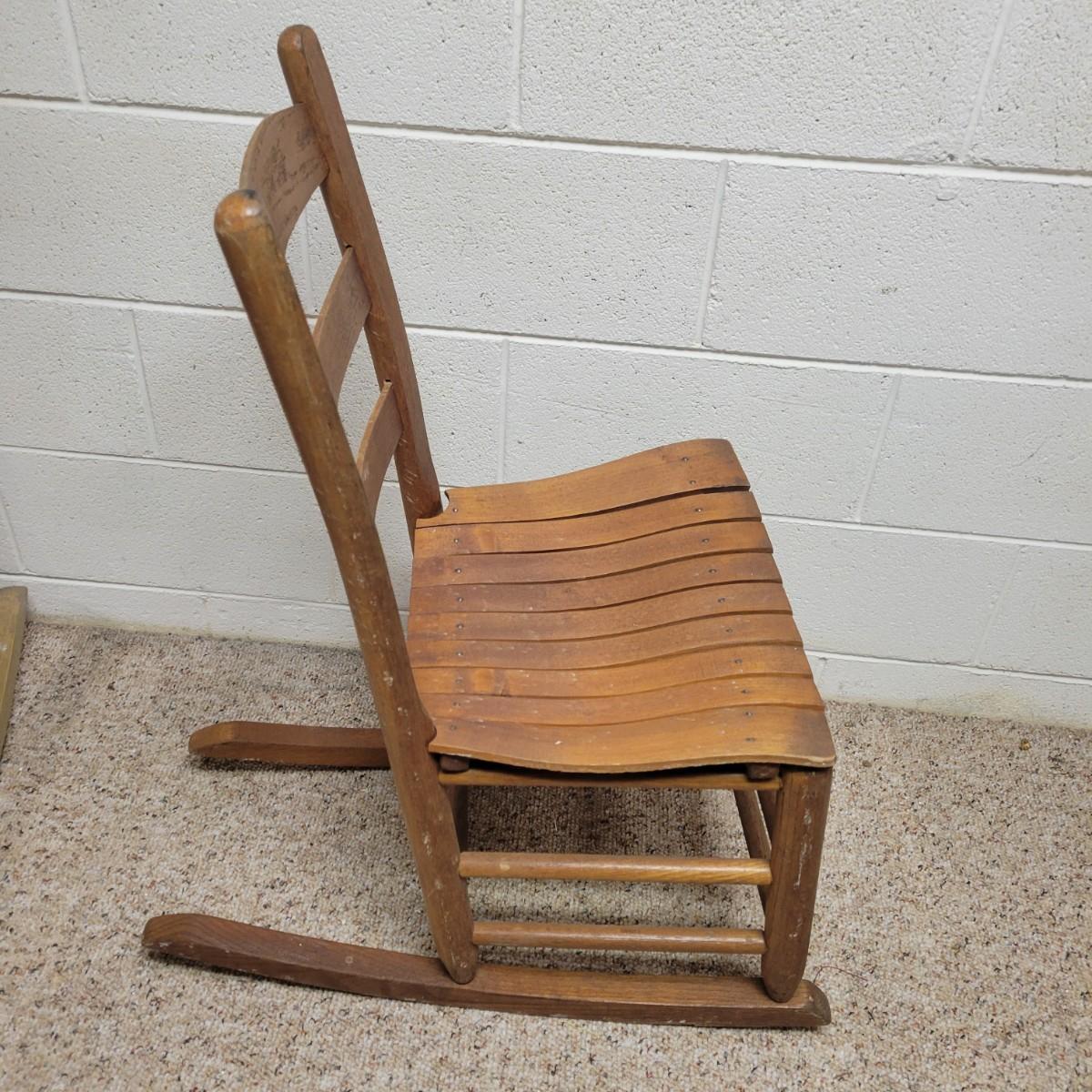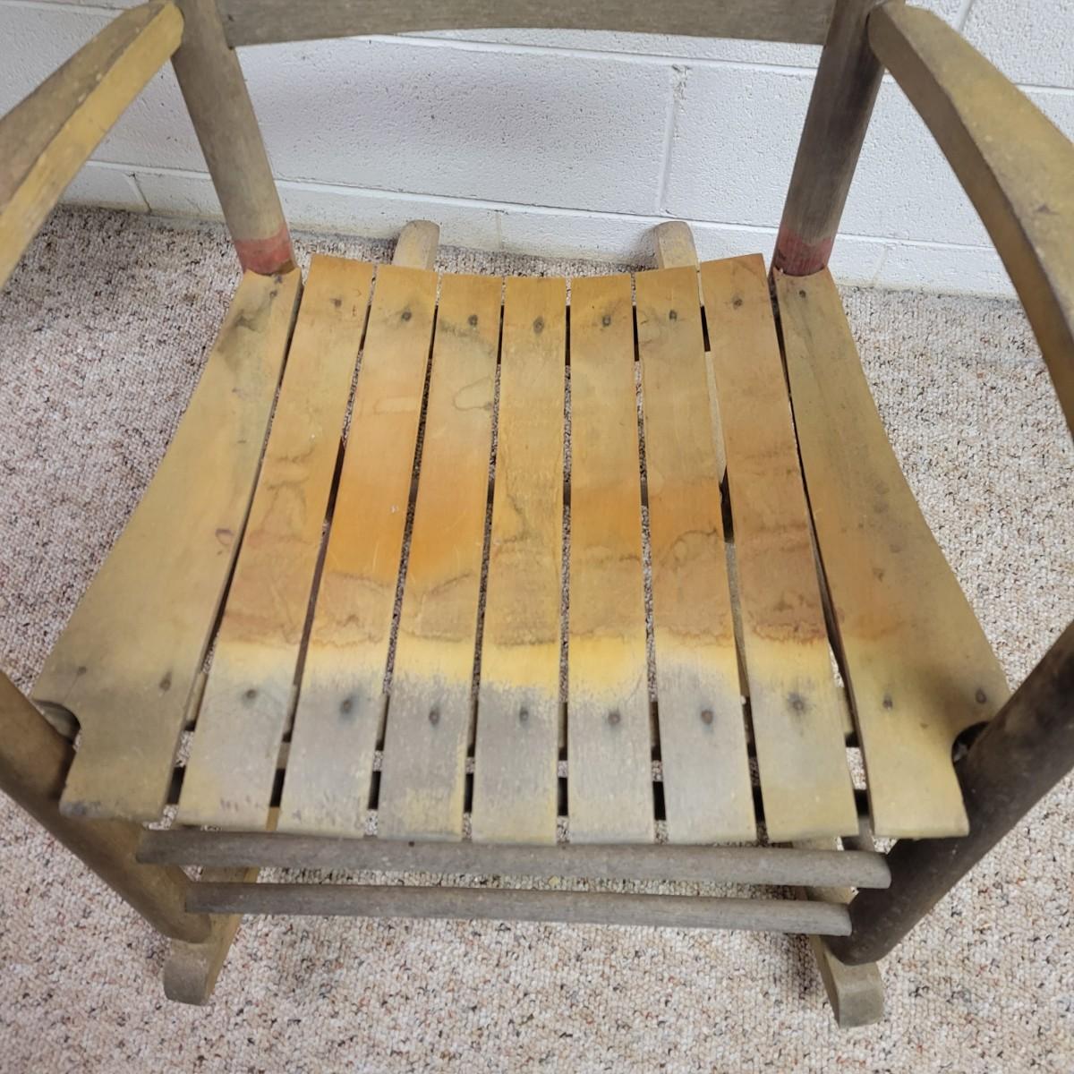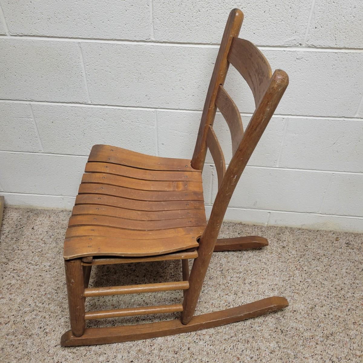 Two wooden rocking chairs in good condition, but with some fading and blemishes due to age. Included is a small rocking chair that appears to be made of oak and measures approximately 17" x 26" x 32.5" with a seat height of 15.5". The larger rocking chair also appears to be made of oak and most of its original stain has faded. It measures approximately 24" x 30" x 42" with a seat height of 16". Local pickup only