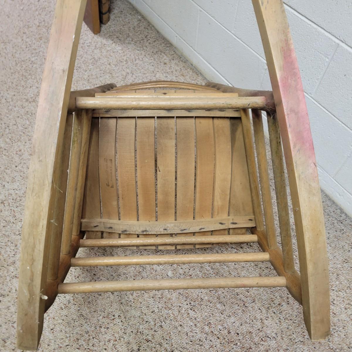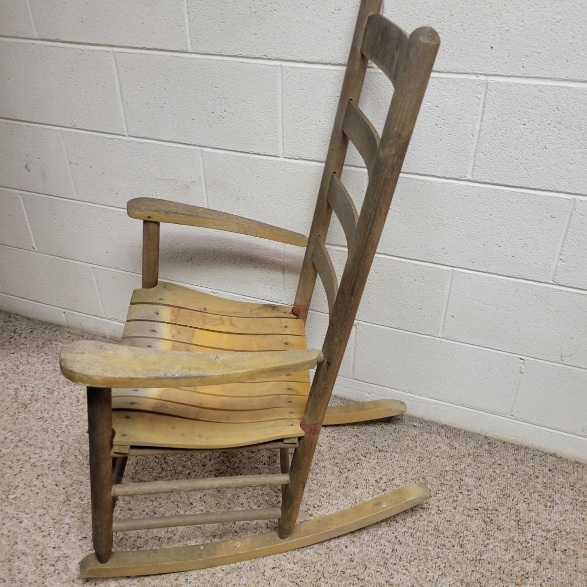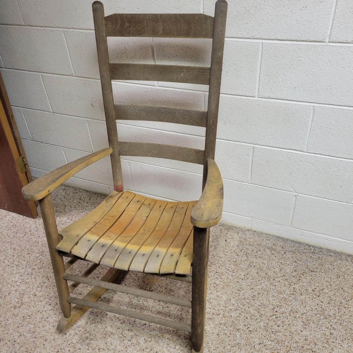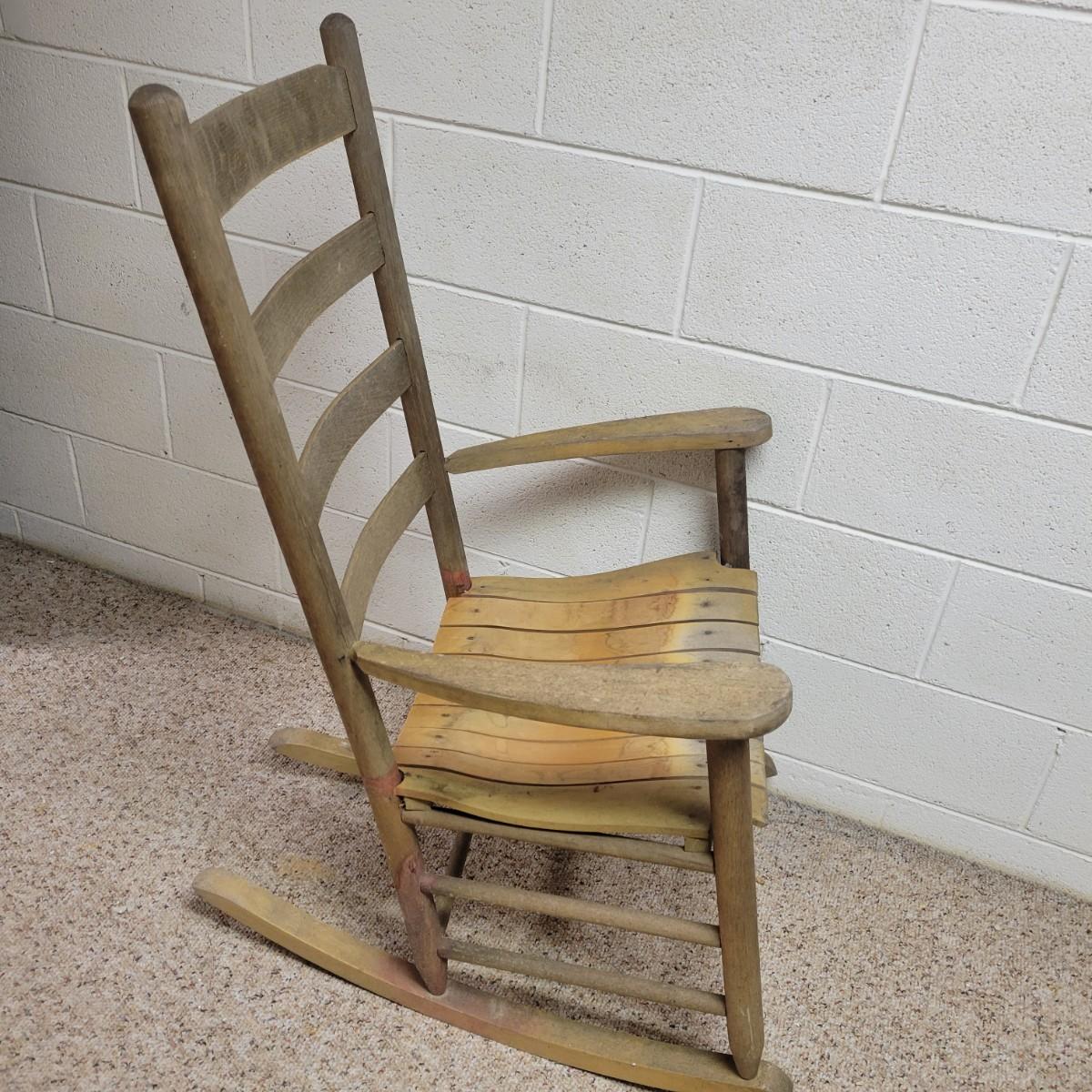 Two wooden rocking chairs in good condition, but with some fading and blemishes due to age. Included is a small rocking chair that appears to be made of oak and measures approximately 17" x 26" x 32.5" with a seat height of 15.5". The larger rocking chair also appears to be made of oak and most of its original stain has faded. It measures approximately 24" x 30" x 42" with a seat height of 16". Local pickup only