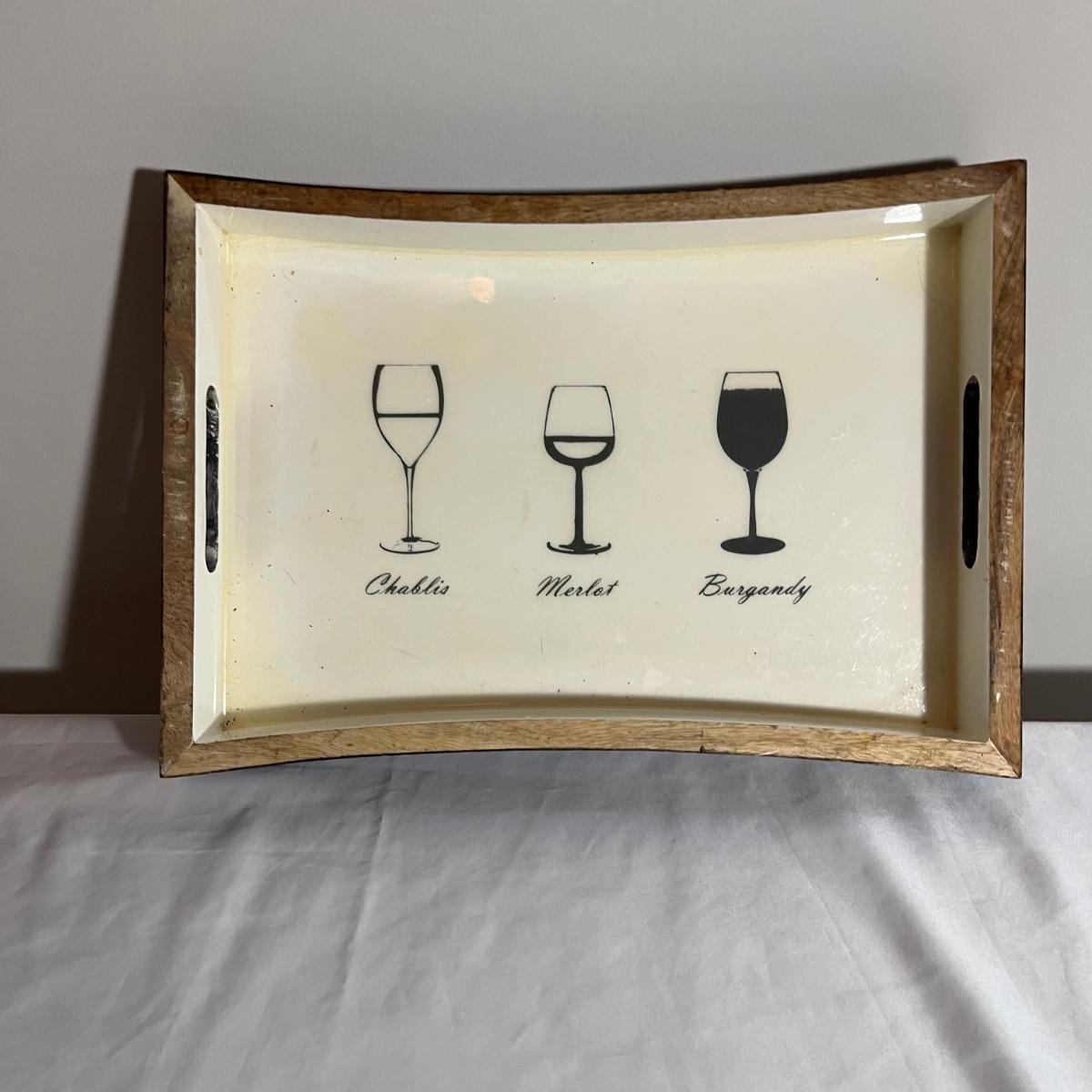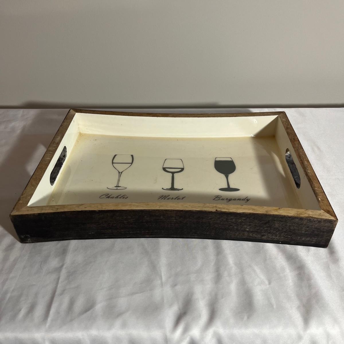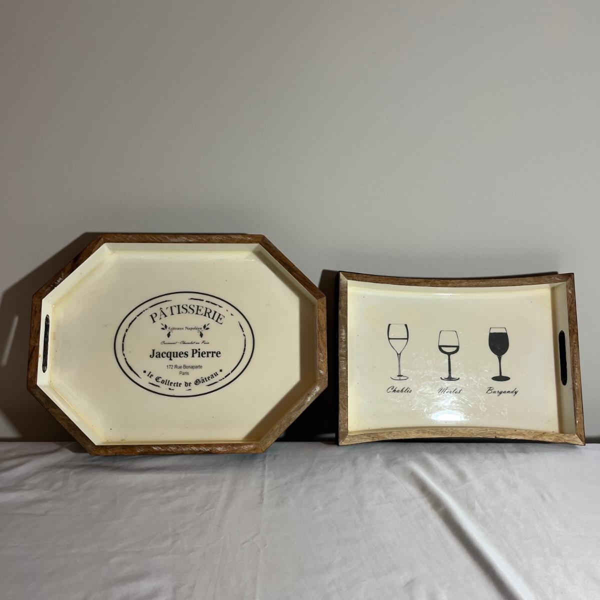 Lot includes a rectangular wooden tray with wine motif and a wooden tray with French bakery design. Both trays have a very smooth cream colored shiny paint like finish on their interiors. French bakery tray measures 12” x 16” x 2”.
