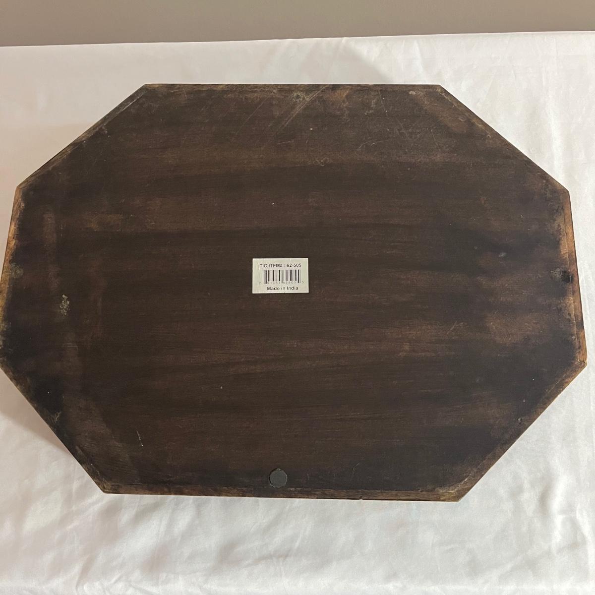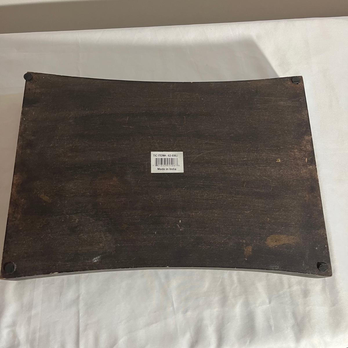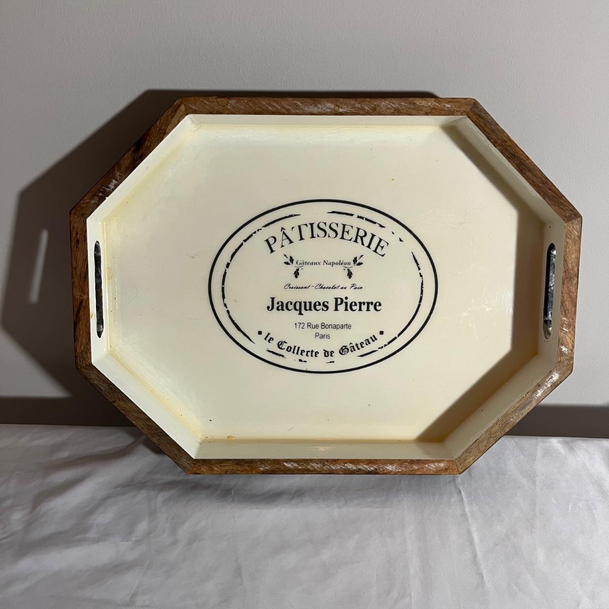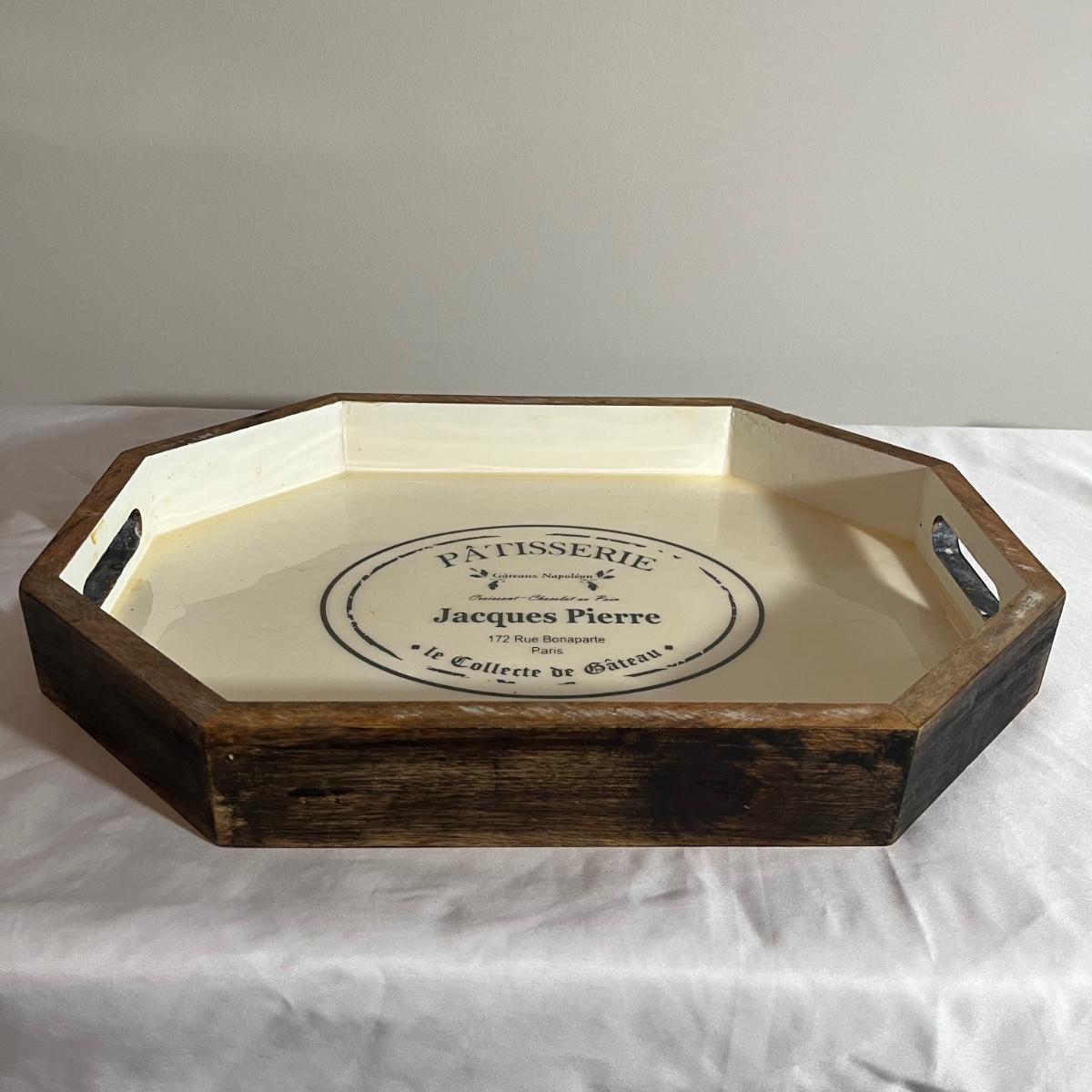 Lot includes a rectangular wooden tray with wine motif and a wooden tray with French bakery design. Both trays have a very smooth cream colored shiny paint like finish on their interiors. French bakery tray measures 12” x 16” x 2”.